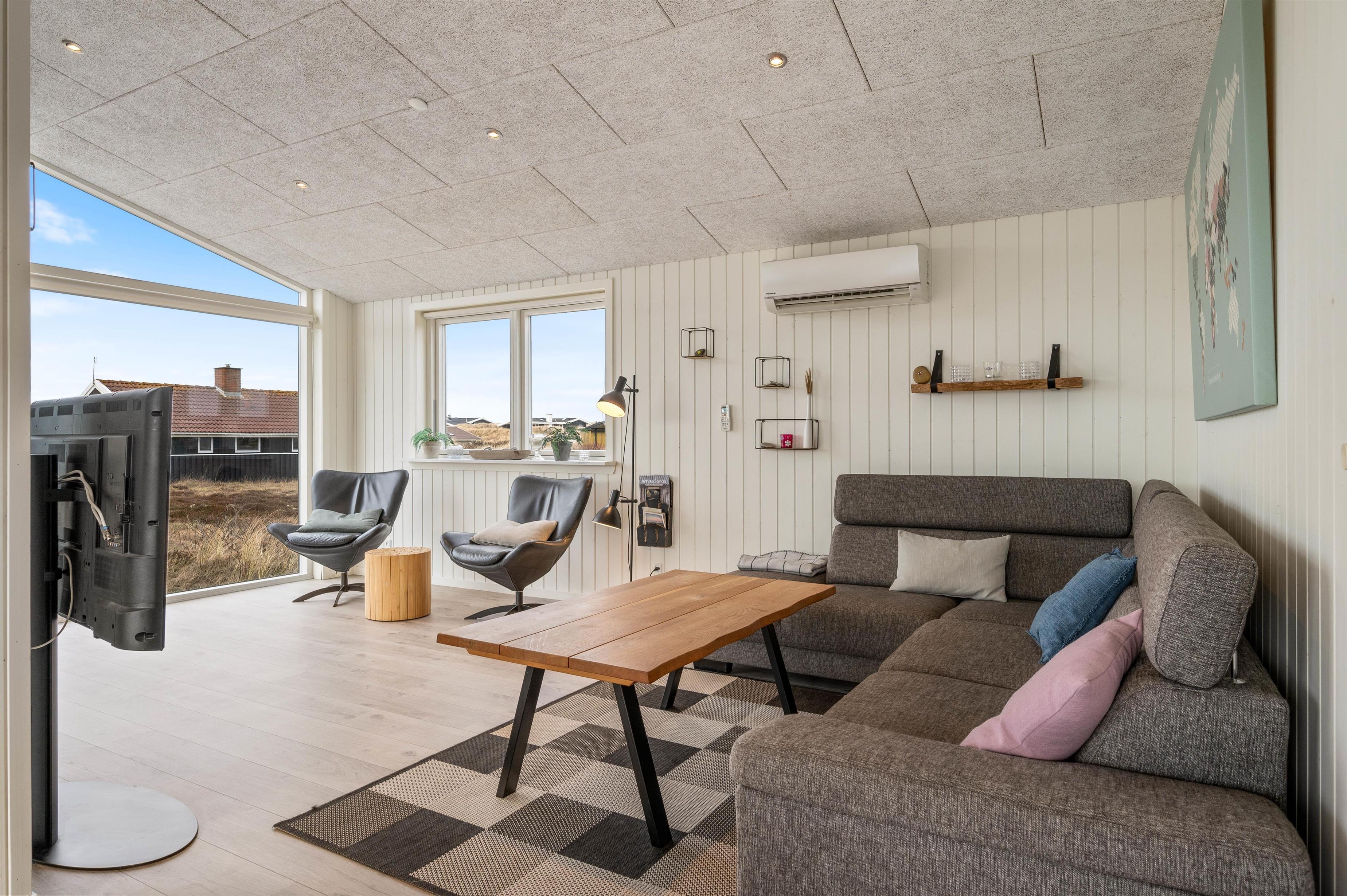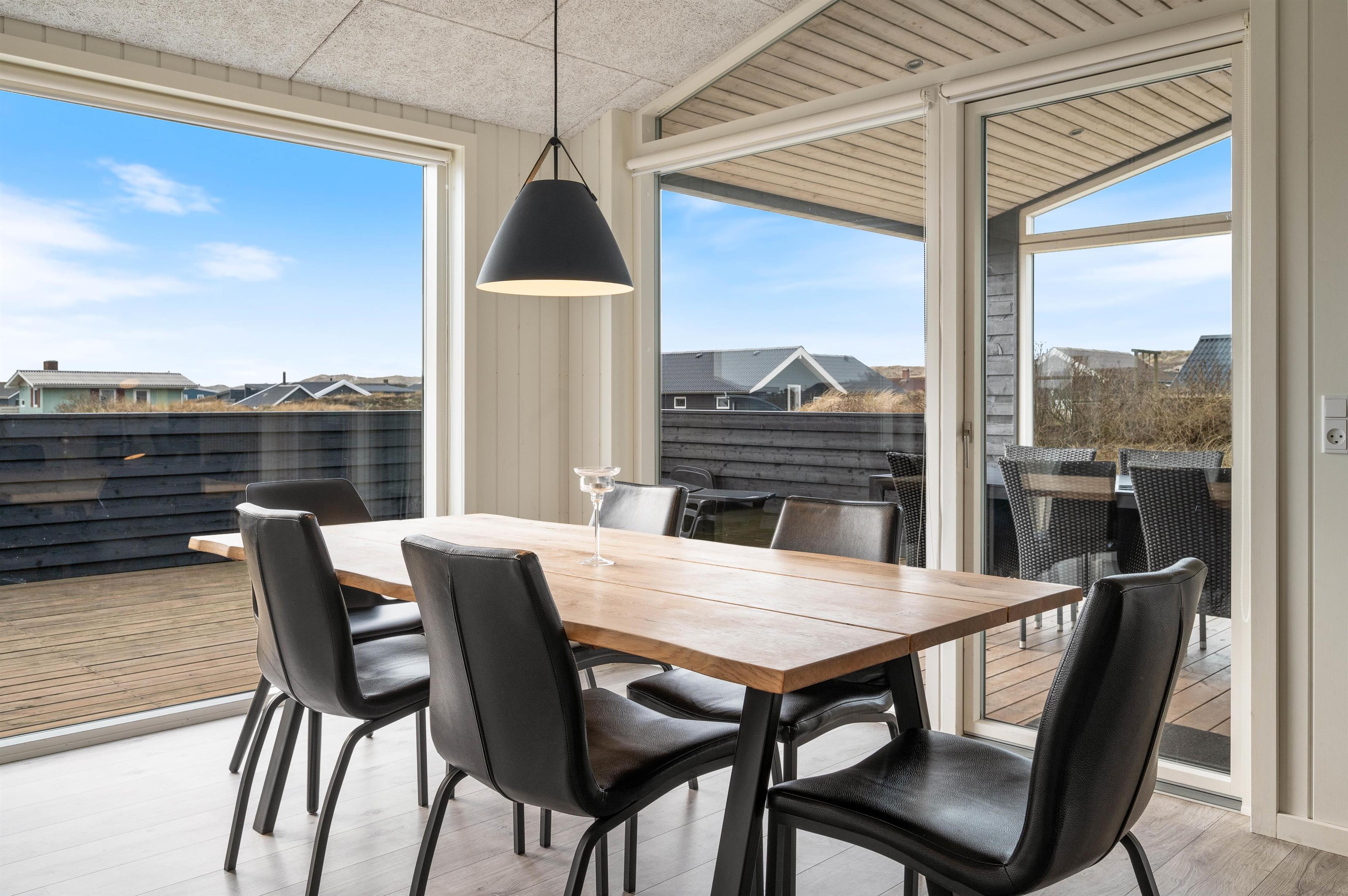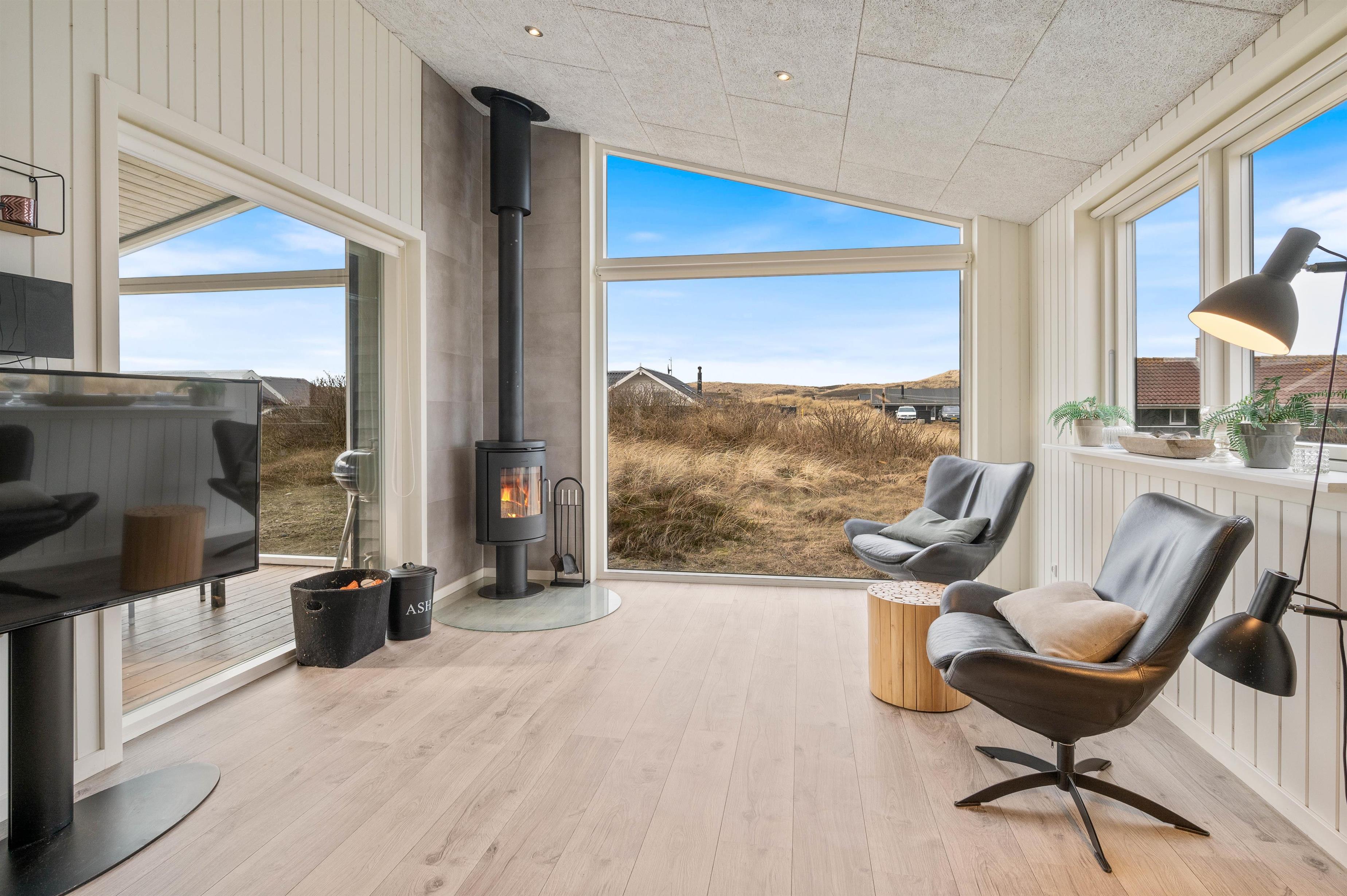 Den store terrasse har mange kvaliteter og er både lukket, delvist overdækket og delvist afskærmet med glasparti mod vest. Her kan I altid sidde i både læ og ly og nyde den friske luft og den flotte udsigt ud over klitlandskabet. Helt perfekt kan I lade småbørn og hunde bevæge sig frit rundt på terrassen. Til familiens mindste er der desuden også opsat et gyngestativ.