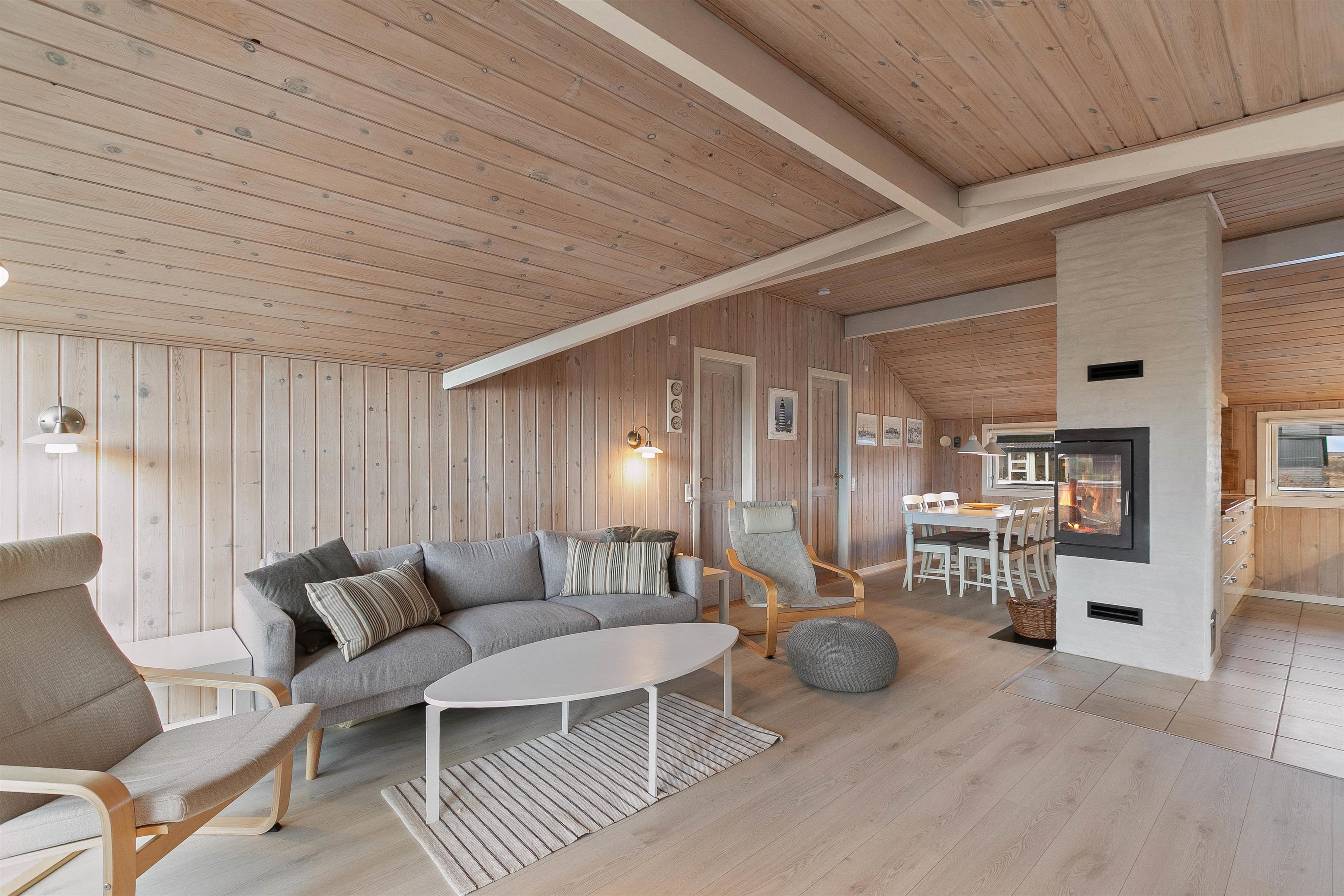 Indretningen er overalt holdt i lyse farver og hyggelig skandinavisk stil. På de køligere dage kan man nyde en spændende bog eller en god film – og tænde op i brændeovnen eller varmepumpen. TVét i stuen er et Apple TV, hvor du kan streame dine yndlingskanaler direkte.