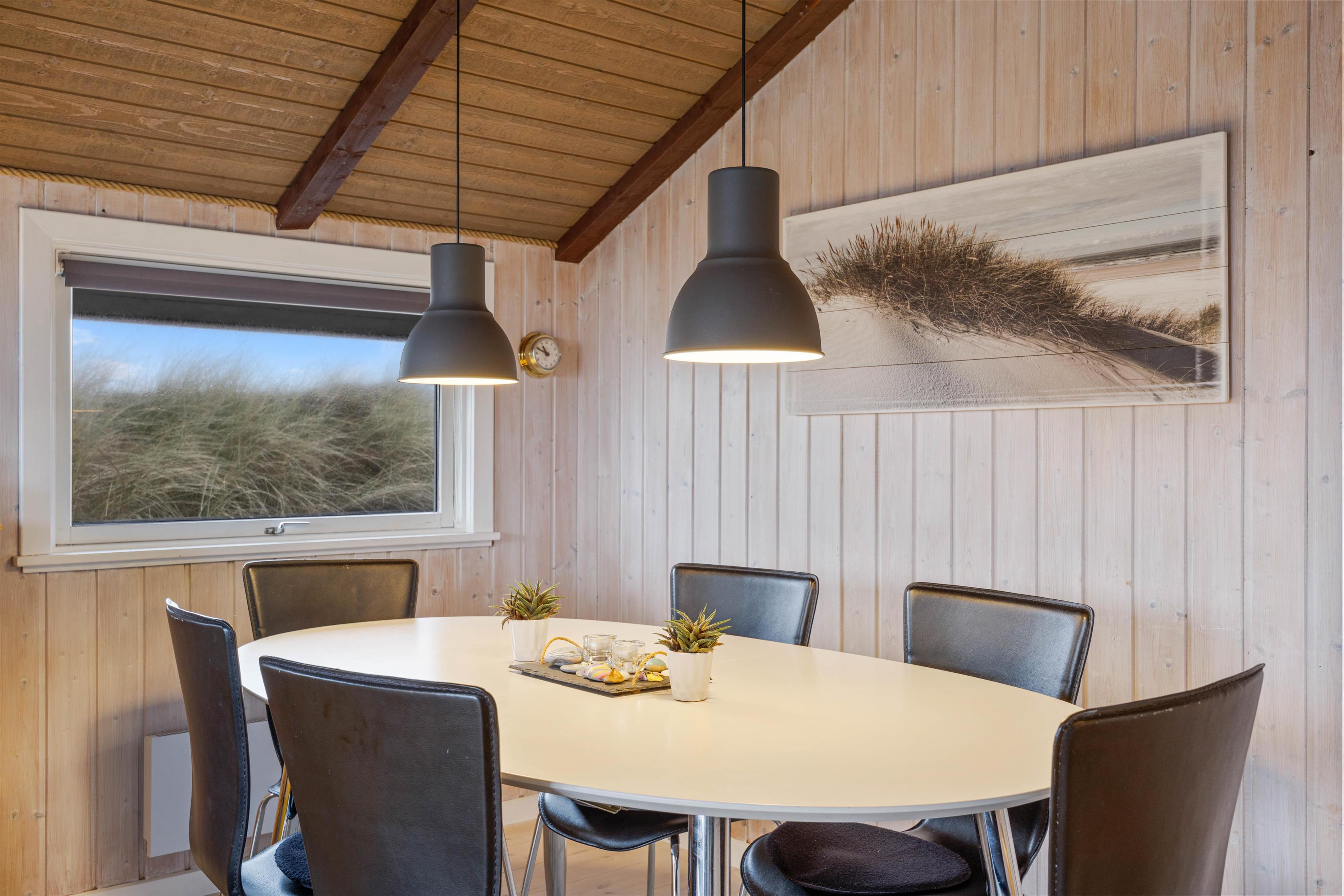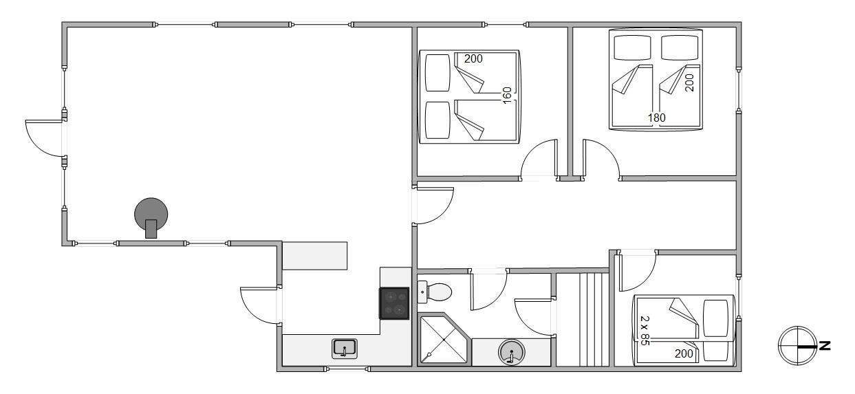 Sommerhusets hjerte er det åbne køkken- og spisestueområde, som automatisk bliver mødestedet i løbet af ferien. Her vil der helt sikkert blive tilbragt mange skønne feriestunder med fælles madlavning, filmhygge og sene aftener på sofaen. Alt i mens kan I nyde varmen og ildens dansen i brændeovnen. Sommerhuset har desuden en energibesparende varmepumpe, som I med fordel kan benytte jer af til at holde en behagelig temperatur.