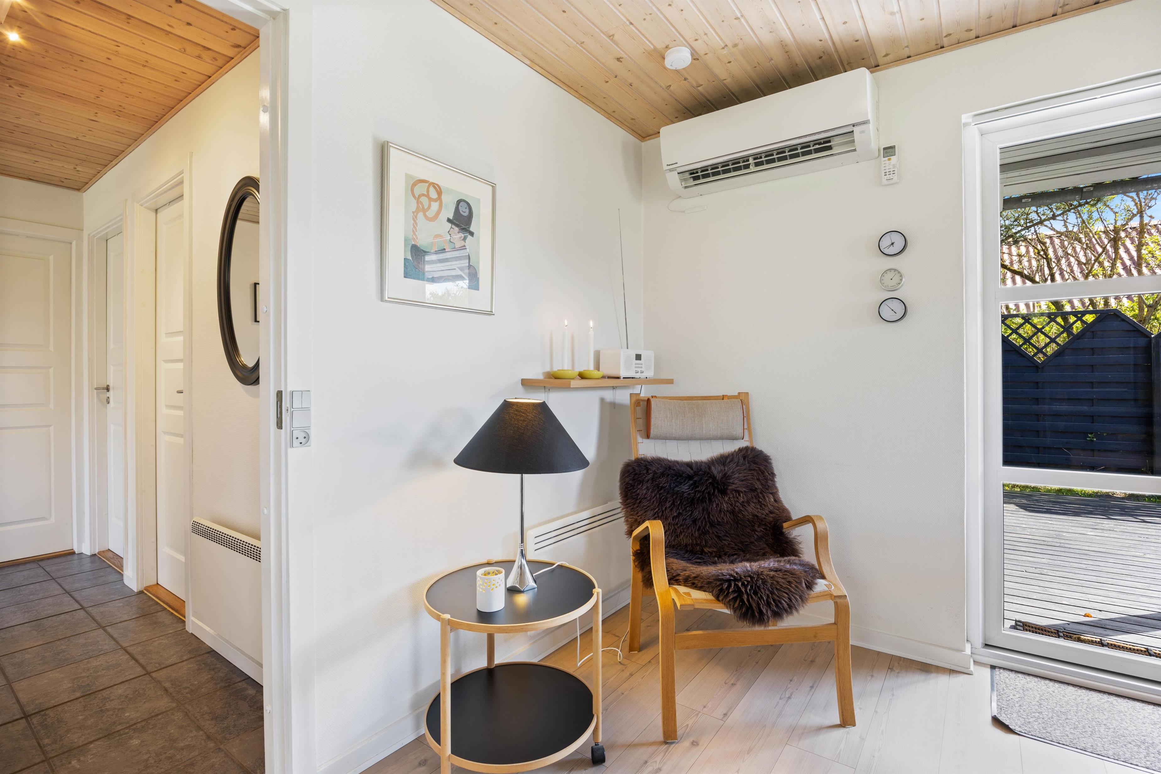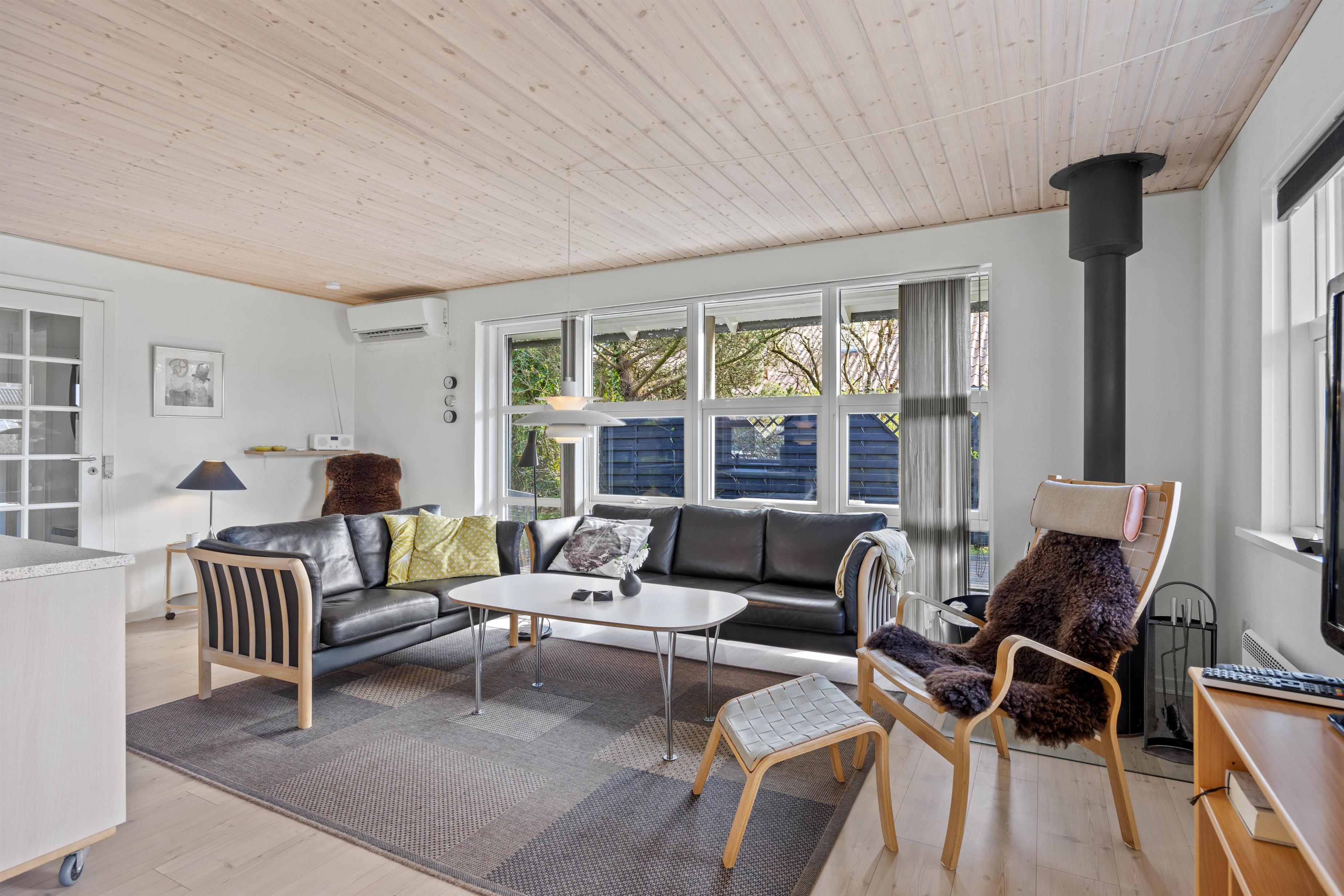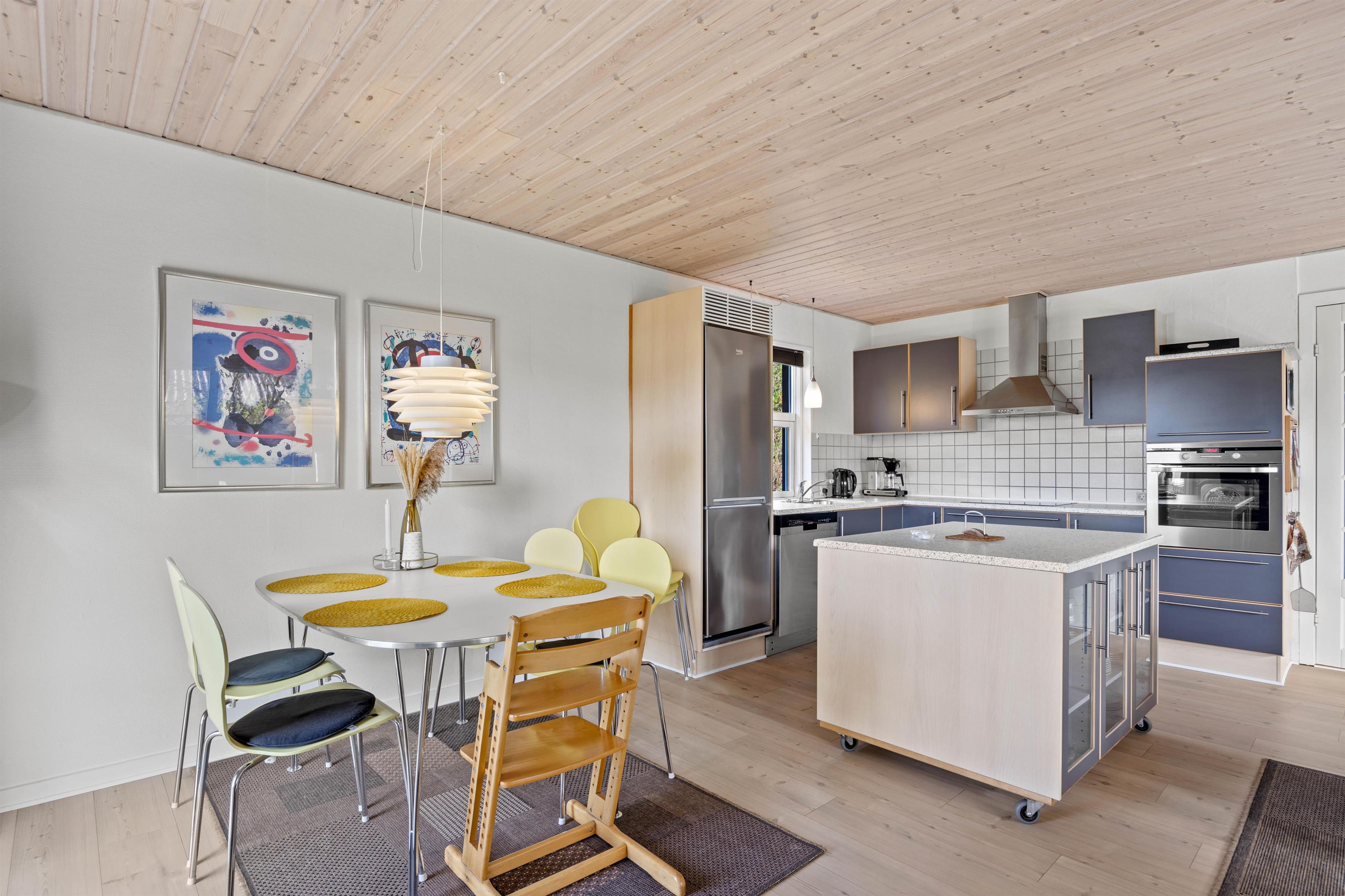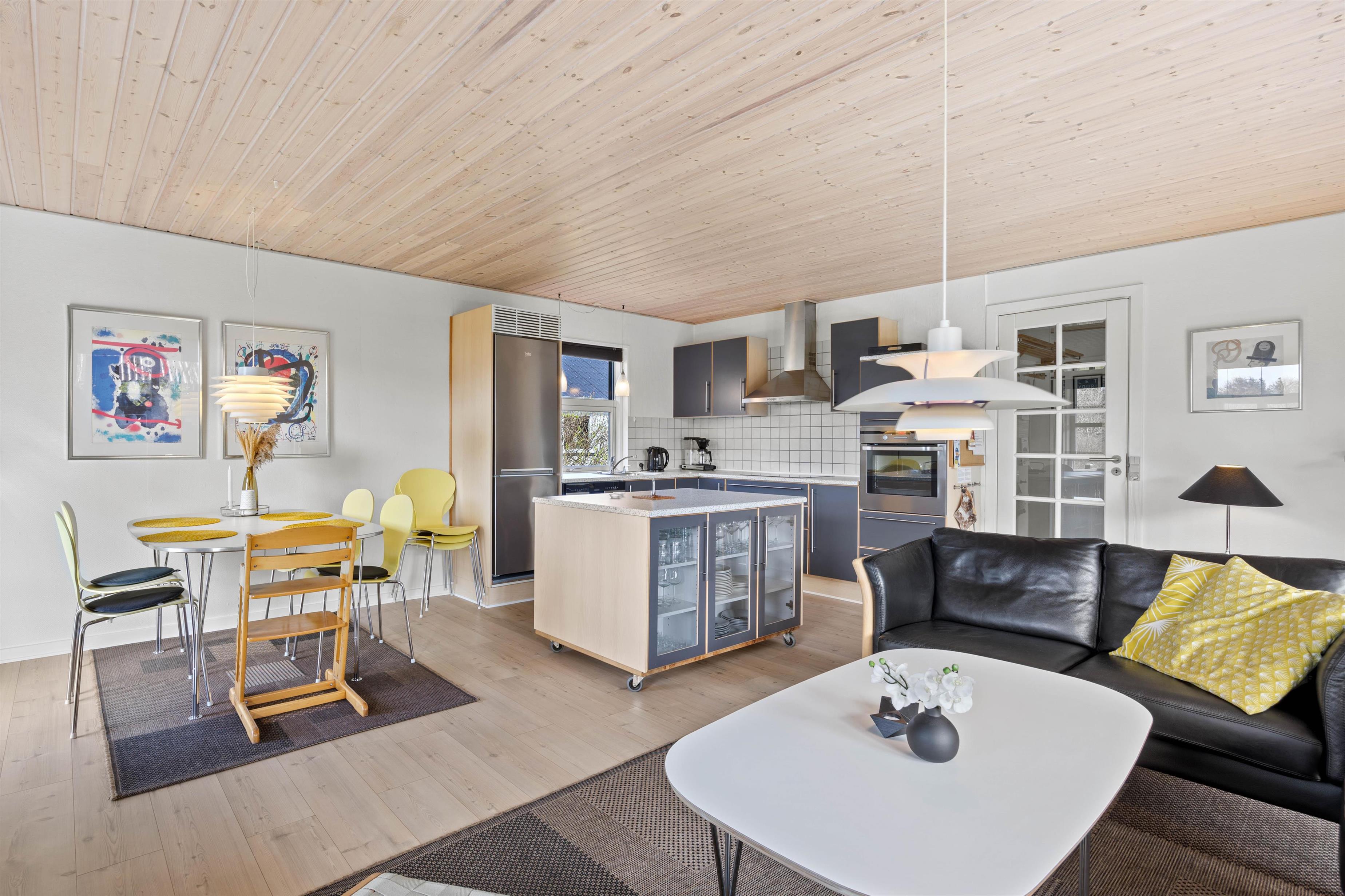 På Heidesvej 10 byder sommerhusets lyse og venlige indretning velkommen, straks I træder indenfor. De brede vinduespartier og glasdørene med udgang til terrassen giver et fint lysindfald i opholdsrummet. Her kan I trække jer tilbage i sofagruppen og nyde varmen fra brændeovnen, imens I hygger jer med en kop varm kakao. Det åbne køkken med kogeø indeholder alt, hvad I behøver for at forkæle hinanden med lækre hjemmelavede måltider. Især lystfiskere vil glædes over den separate fryser på 90L – her er plads nok til en fisk eller to.