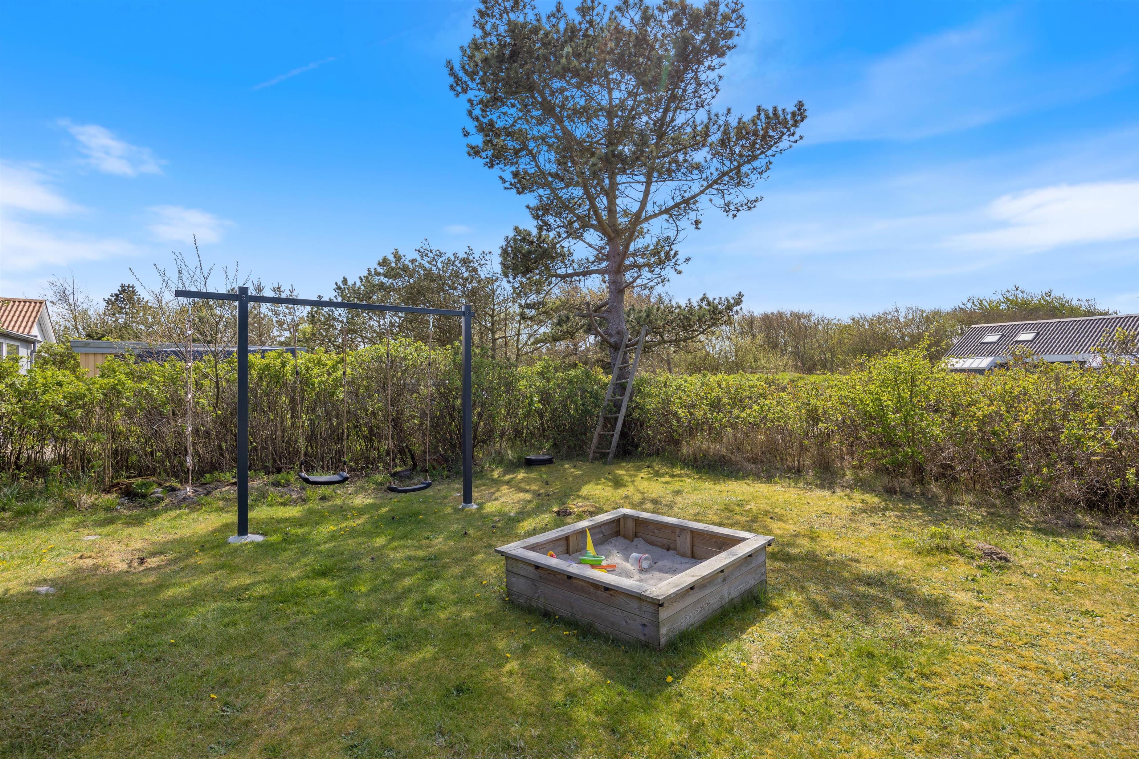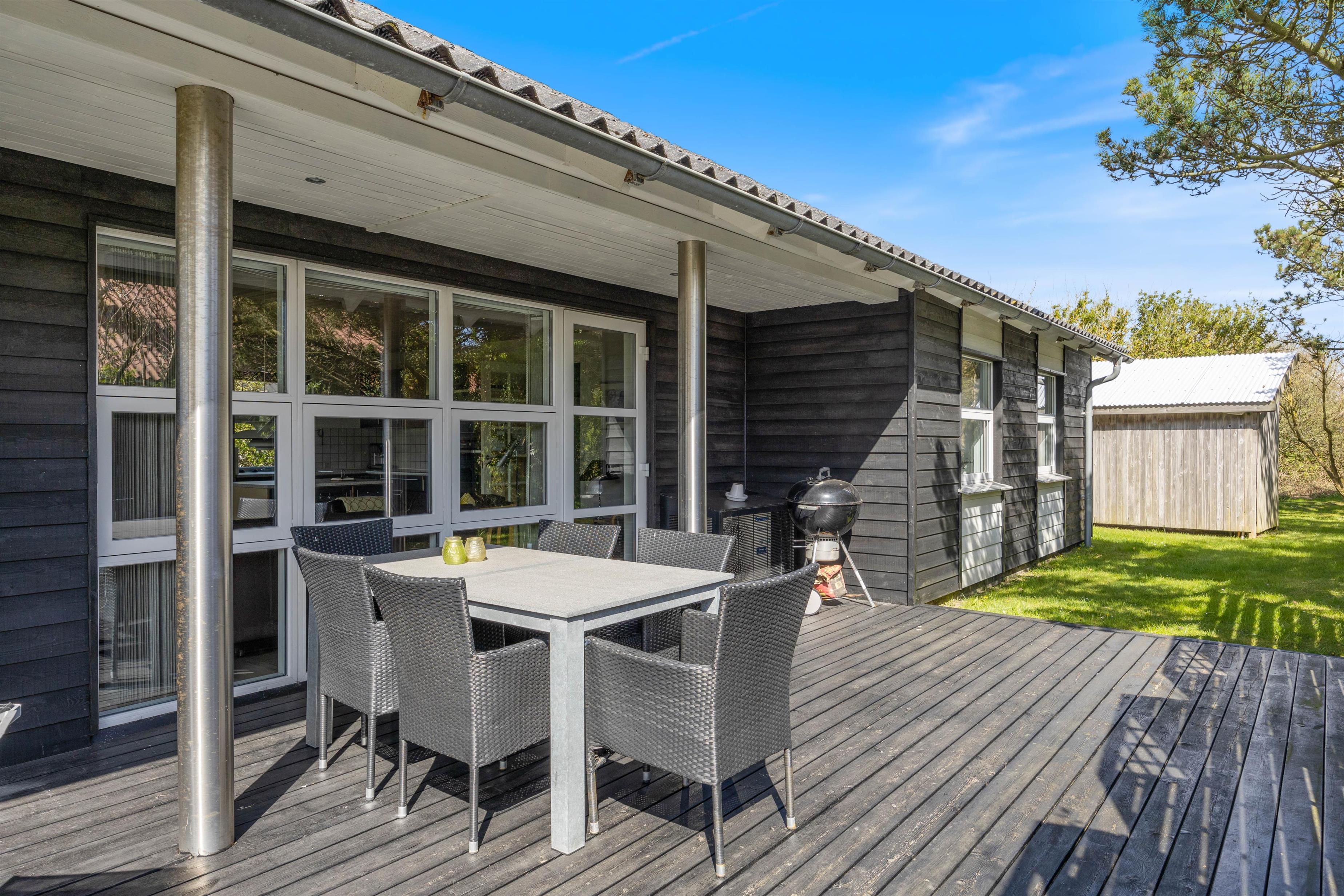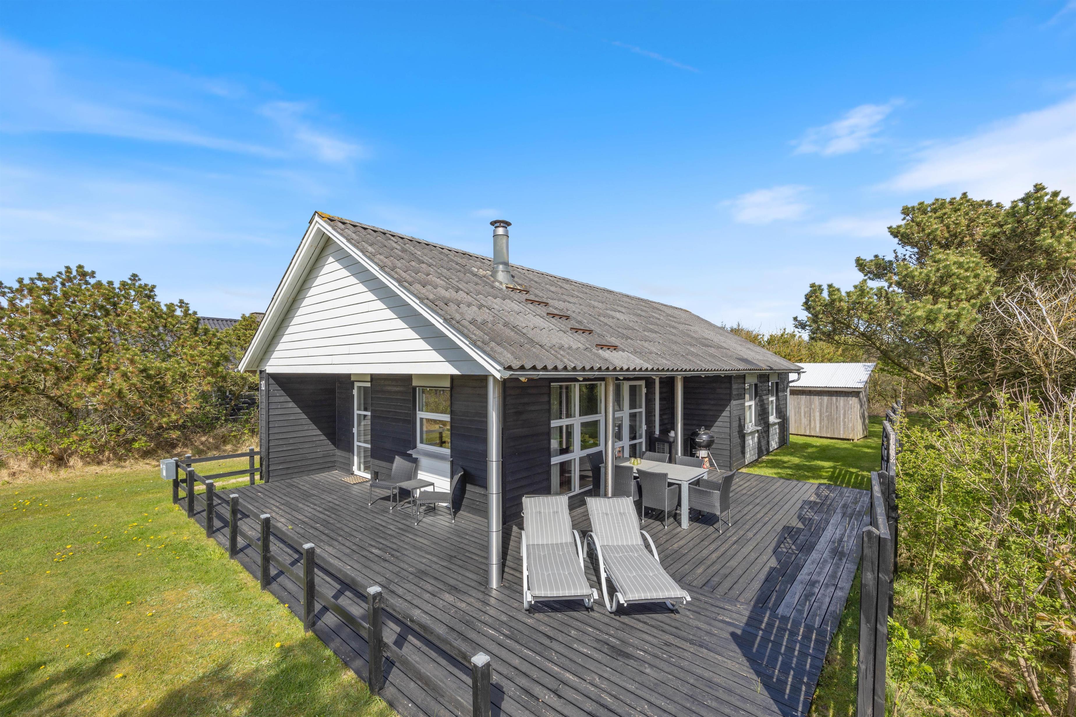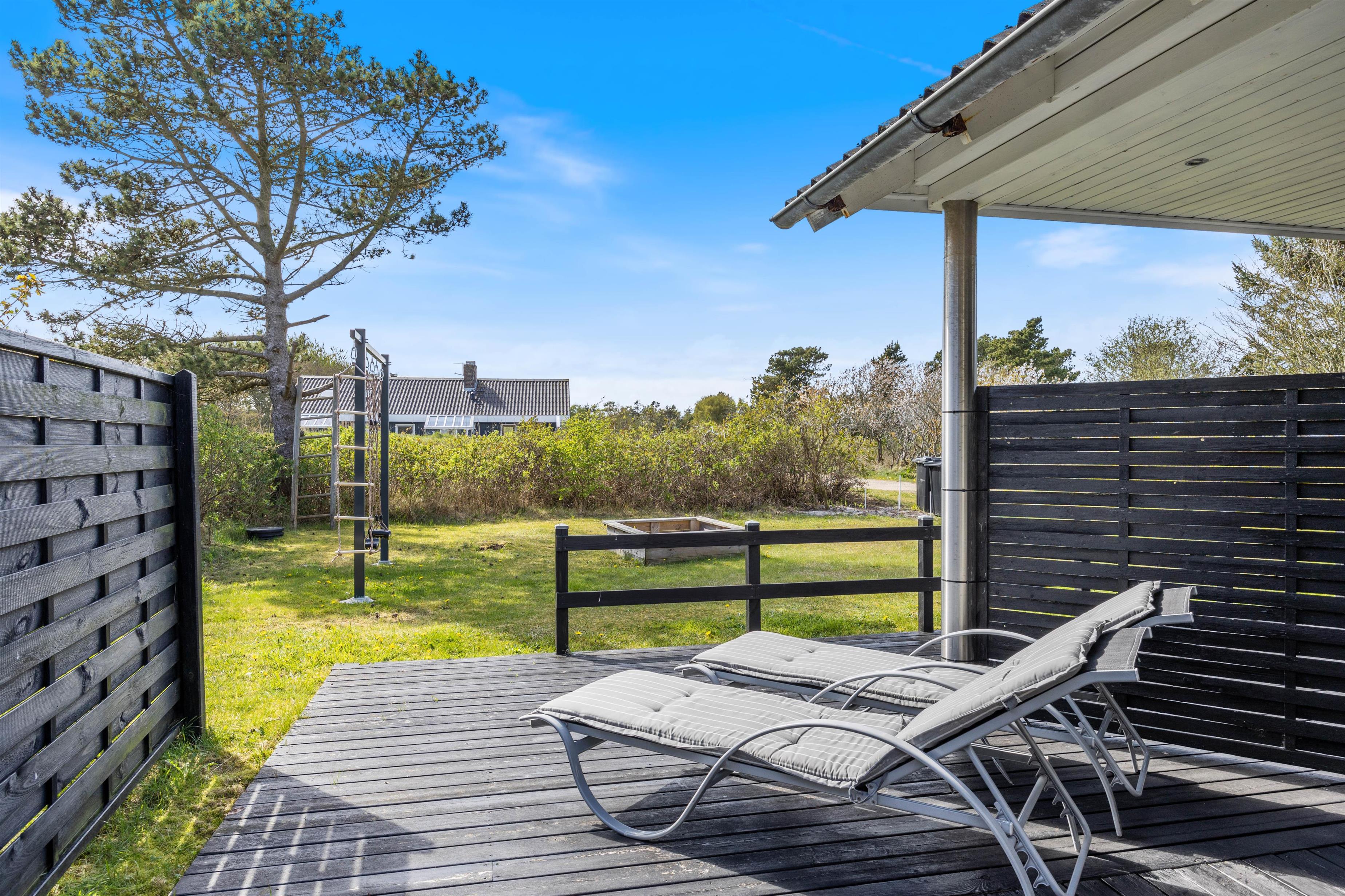 Der er både en syd- og en vestvendt terrasse, hvor I kan slappe af i de komfortable havemøbler eller slikke sol på liggestolene. I kan indtage dagens måltider herude og samtidig holde øje med børnene i sandkassen eller gyngerne. Naturgrundens udformning gør den ideel til boldspil eller et spil vikingespil, som både store og små kan deltage i. Slut dagen af med at tænde op i grillen og nyd et lækkert grillmåltid, imens skyggerne bliver lange. Der er kun en god kilometer til Vesterhavet, så en frisk gåtur efter aftensmaden fører hen til en af Danmarks smukkeste solnedgange.