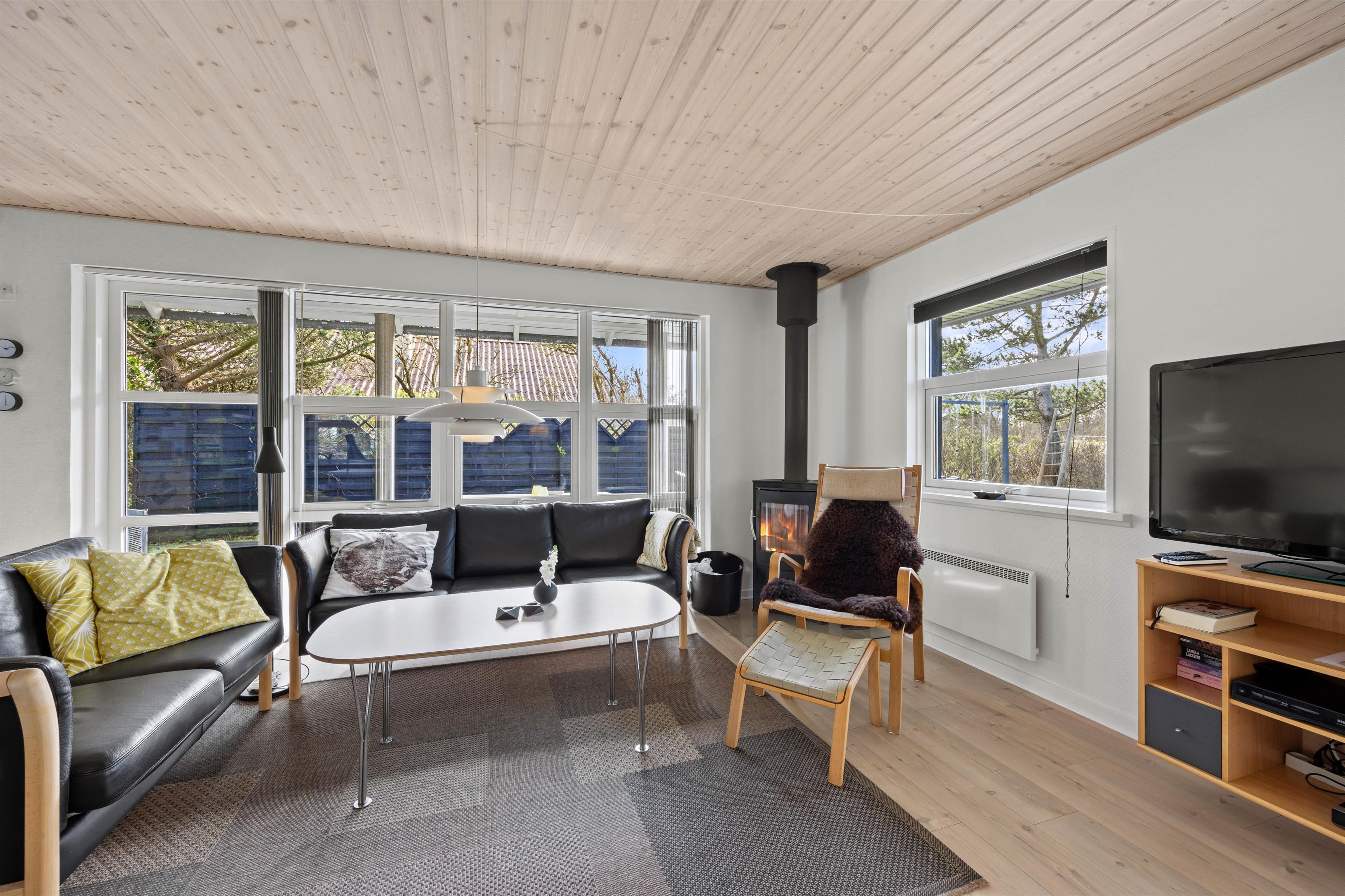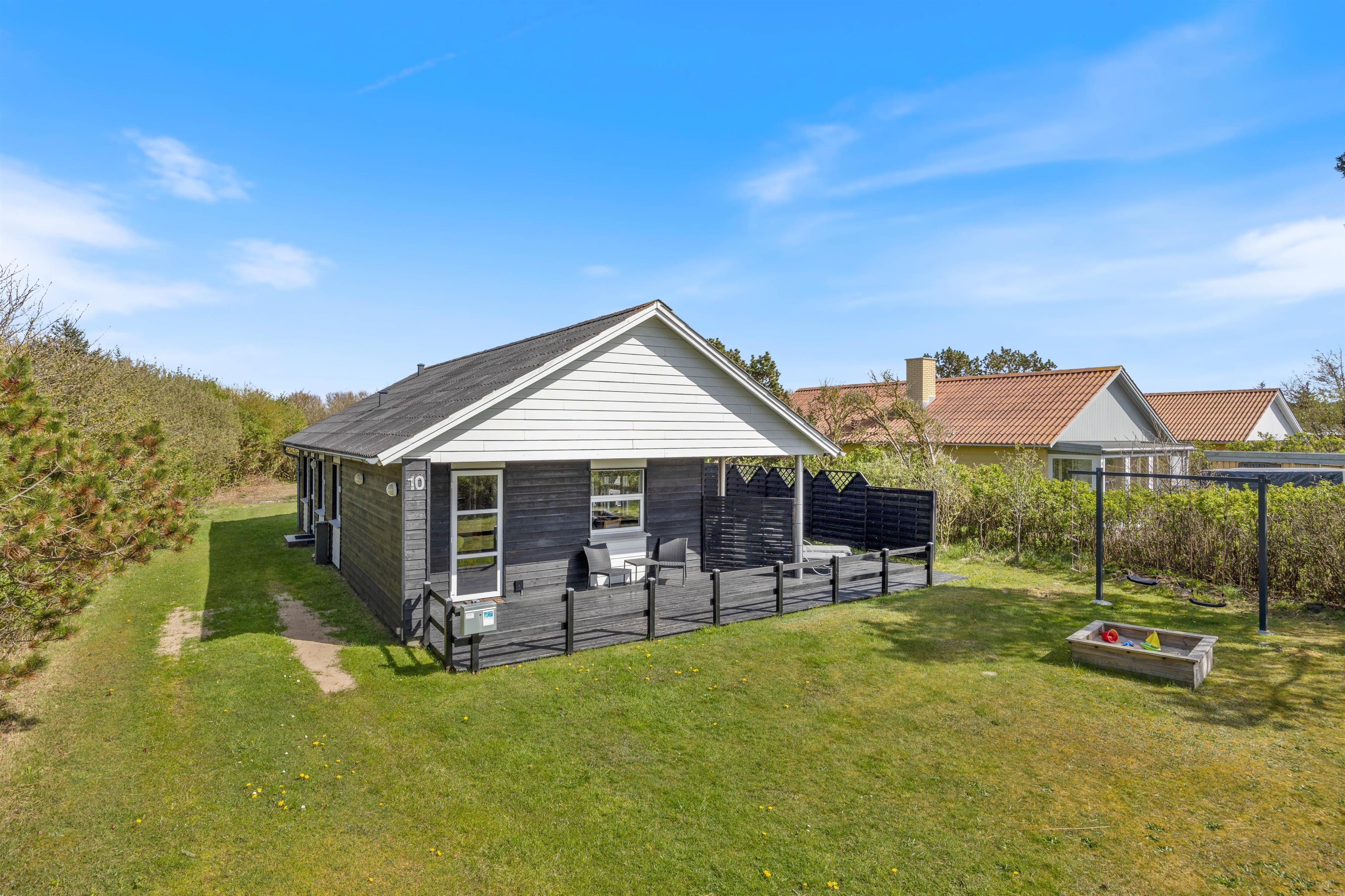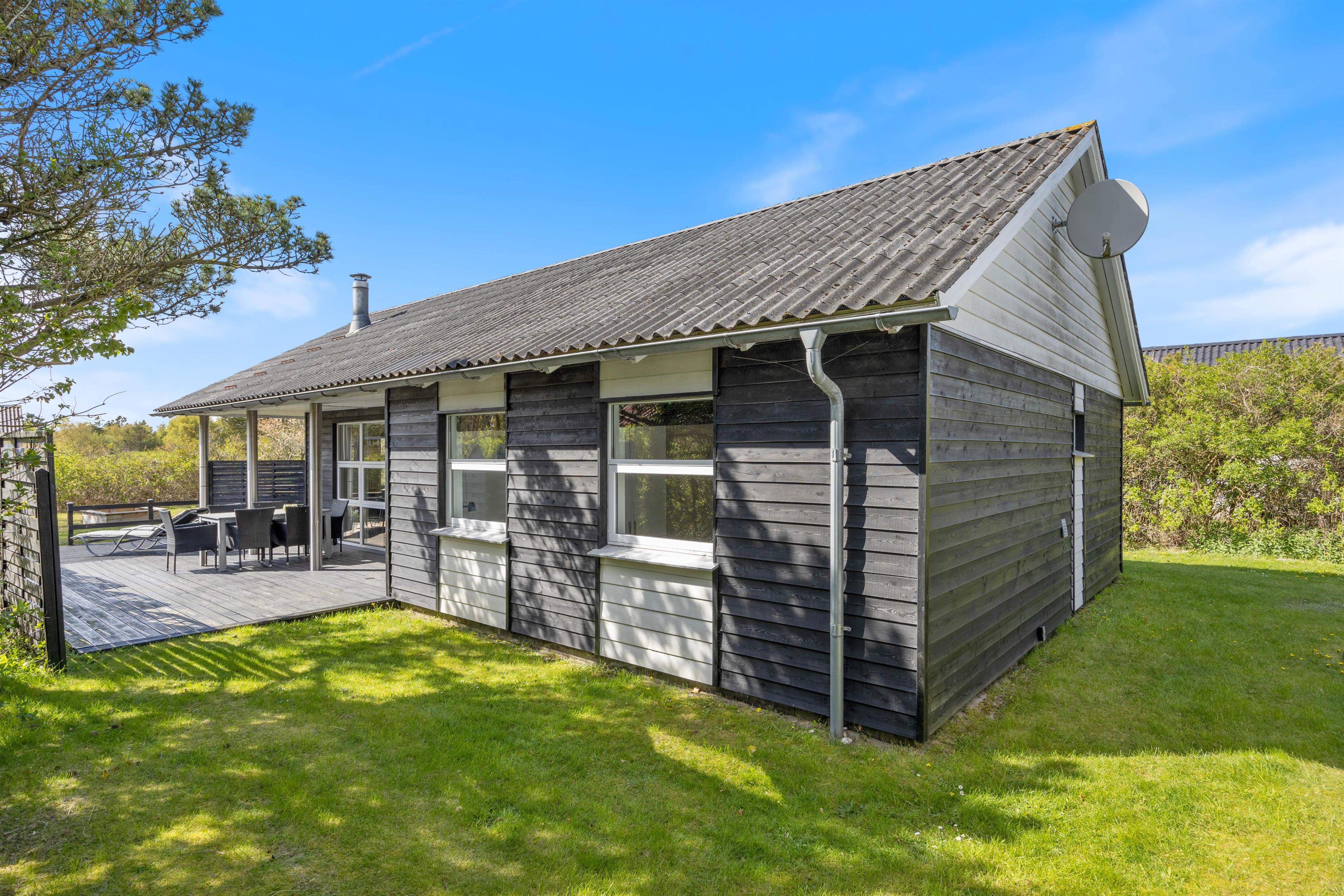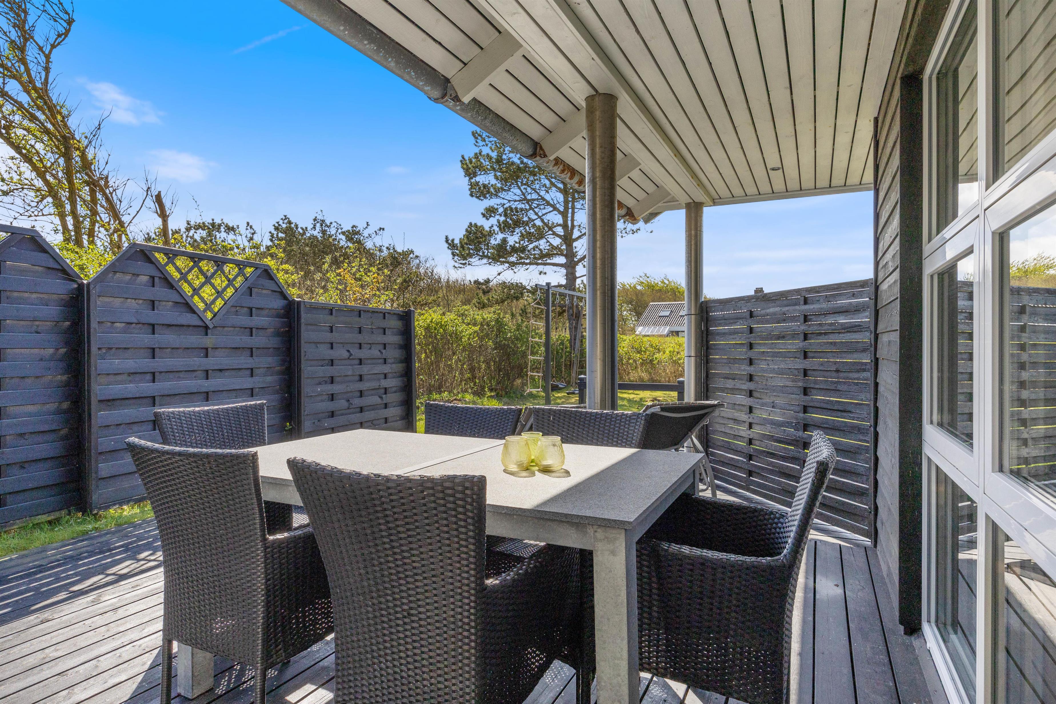Der er både en syd- og en vestvendt terrasse, hvor I kan slappe af i de komfortable havemøbler eller slikke sol på liggestolene. I kan indtage dagens måltider herude og samtidig holde øje med børnene i sandkassen eller gyngerne. Naturgrundens udformning gør den ideel til boldspil eller et spil vikingespil, som både store og små kan deltage i. Slut dagen af med at tænde op i grillen og nyd et lækkert grillmåltid, imens skyggerne bliver lange. Der er kun en god kilometer til Vesterhavet, så en frisk gåtur efter aftensmaden fører hen til en af Danmarks smukkeste solnedgange.
