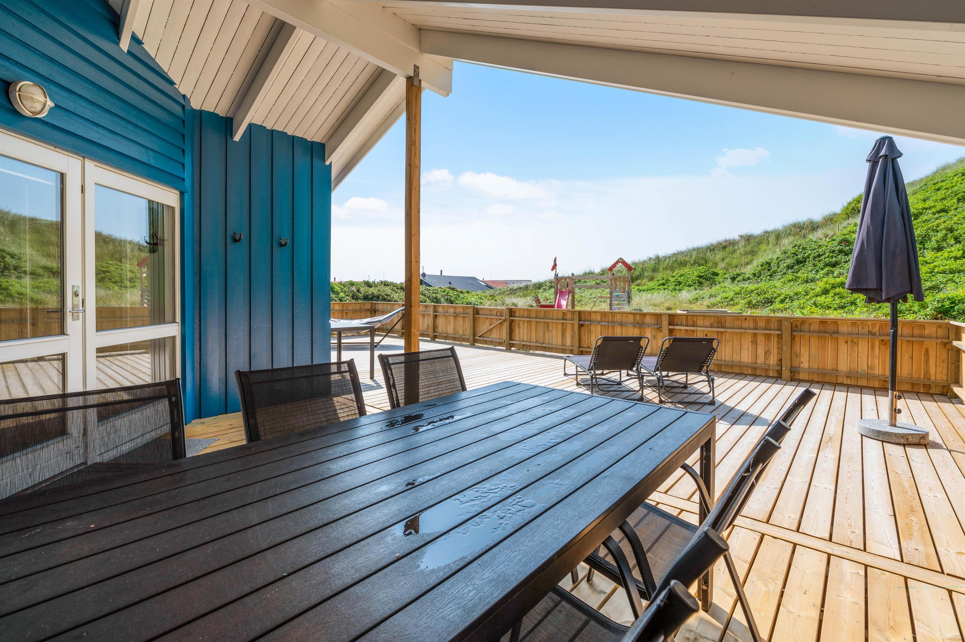 Rauhesvej 76 har en skøn og helt lukket sydvendt terrasse. Den er desuden delvist overdækket og delvist afskærmet. Fra terrassen er der en smuk udsigt til klitlandskabet, som fuldendes af den friske duft fra Vesterhavet. Her er der mulighed for hyggelige grillaftener, ligesom terrassen og gyngerne ved sommerhuset er ideel for familier med små børn og hund.