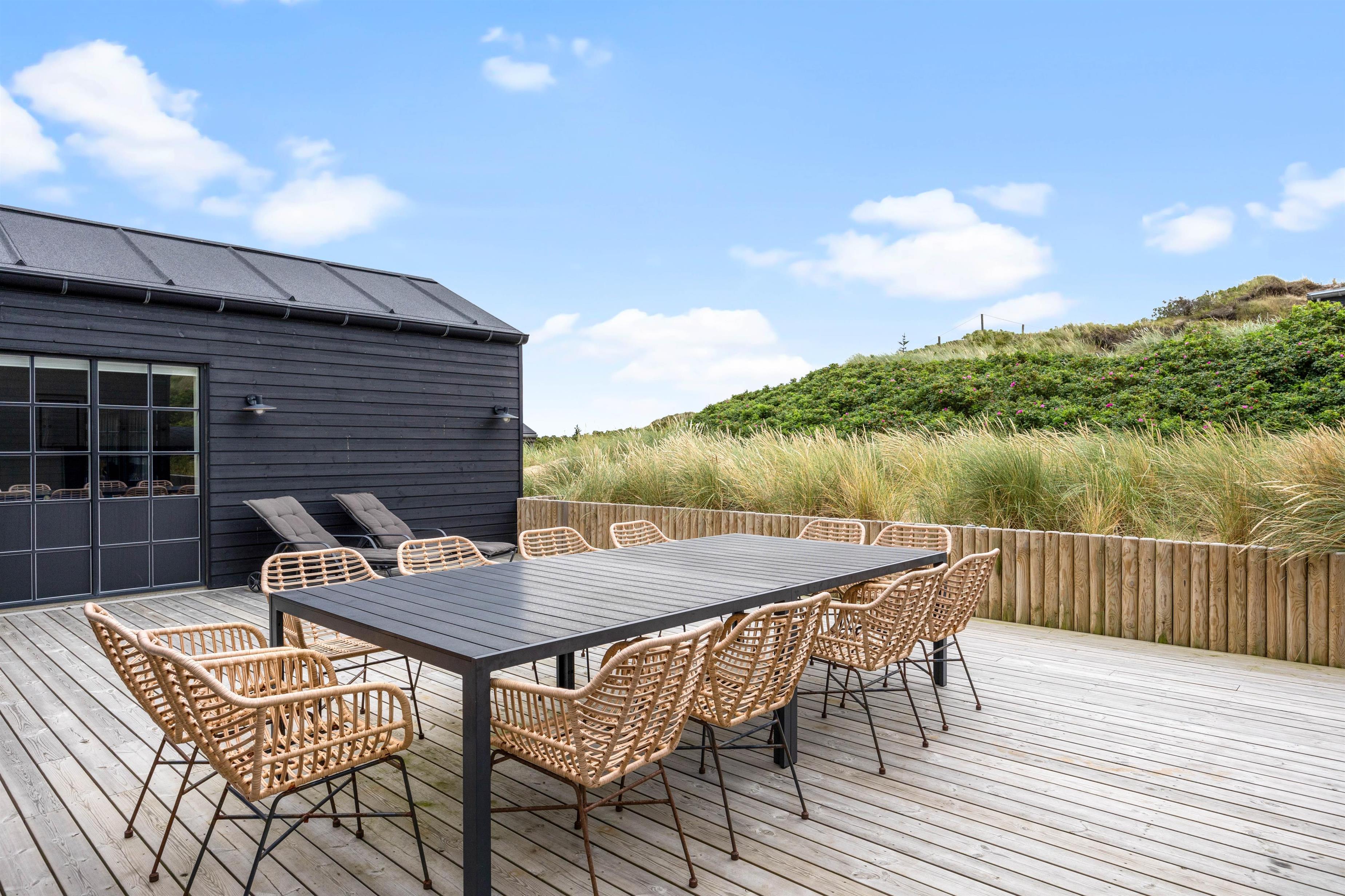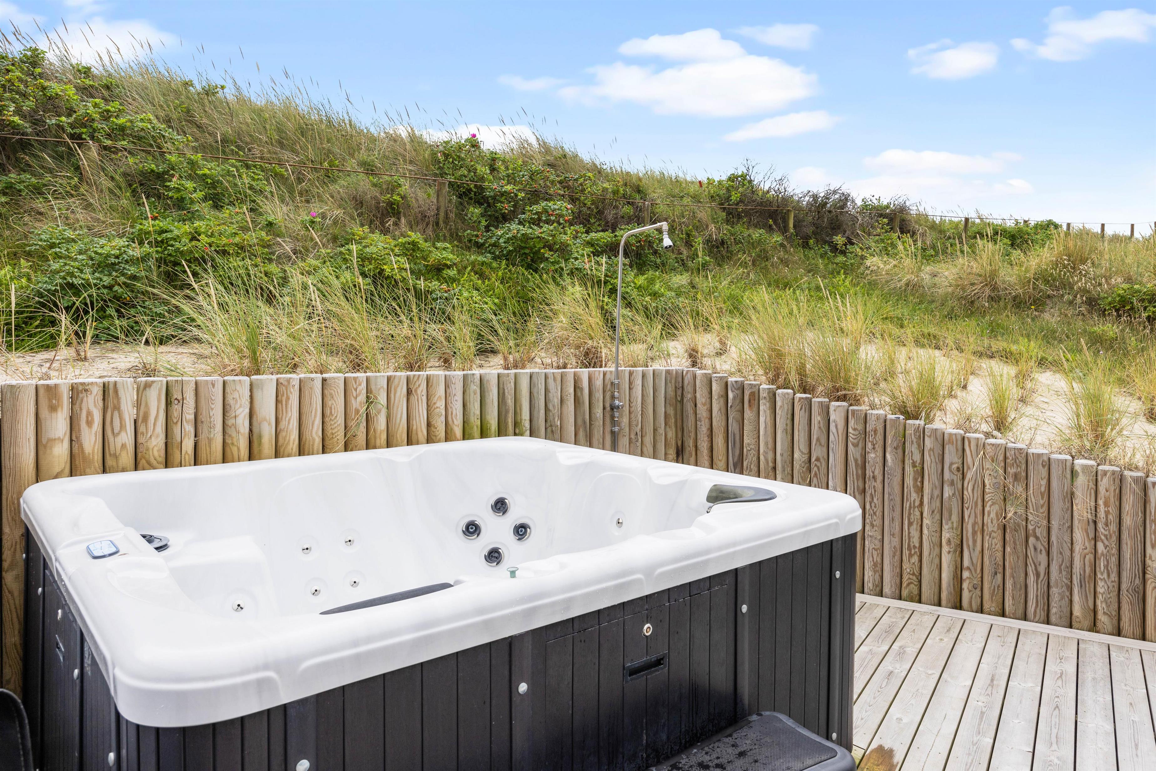 Udendørs er selve beliggenheden enestående med kun 50 meter til havet. Selv om der ligger flere sommerhuse i området, er I helt ugenerte her, da sommerhuset er omgivet af sandvolde med marehalm. Terrasseområdet er inddelt i flere afsnit, hvor der fra indendørspoolen er udgang til et spaområde med udespa, solsenge og udebruser. Udebruseren kan benyttes fra april til november. Der er et afsnit med sofa og lænestole, og et afsnit med gasgrill og spisemøbler. Her vil I altid kunne finde en plet med læ og lys til at læse en god bog eller bare nyde den friske luft. Til de små er der gyngestativ med tårn og rutchebane, så de kan brænde krudt af her.