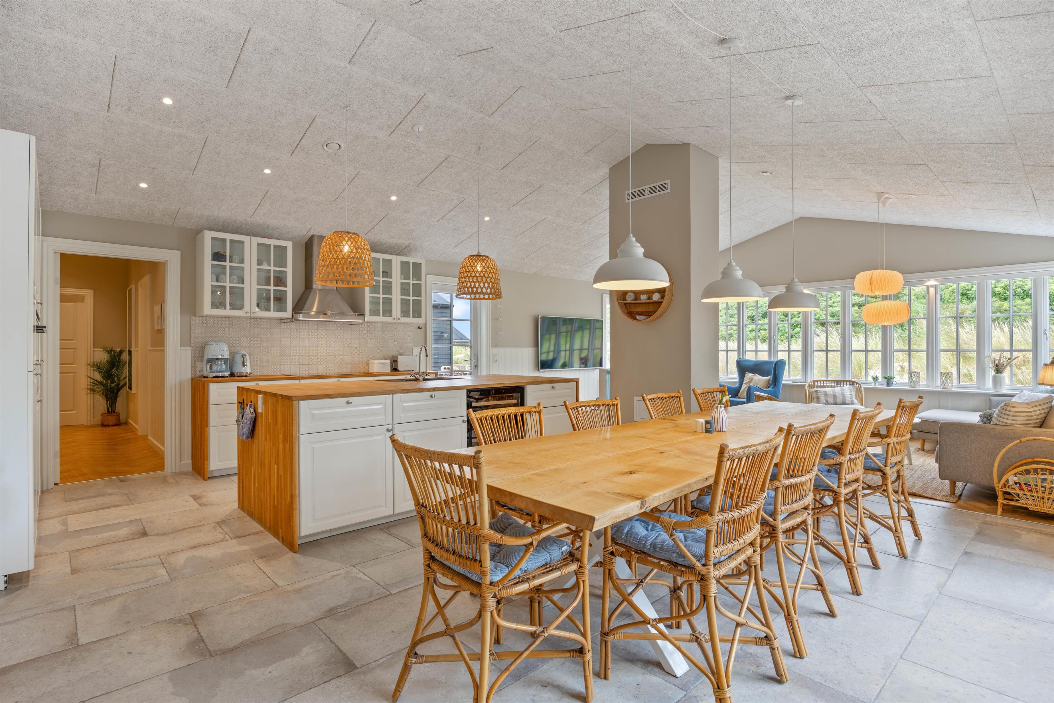 I dette rummelige sommerhus på 230 kvadratmeter er køkken/alrummet det naturlige mødested for feriehusets beboere. Her mødes man til dagens måltider – hvis ikke, de indtages ude på terrassen. Eller man slapper af med brætspil eller en TV-serie foran brændeovnen. Det fine lysindfald gennem de brede partier med sprossevinduer og de lyse, nordiske farver giver et varmt og inspirerende miljø. I det åbne køkken er alt, hvad I behøver for at fremstille de hjemmelavede og lækre måltider, som indtages ved spisebordet.