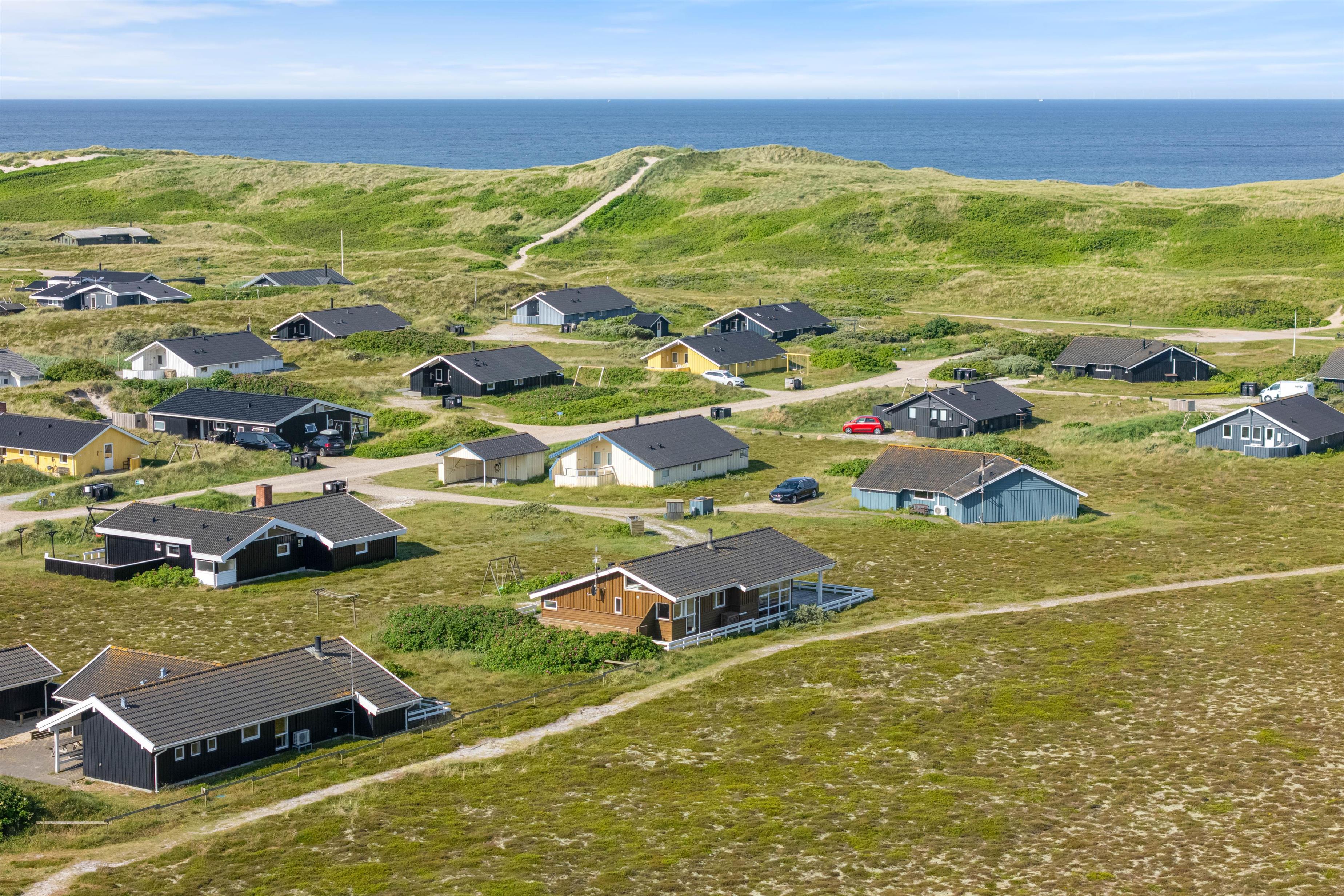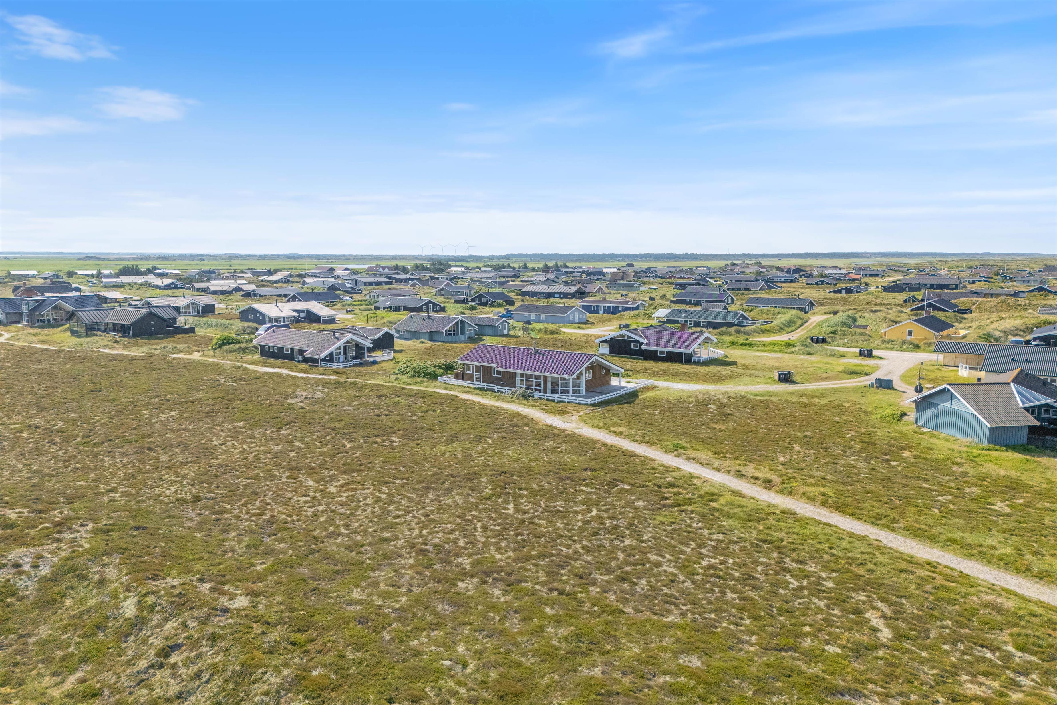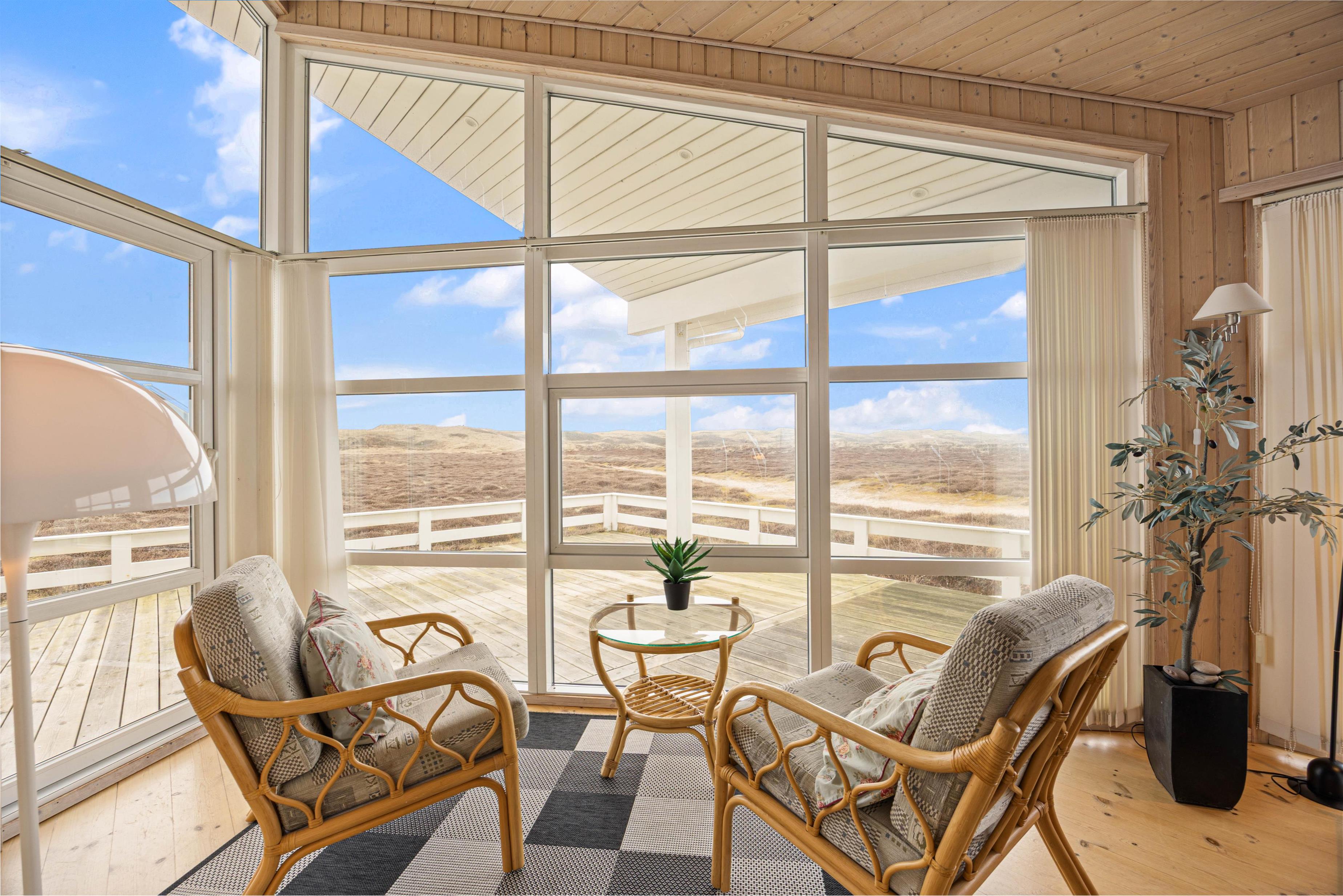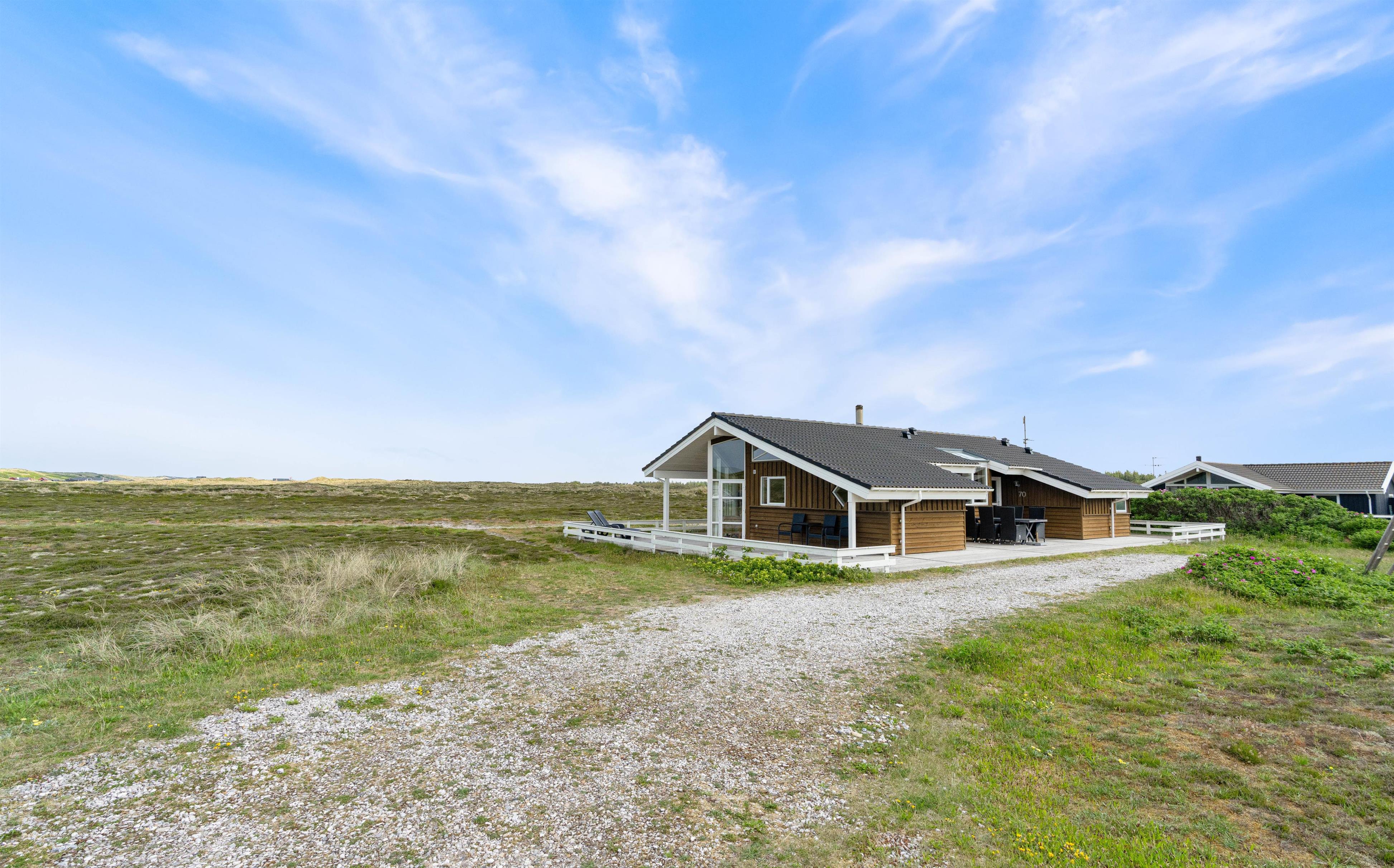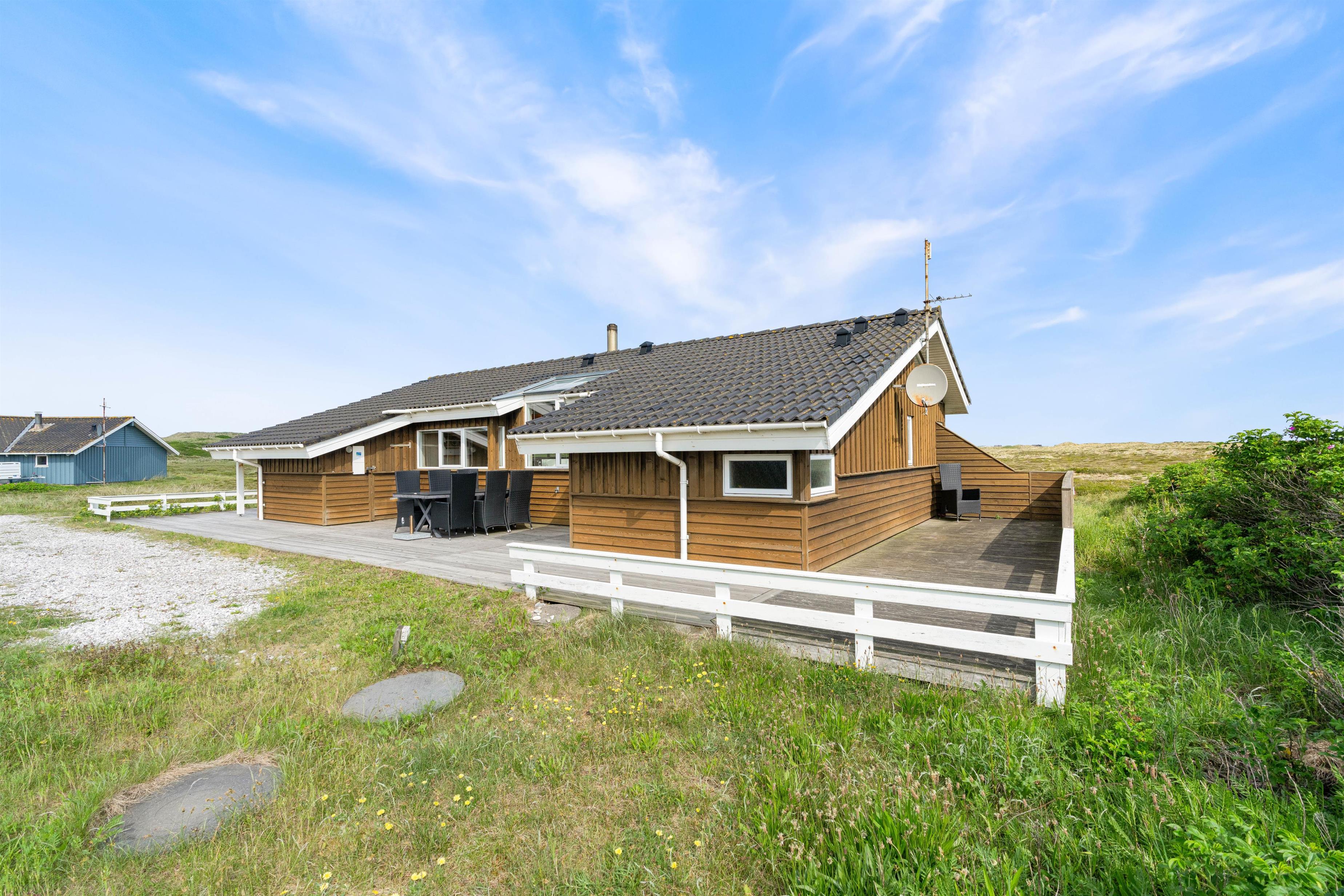 Det rummelige sommerhus er omgivet af en stor terrasse, der er udstyret med havemøbler, liggestole og grill. Her er en vidunderlig fred og ro samt udsigt over den vidstrakte hede og til klitterne.