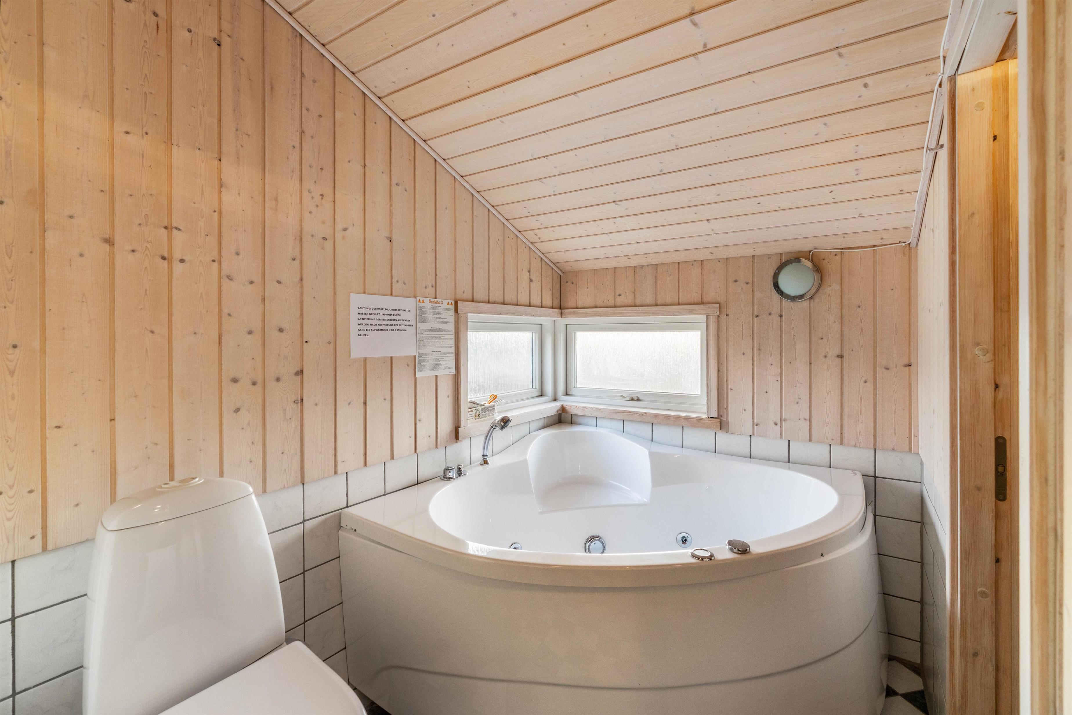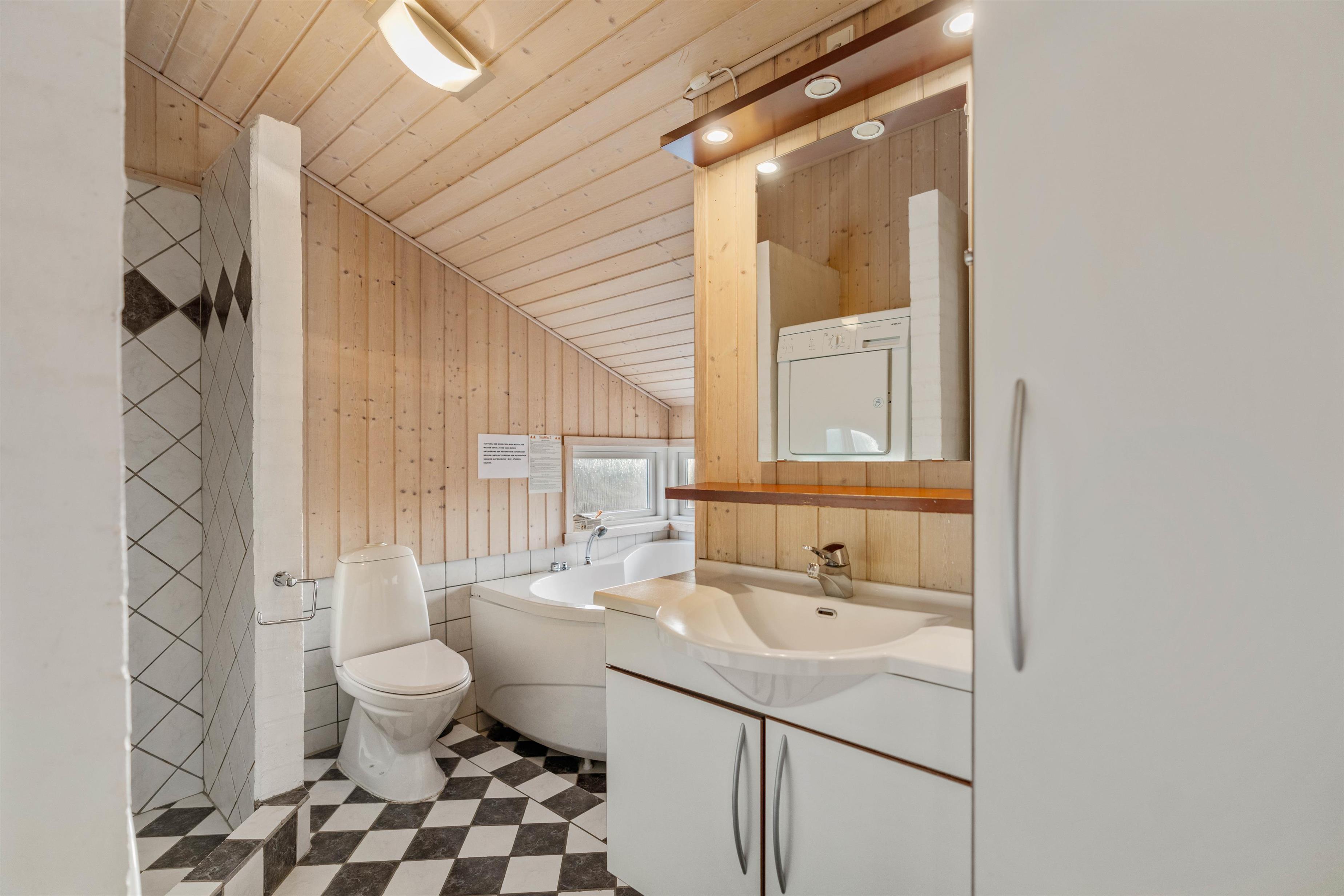 Badeværelset med gulvvarme har spa og adgang til feriehusets sauna. Her er der virkelig lagt op til afslapning og velvære efter en oplevelsesrig feriedag med familien. Desuden er der gæstetoilet med bruseniche. Feriehuset råder også over en vaskemaskine samt tørretumbler, hvilket særligt er praktisk med små børn, så I altid kan have rent og tørt tøj til rådighed.