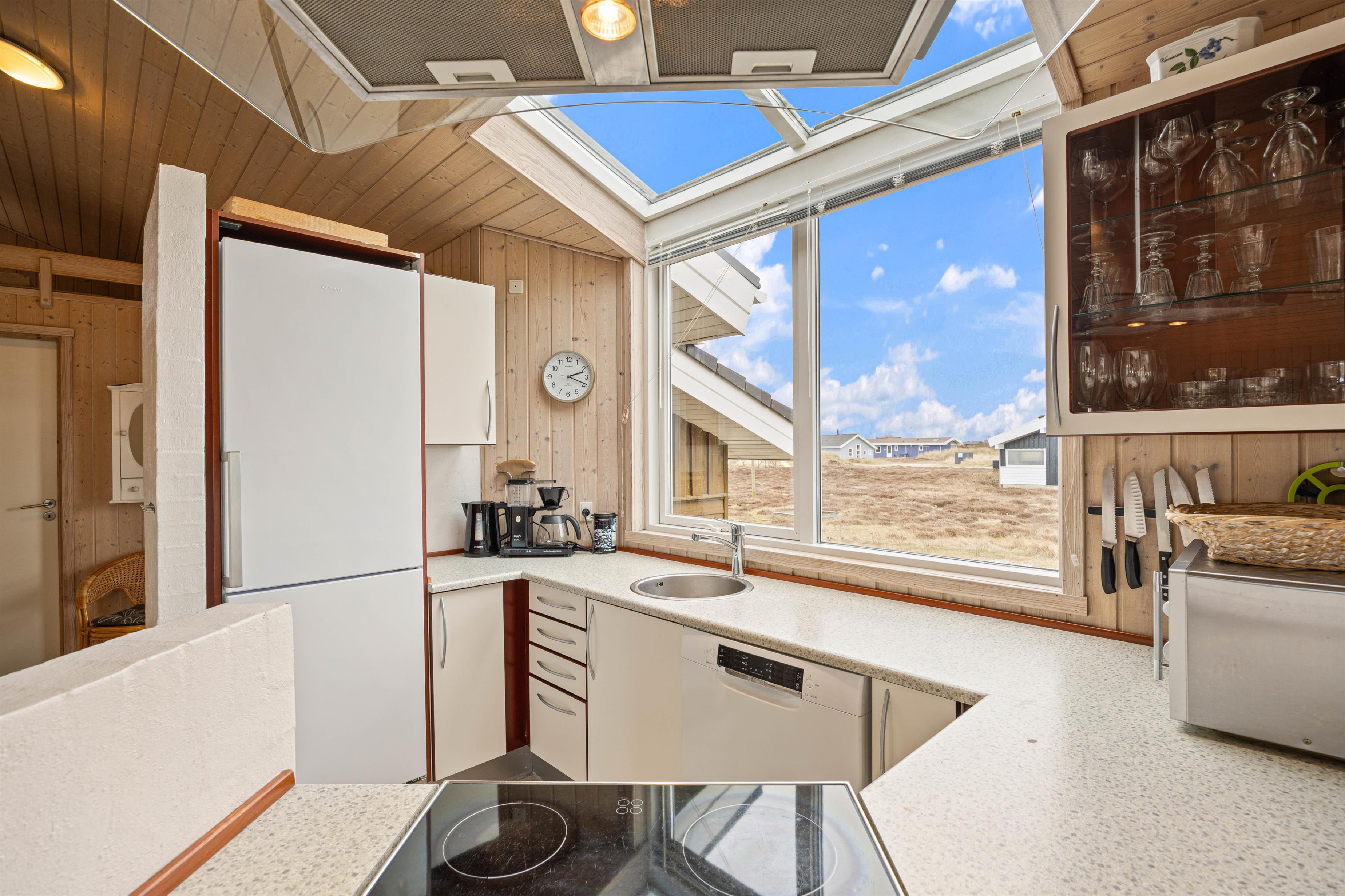 Køkkenet er i åben forbindelse med spiseområde. Fra spiseområdet kommer du via et par trin ned i den hyggelige, forsænkede stue. Stuen er pænt indrettet med en hyggelig brændeovn, og herfra kan du nyde den flotte udsigt over heden til klitterne. Sommerhuset er desuden udstyret med gratis trådløst internet og en energibesparende varmepumpe.