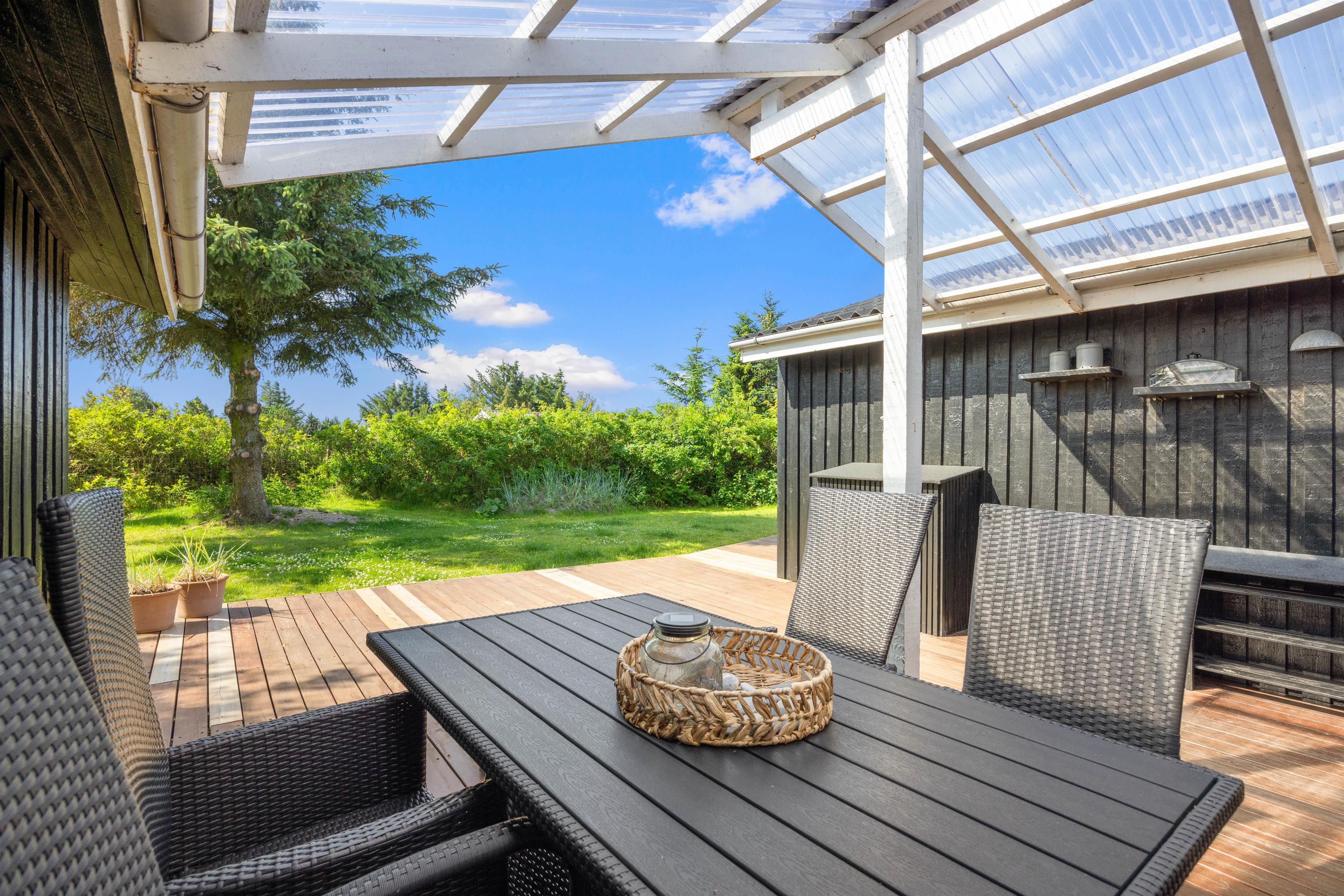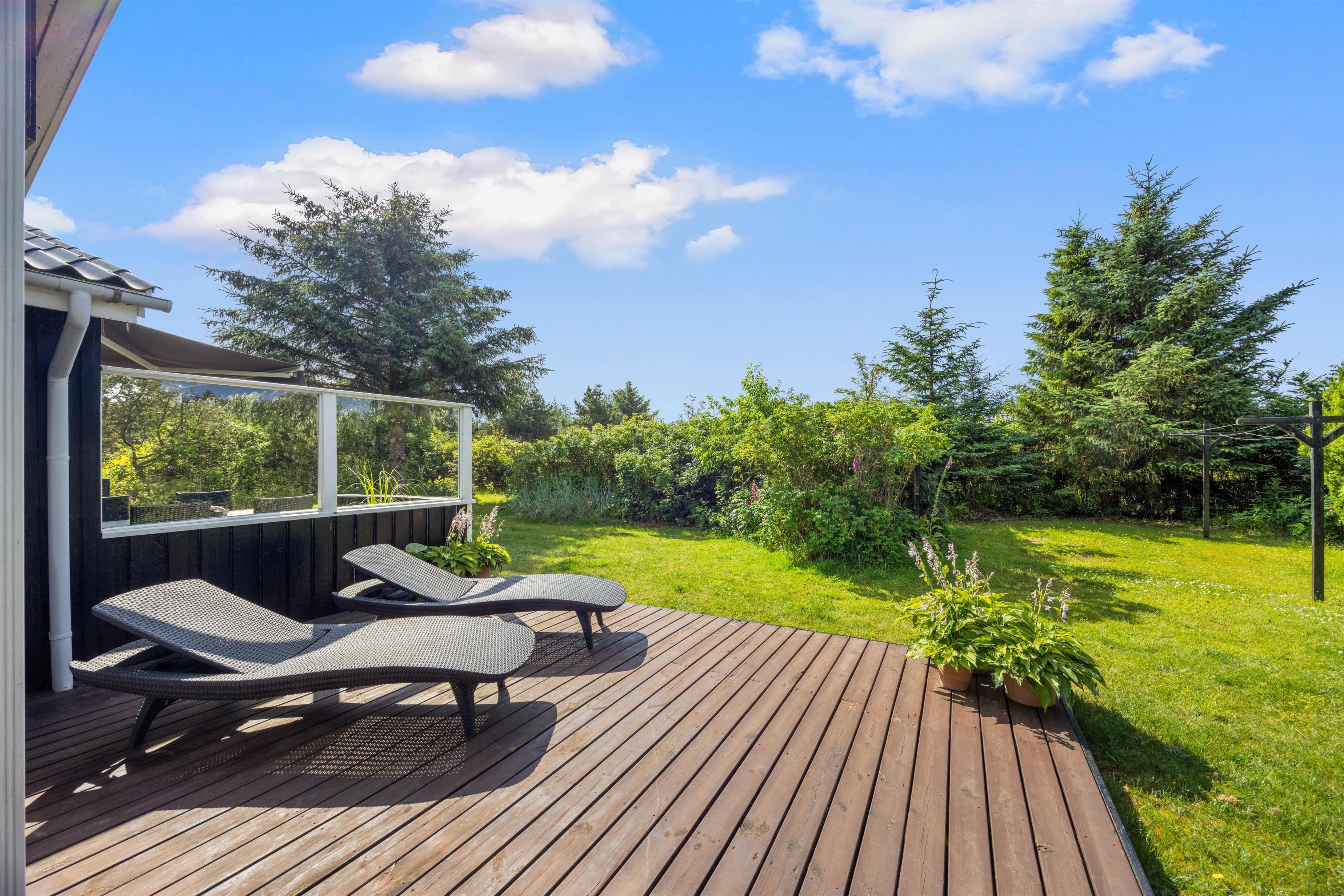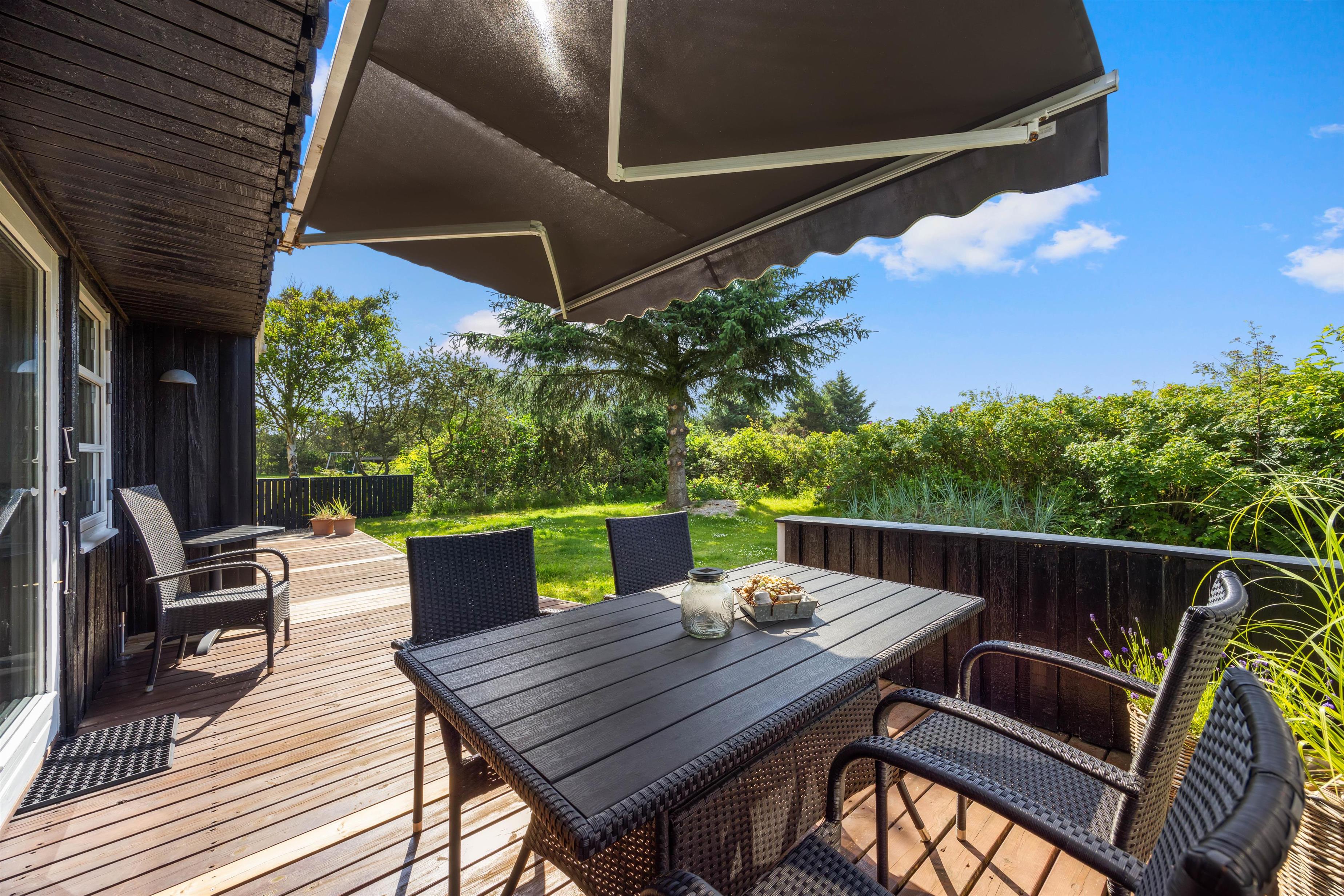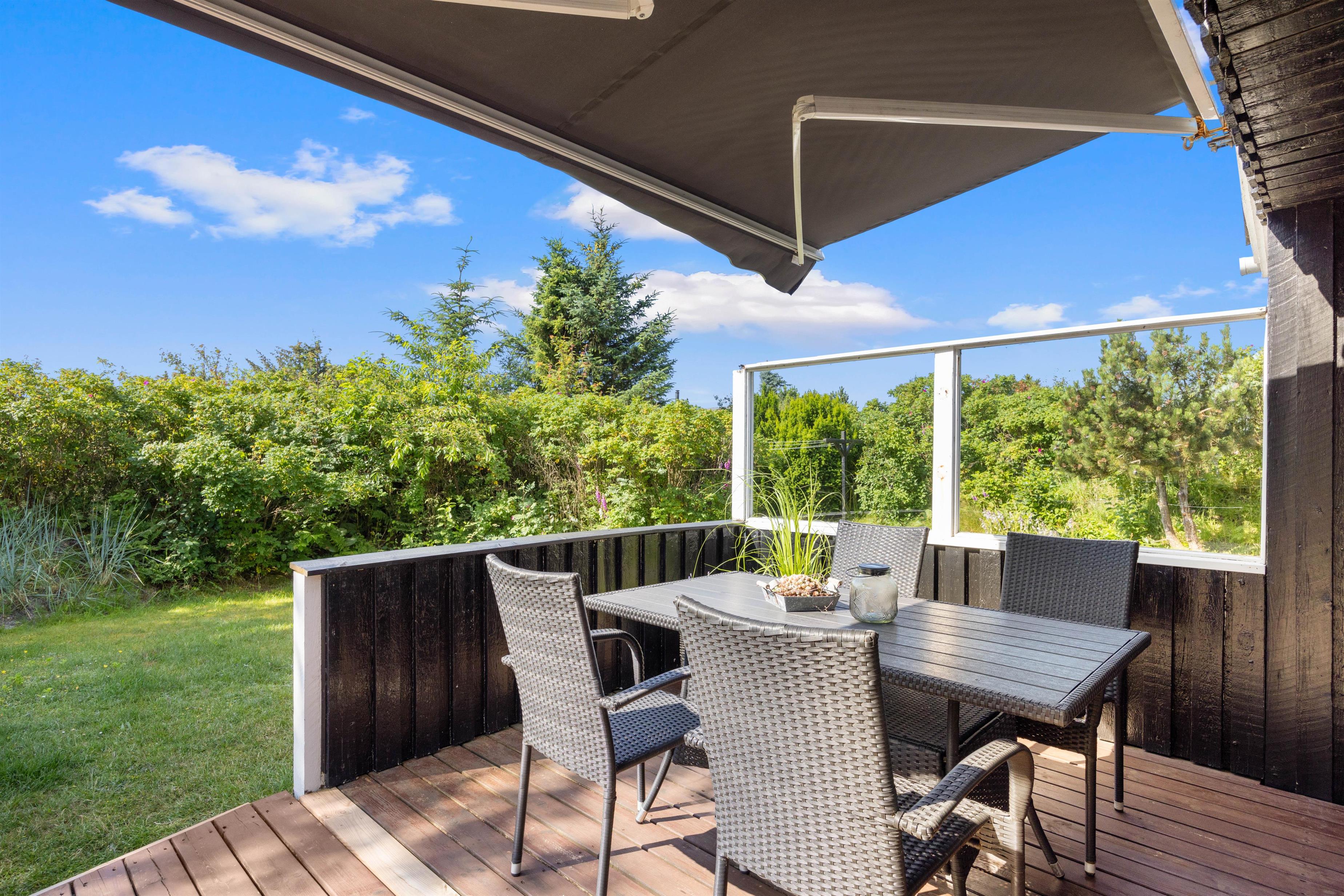 På den brede terrasse kan I nyde både vejret og naturen. Nyd solen i de komfortable liggestole, sid afskærmet i havemøblerne på en blæsende dag eller nyd aftensmaden i de sidste solstråler mod vest. Grunden er afskærmet, så I kan nyde privatlivet. Tænd op i grillen og forkæl hinanden med et lækkert grillmåltid sammen. Med cirka 1 kilometer til Vesterhavet er det oplagt med en gåtur dertil bagefter for at nyde solnedgangen. En solnedgang ved Vesterhavet er altid en oplevelse.