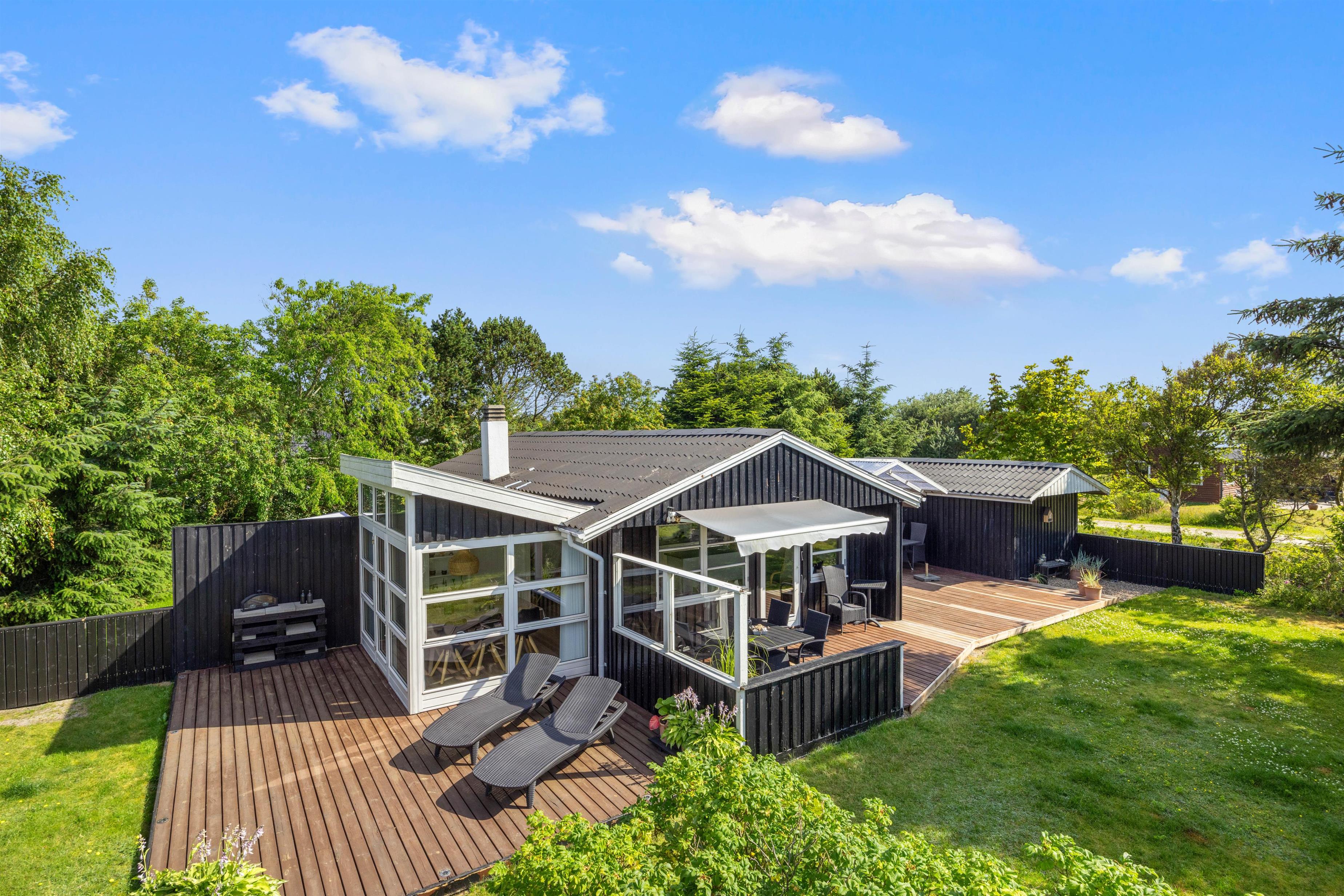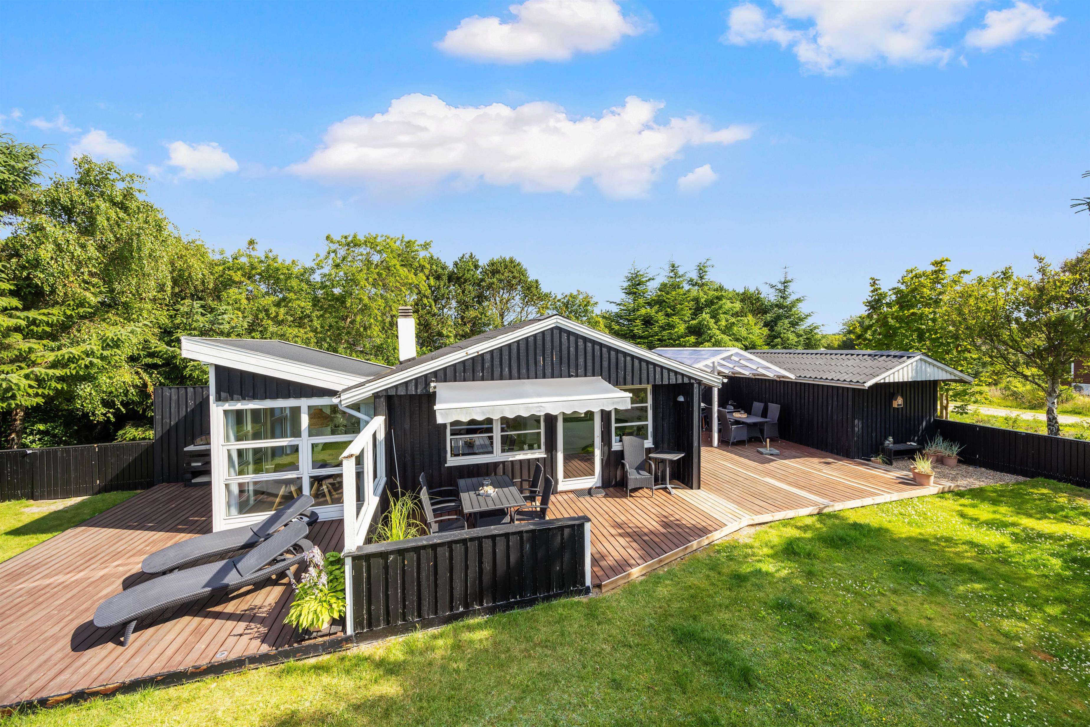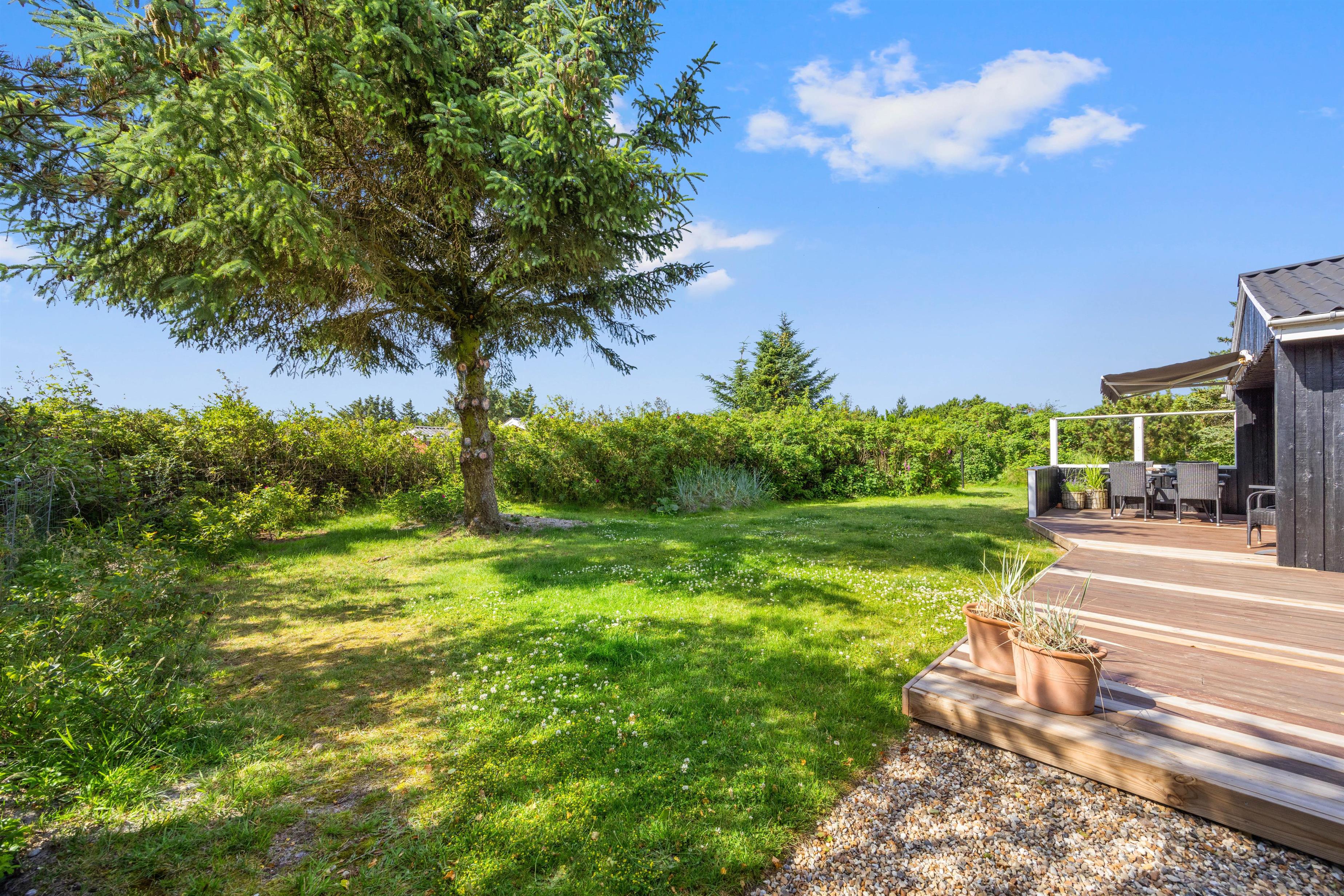 På den brede terrasse kan I nyde både vejret og naturen. Nyd solen i de komfortable liggestole, sid afskærmet i havemøblerne på en blæsende dag eller nyd aftensmaden i de sidste solstråler mod vest. Grunden er afskærmet, så I kan nyde privatlivet. Tænd op i grillen og forkæl hinanden med et lækkert grillmåltid sammen. Med cirka 1 kilometer til Vesterhavet er det oplagt med en gåtur dertil bagefter for at nyde solnedgangen. En solnedgang ved Vesterhavet er altid en oplevelse.