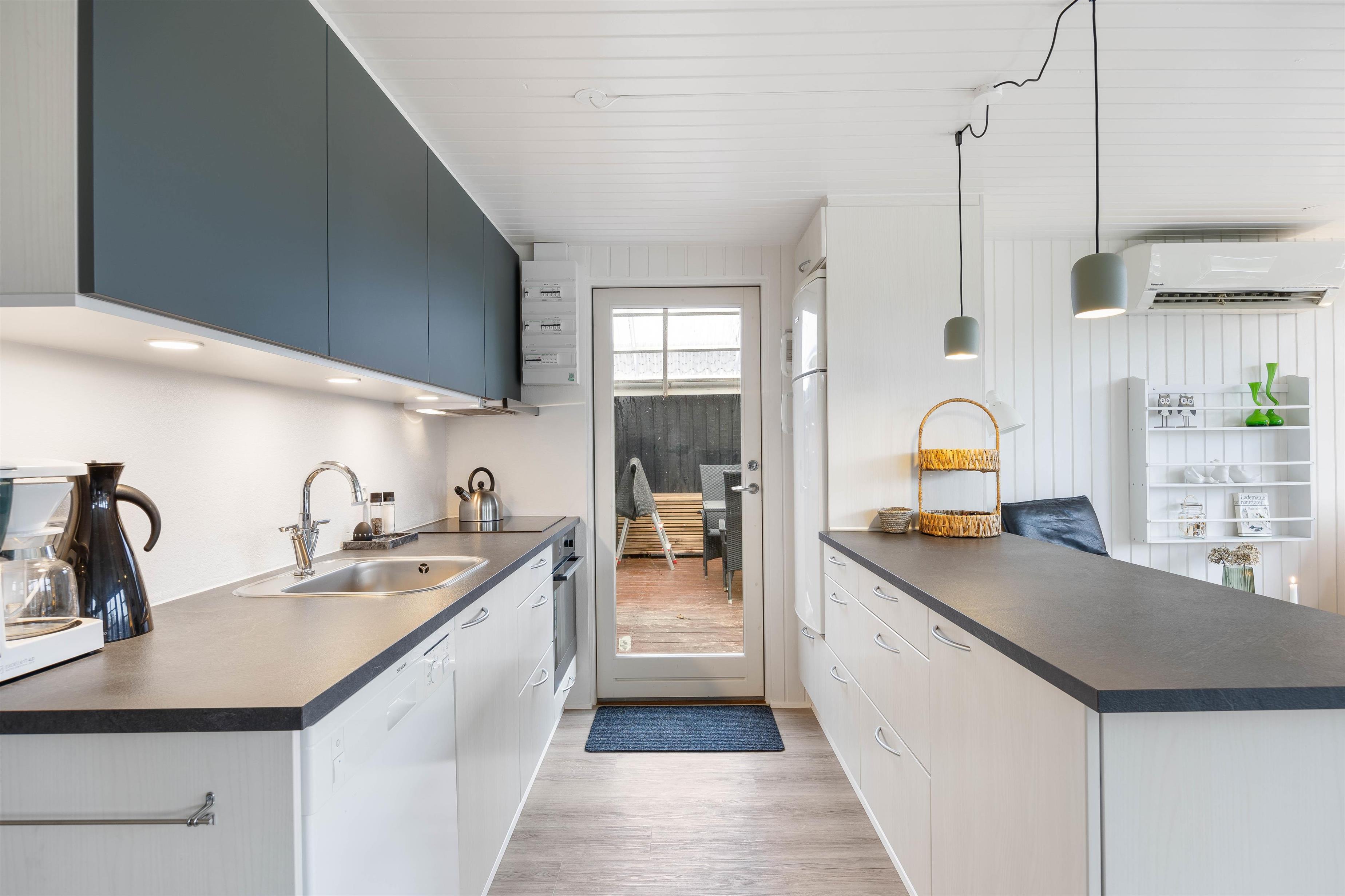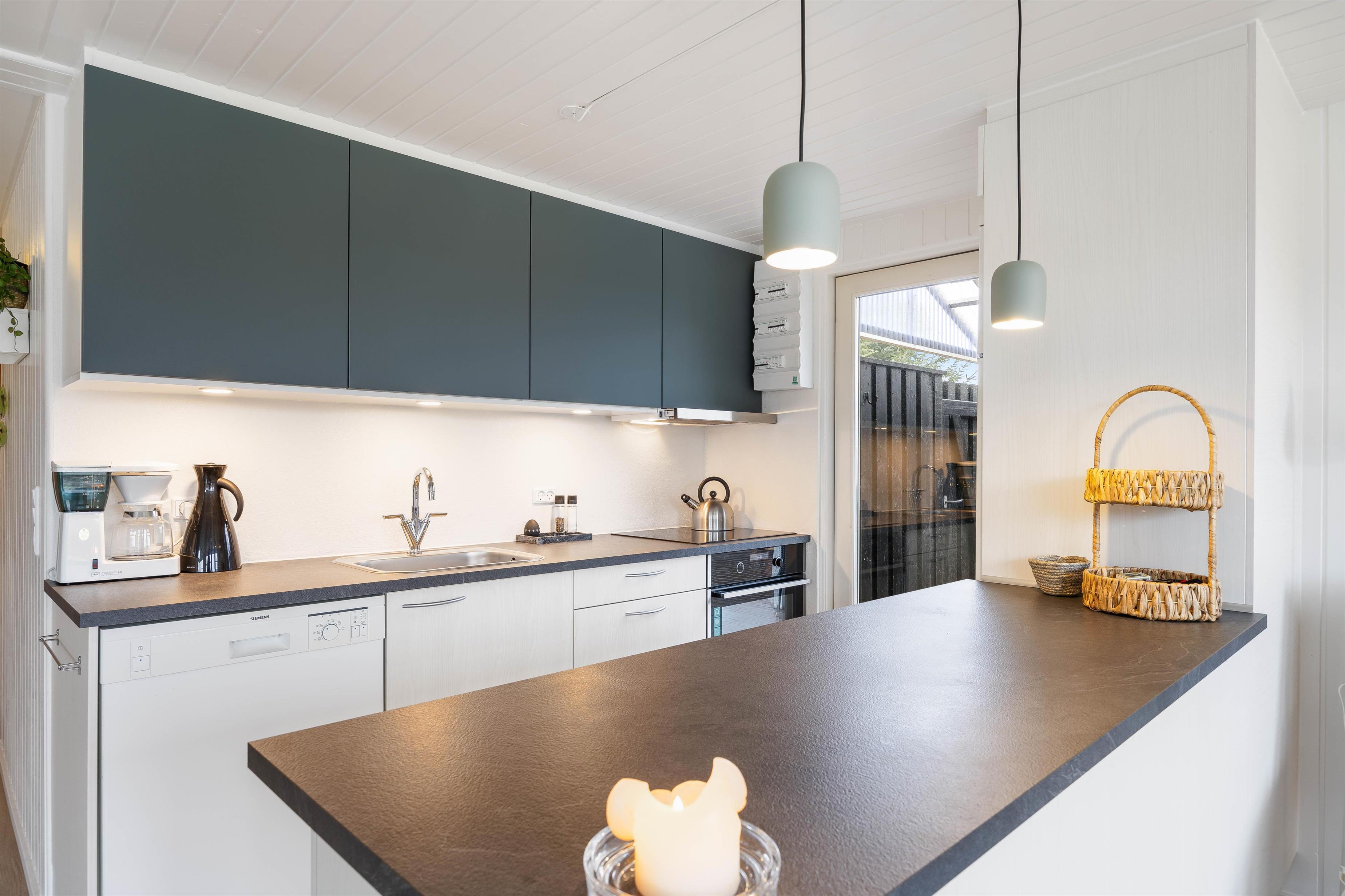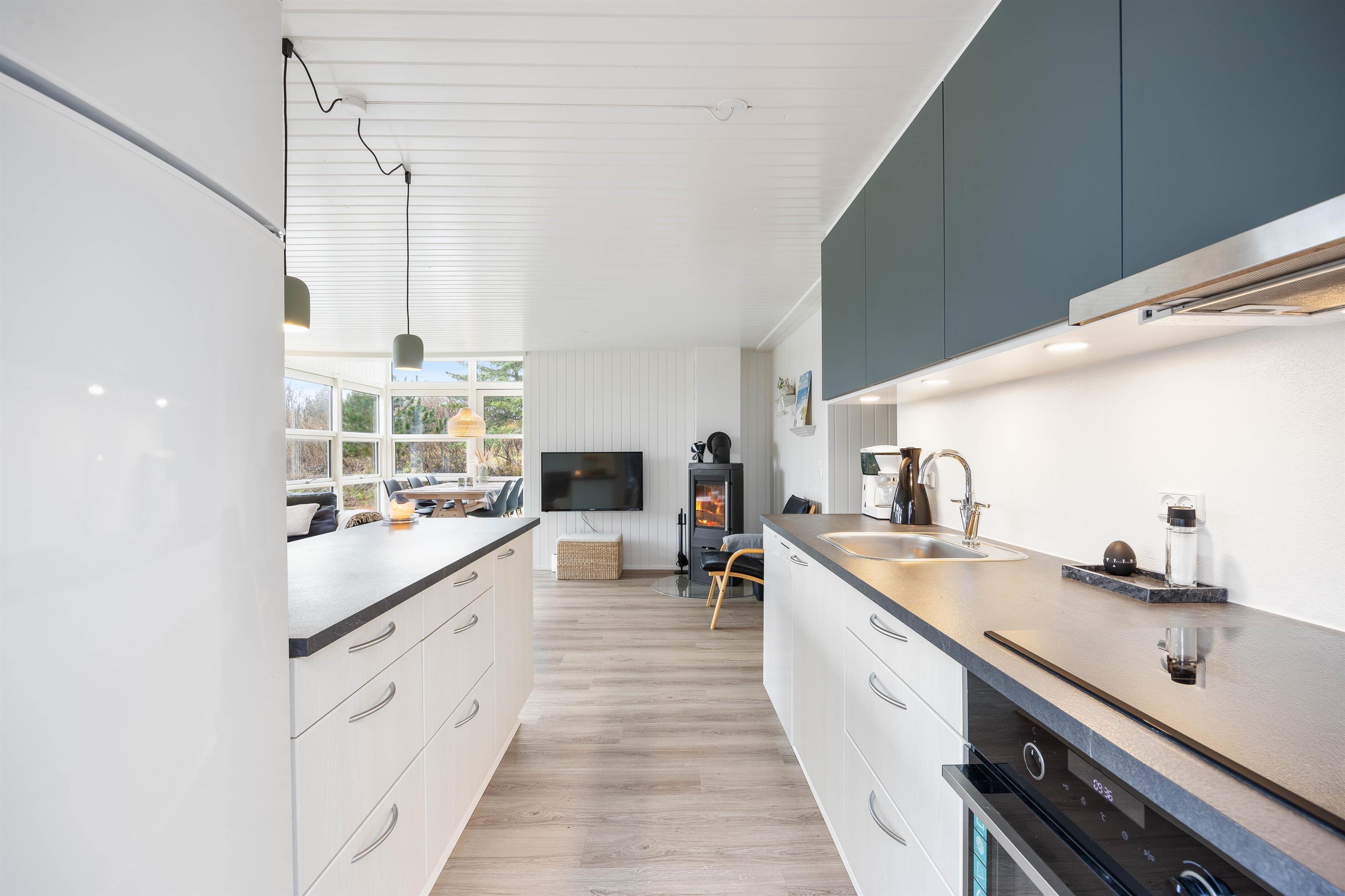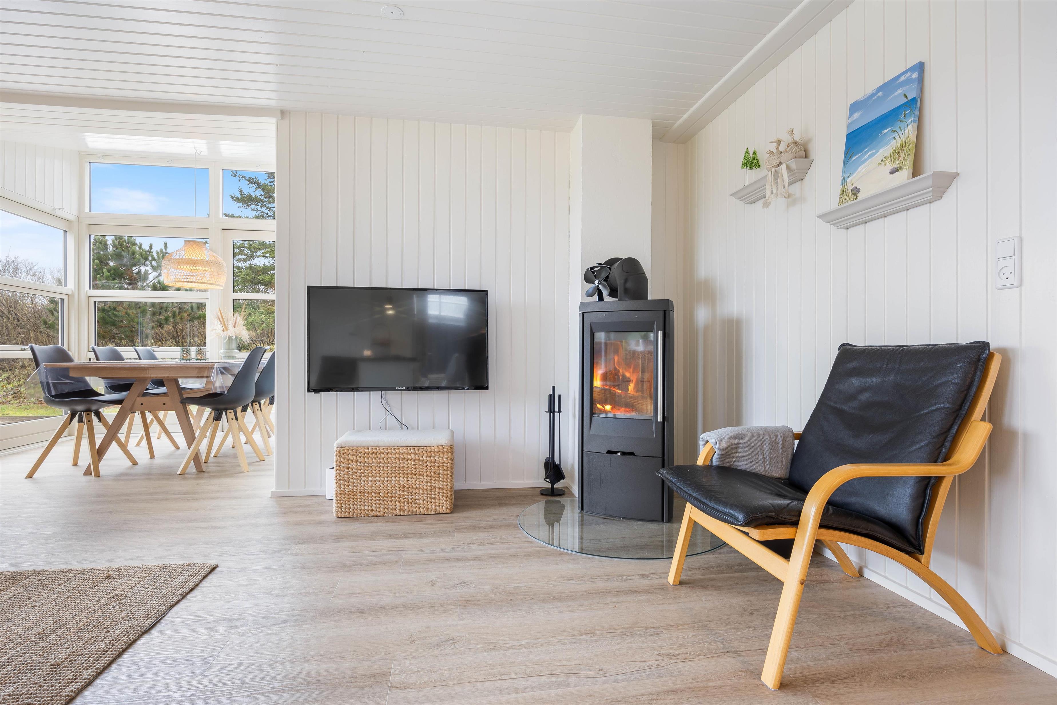 Man føler sig hjemme, straks man træder ind ad døren til Sigfred Jensens Vej 25. Feriehuset er renoveret i 2023, og det fine lysindfald igennem vinduespartierne giver et lyst og venligt udtryk. I stuen kan I samles til måltiderne omkring spisebordet, spille et brætspil eller hygge jer i sofaen foran de knitrende brændeknuder i brændeovnen. Køkkenet indeholder alt, hvad I har brug for til at forkæle hinanden med lækre, hjemmelavede måltider, herunder opvaskemaskine og induktionskomfur.