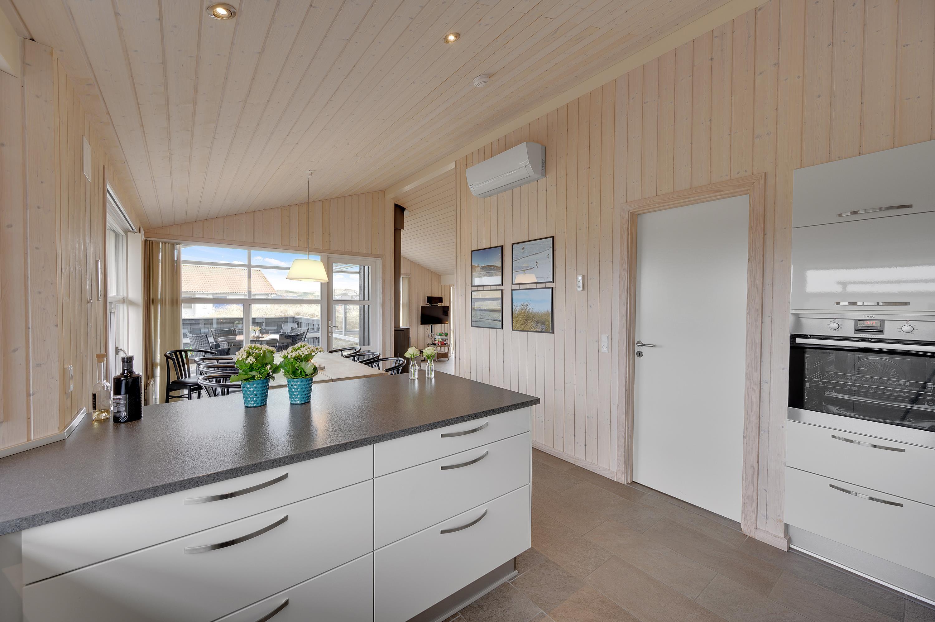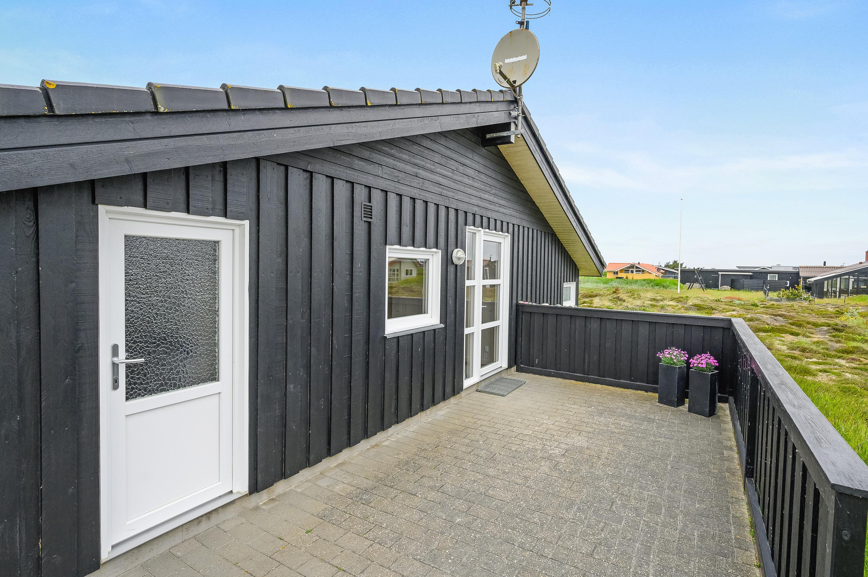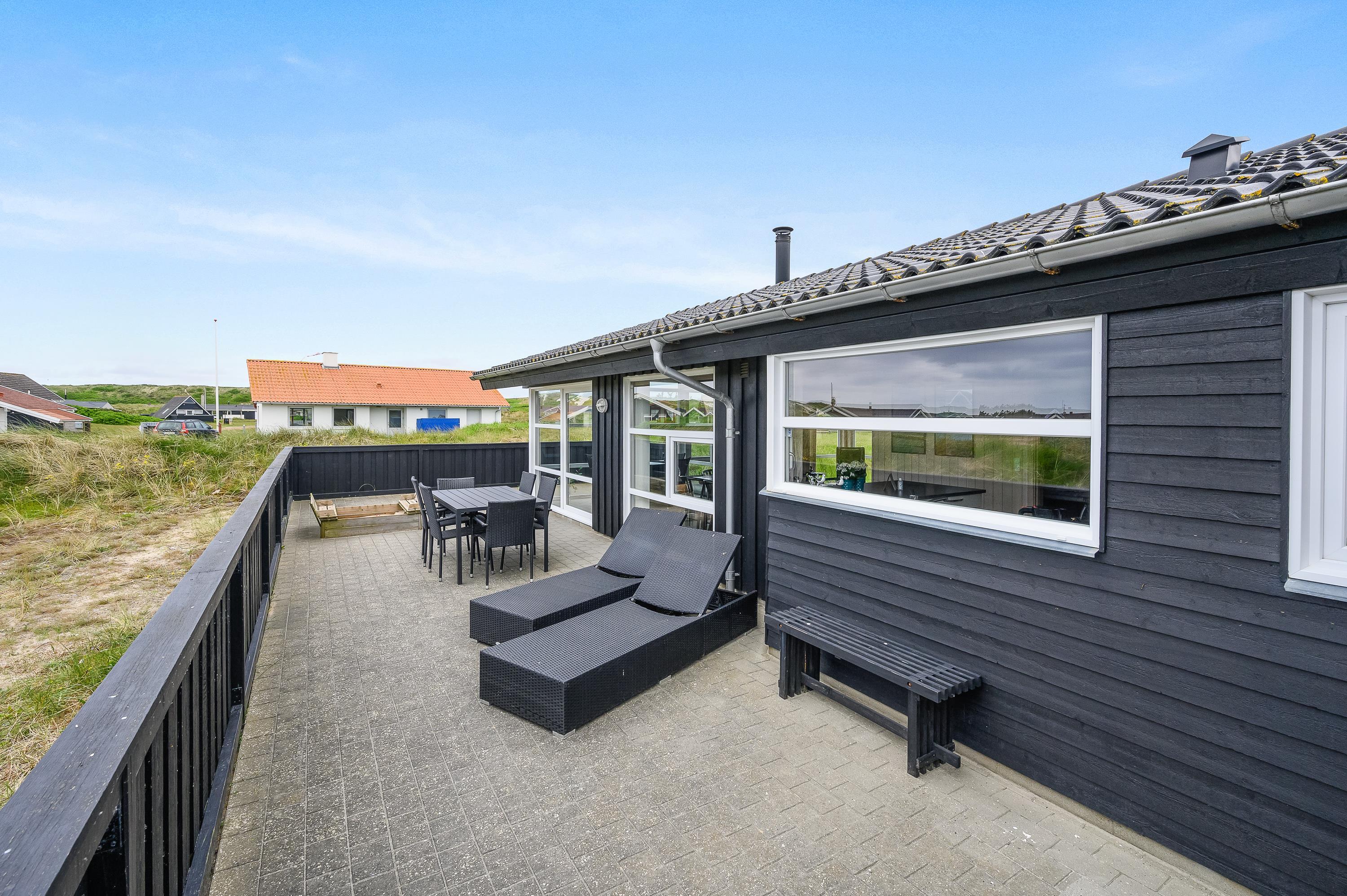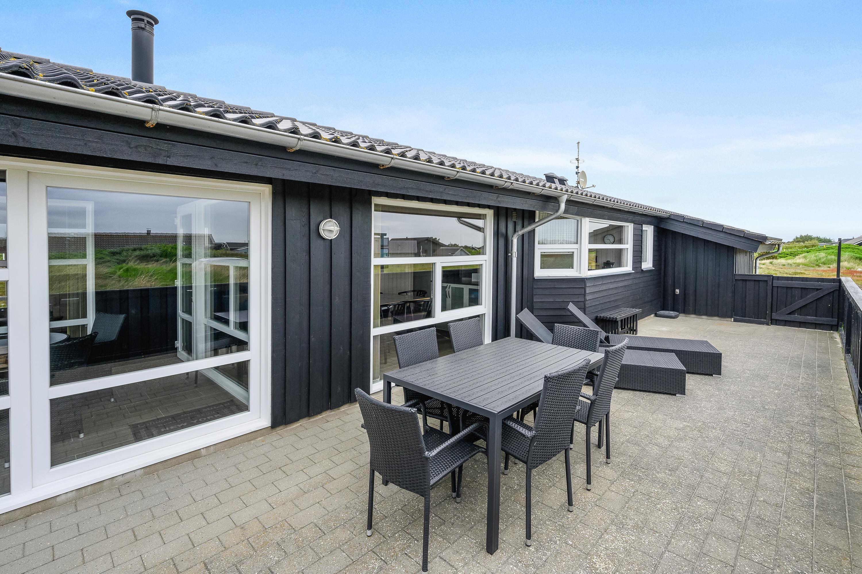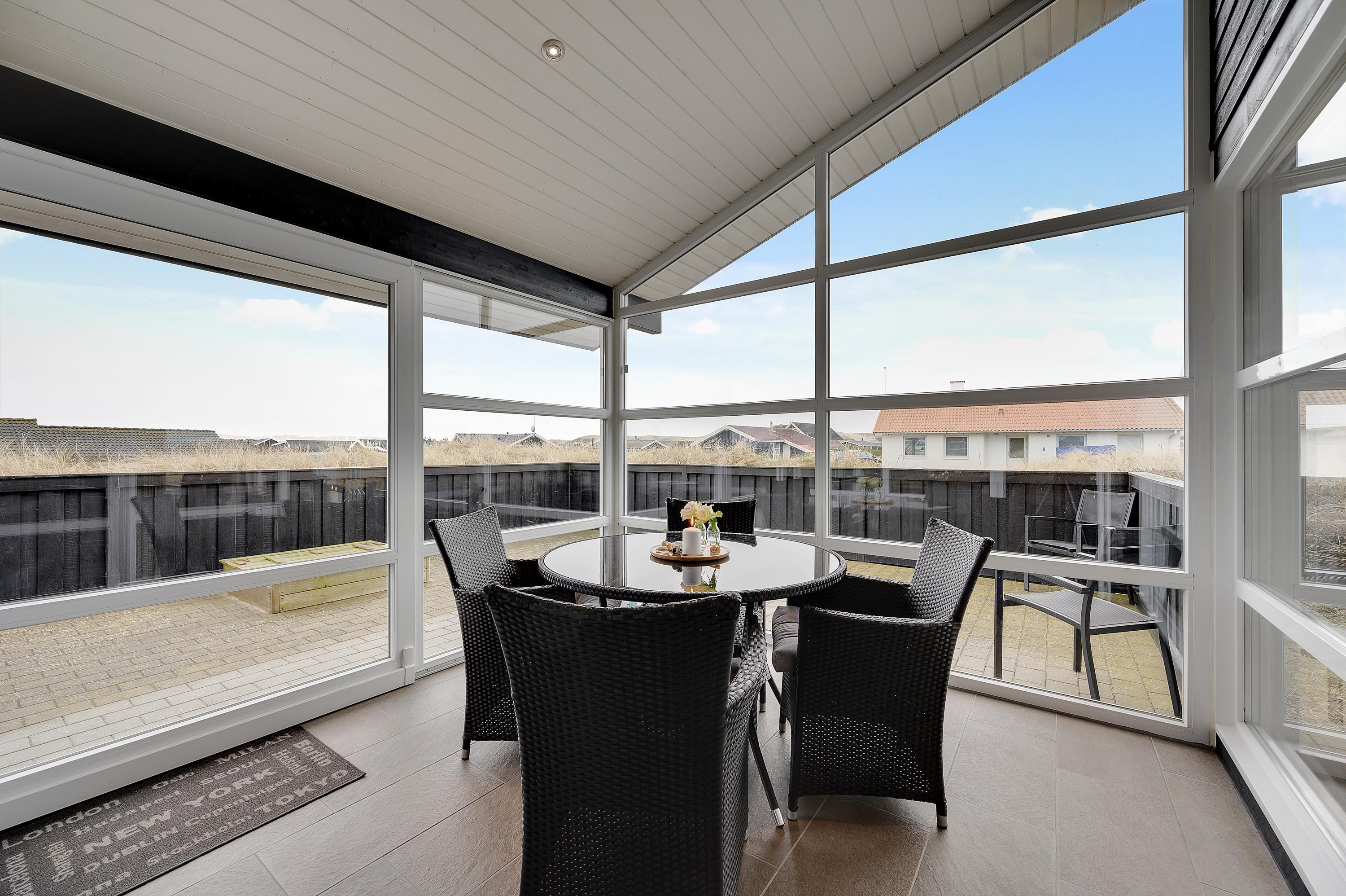Bliver blæsten for vild, eller regner det, så kan I alligevel godt holde en hyggelig grillaften med udsigt til klitterne; i den dejlige udestue har I nemlig altid læ for den, til tider, lunefulde natur. Fra udestuen er der adgang til den store lukkede og delvist overdækkede terrasse.