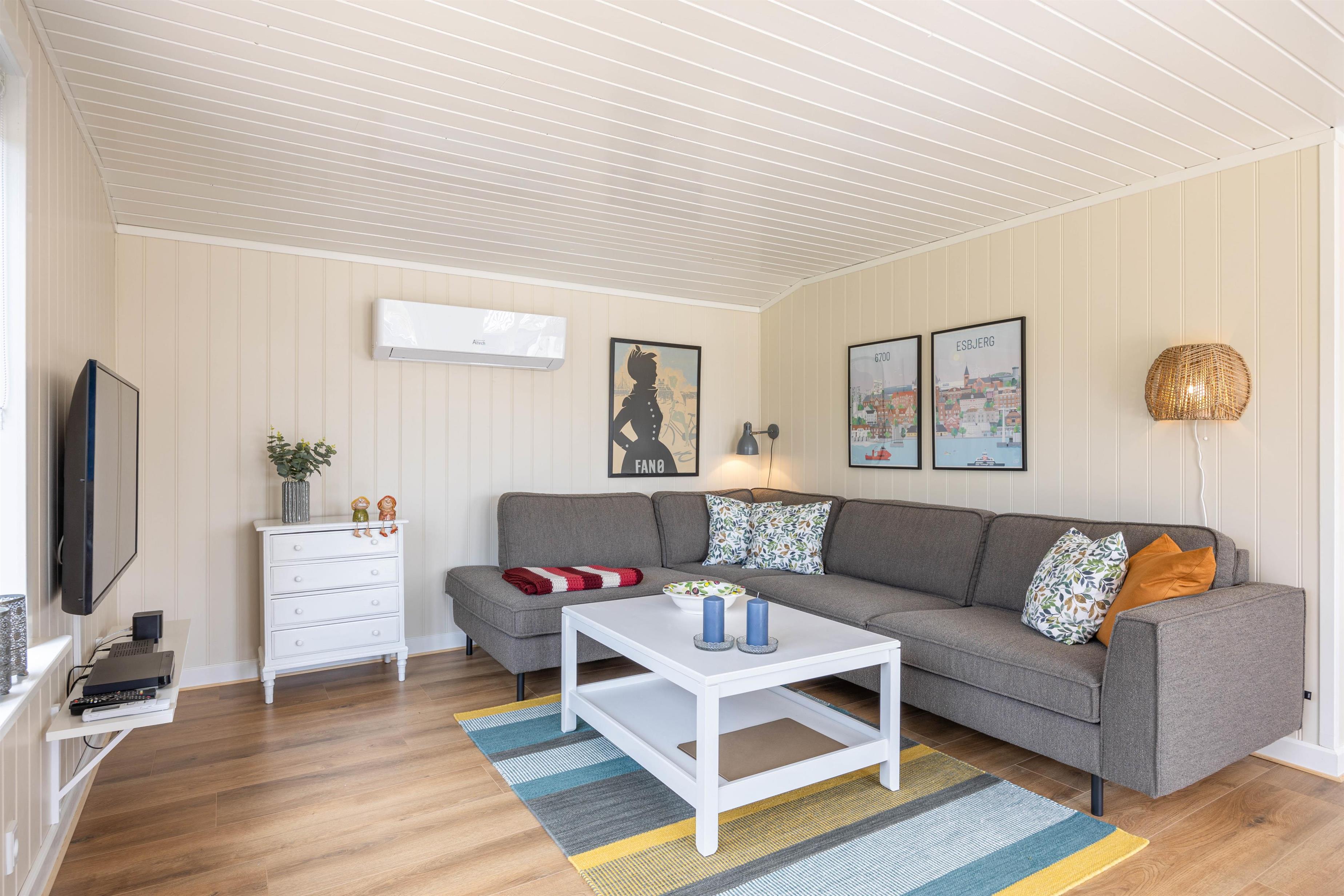I det lille velindrettede sommerhus findes en lys stue, som ligger i forbindelse med det nye køkken. Gennem de store vinduer kan I nyde dagens sidste solstråler, hvad end I har slået benene op på sofaen med et godt glas eller spiller brætspil ved spisebordet. Feriehusets hjerte varmes op af en strømbesparende varmepumpe.