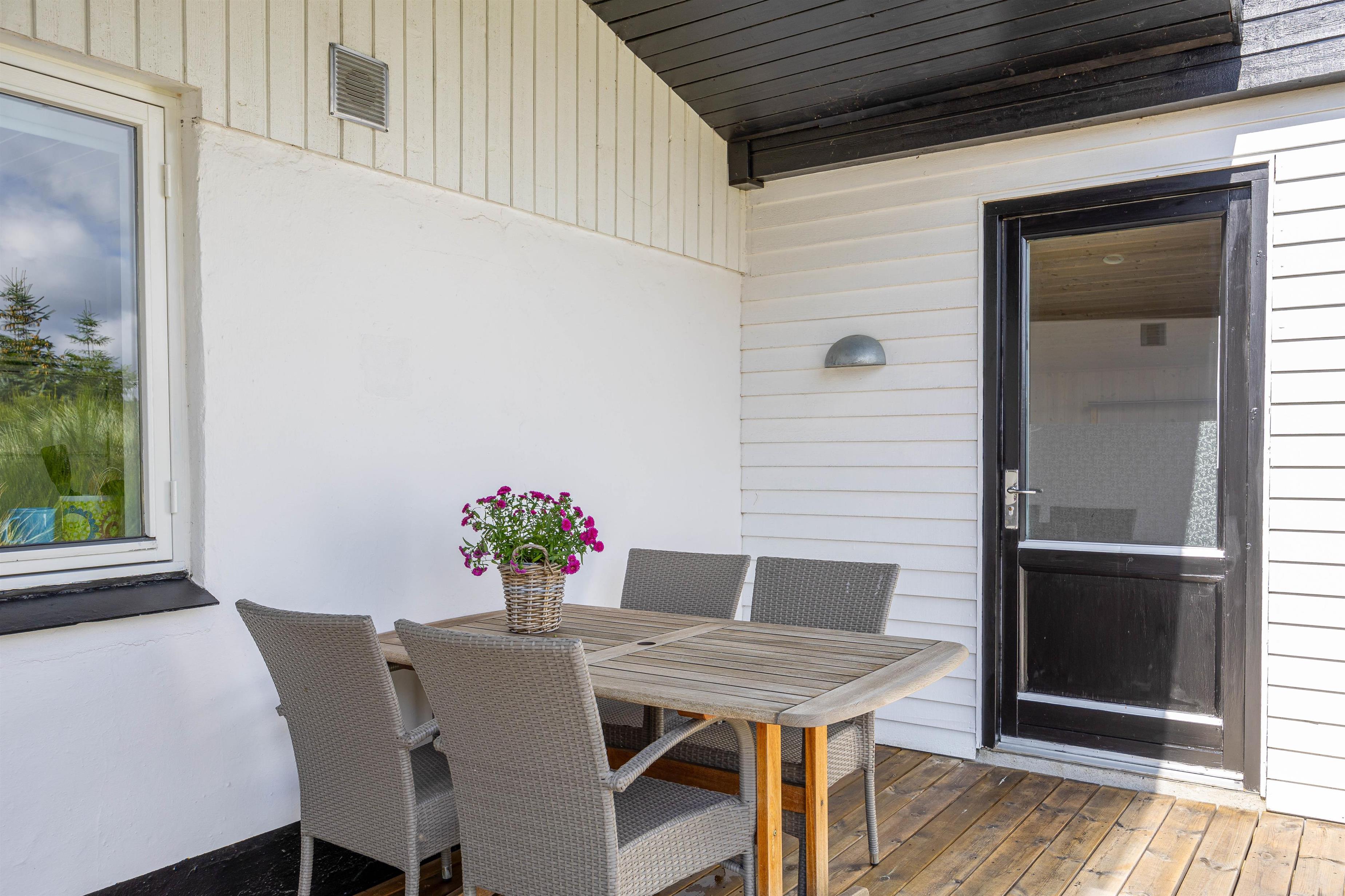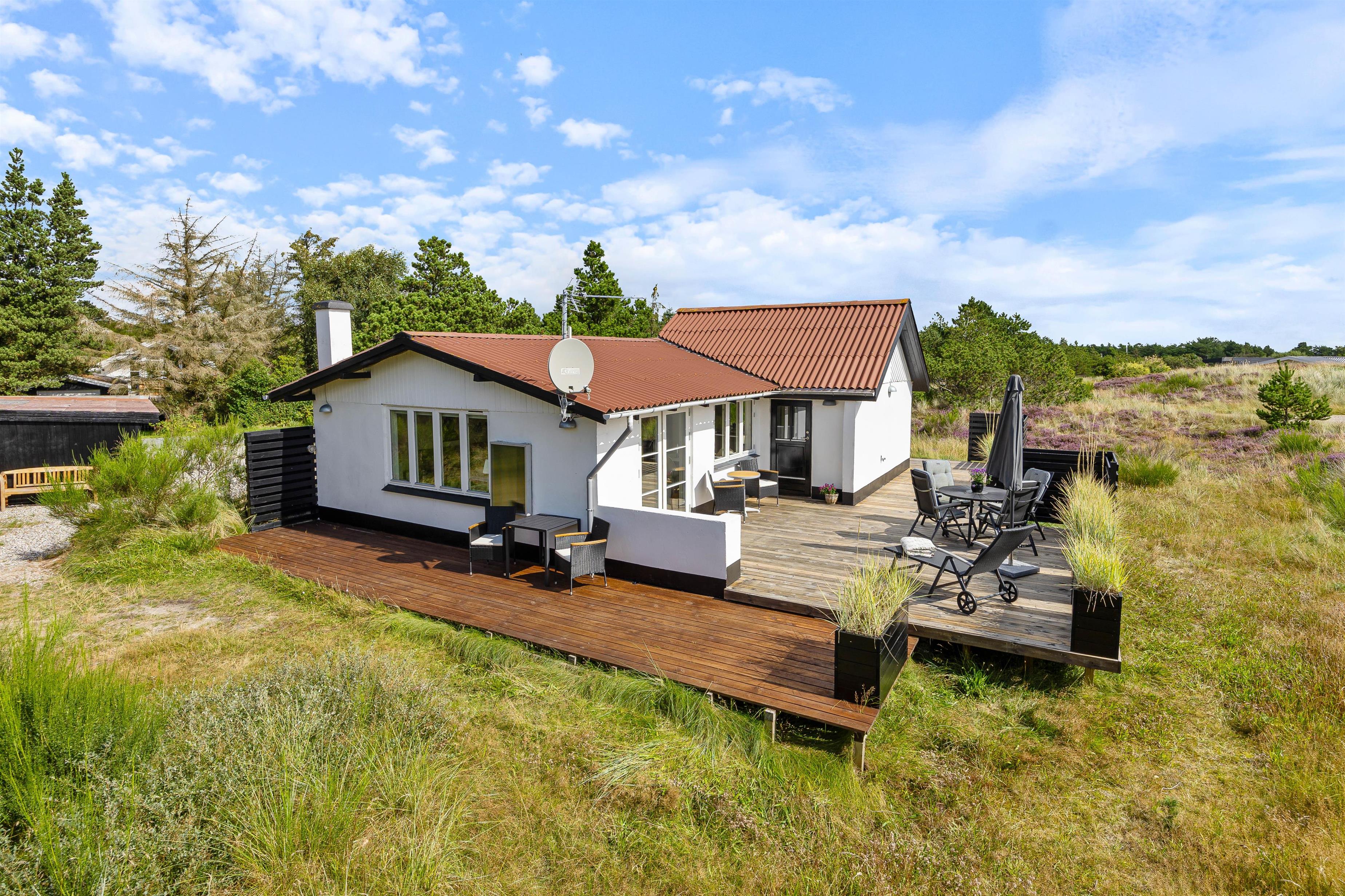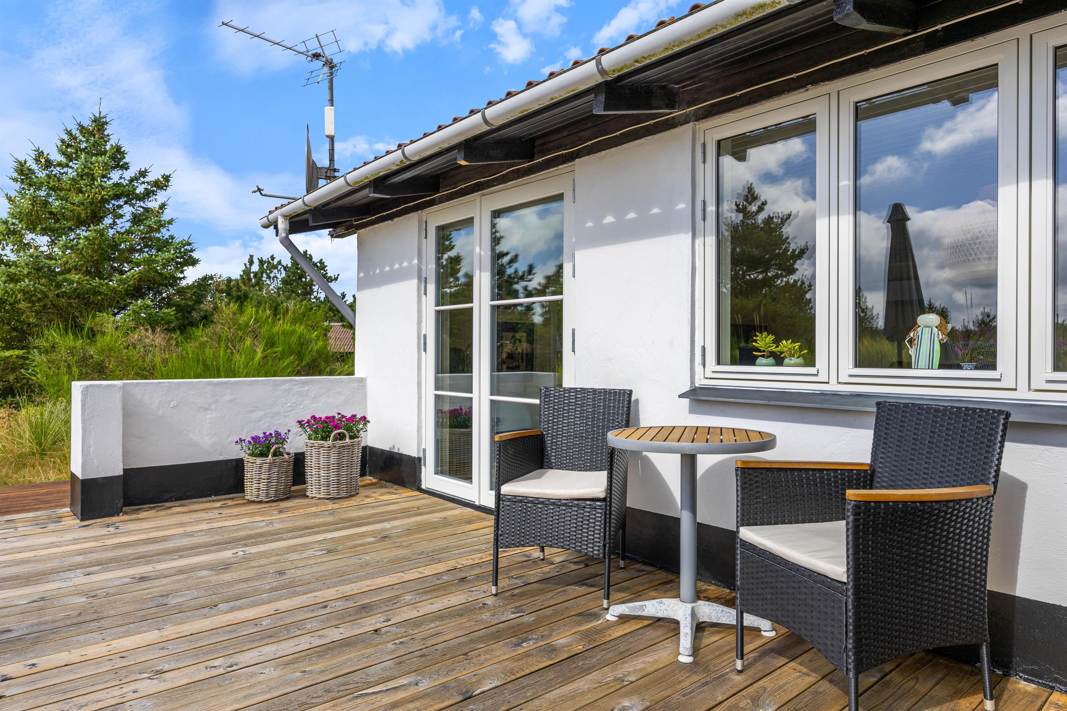 Sommerhuset har en stor træterrasse, som er vendt mod flere hjørner. På den måde kan I nyde solen i mange timer, blandt andet fra feriehusets liggestol, mens I har øje på børnene, som kan lege i sandkassen eller i klitterne. En del af terrassen er også overdækket, hvilket giver mulighed for at forlænge sommeren eller blot nyde morgenkaffen, når vejret bliver en smule køligere. Her kan I også sidde at nyde grillmaden, som er tilberedt på gasgrillen.