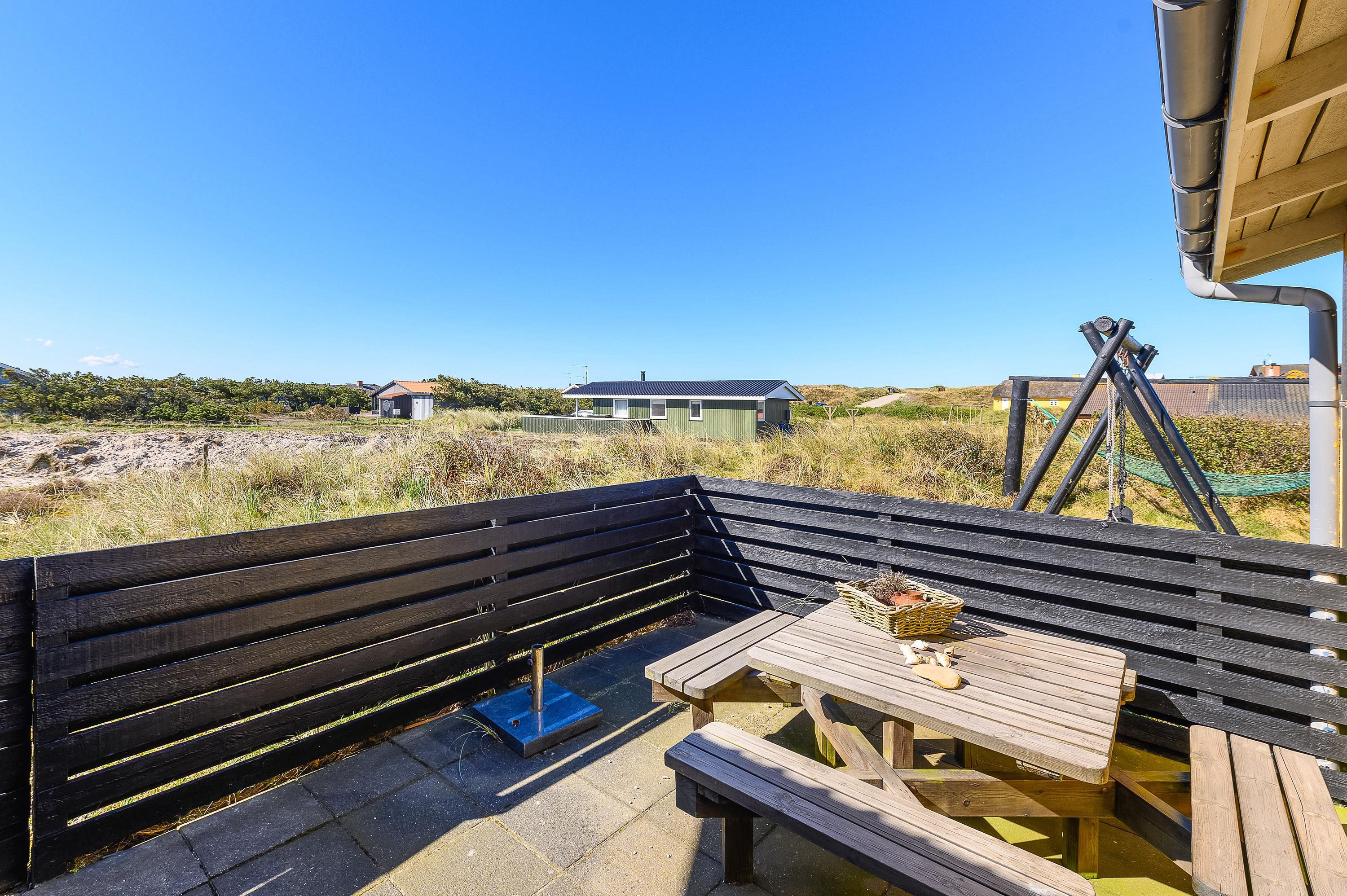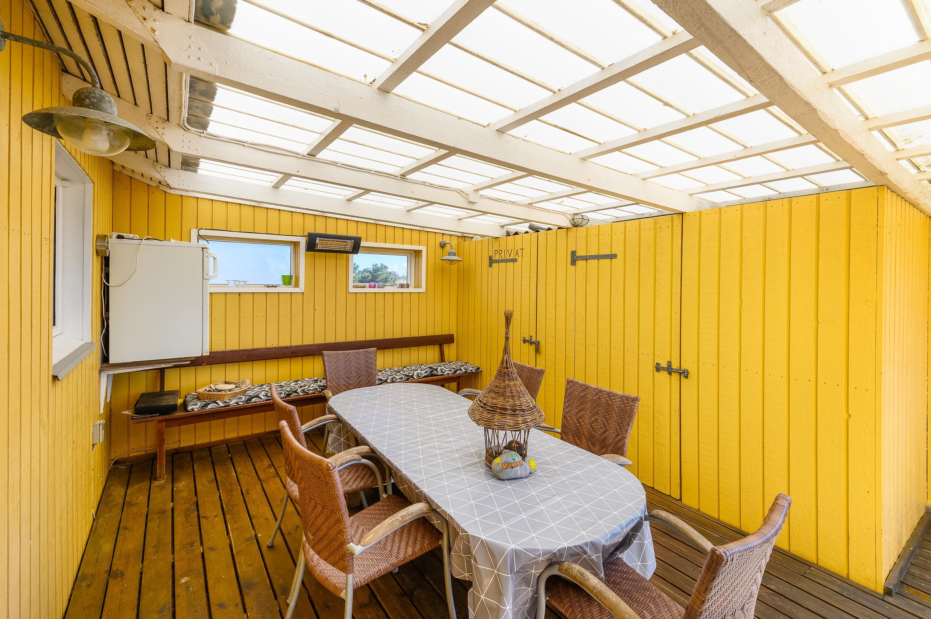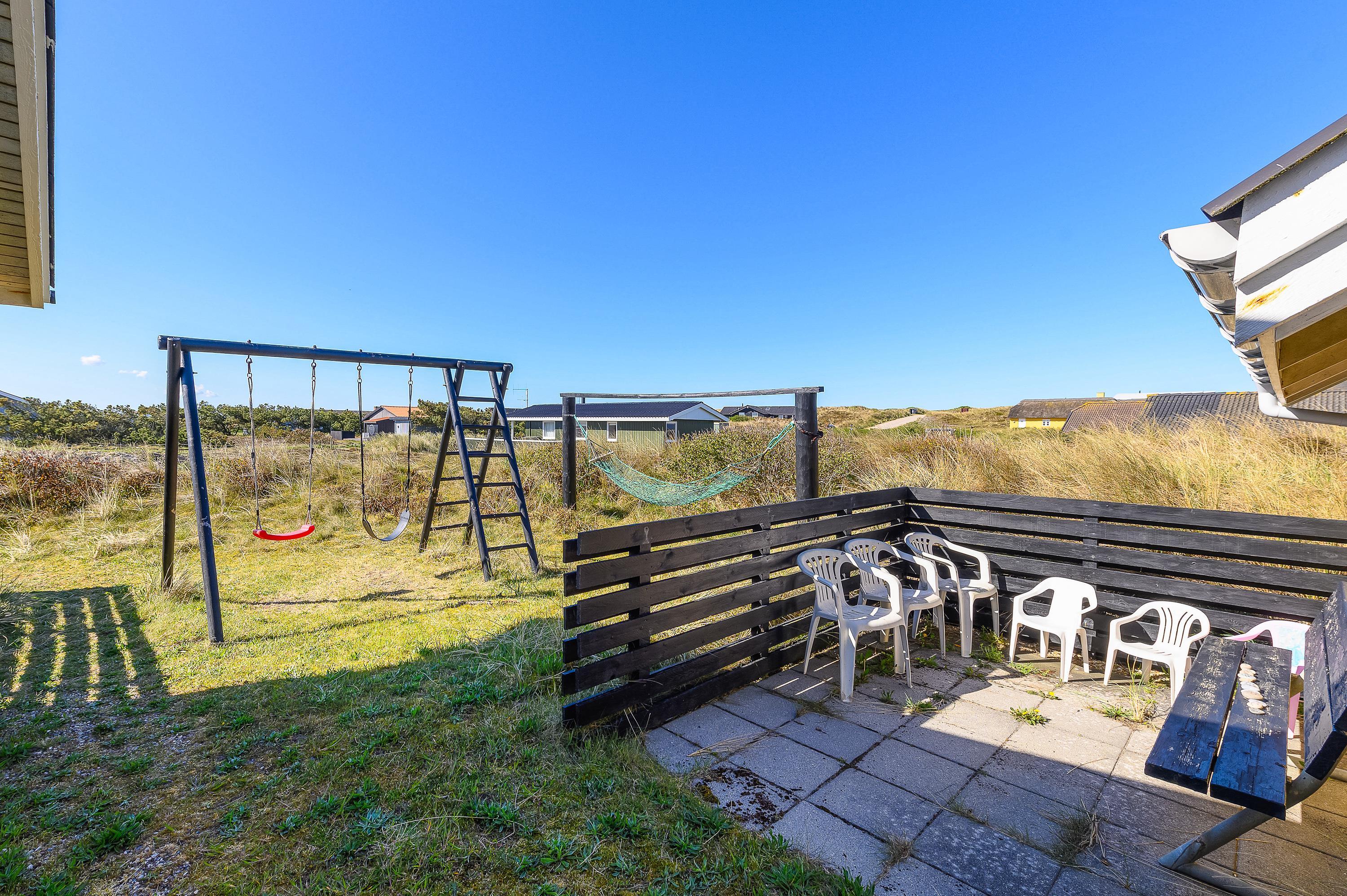 På terrasserne er der rigtig gode muligheder for at nyde den friske luft, – også på en regnvejrsdag. Den overdækkede og godt afskærmede terrasse er perfekt til at nyde måltider udendørs. Nyd din morgenkaffe, læs en bog eller grill en friskfanget ørred her. Der er masser af muligheder. Terrassen er udstyret med havemøbler, liggestole og grill. De lukkede terrasser gør, at I trygt kan have mindre børn med på ferie. Her er også sandkasse og gyngestativ, så de kan brænde energi af i løbet af dagen.