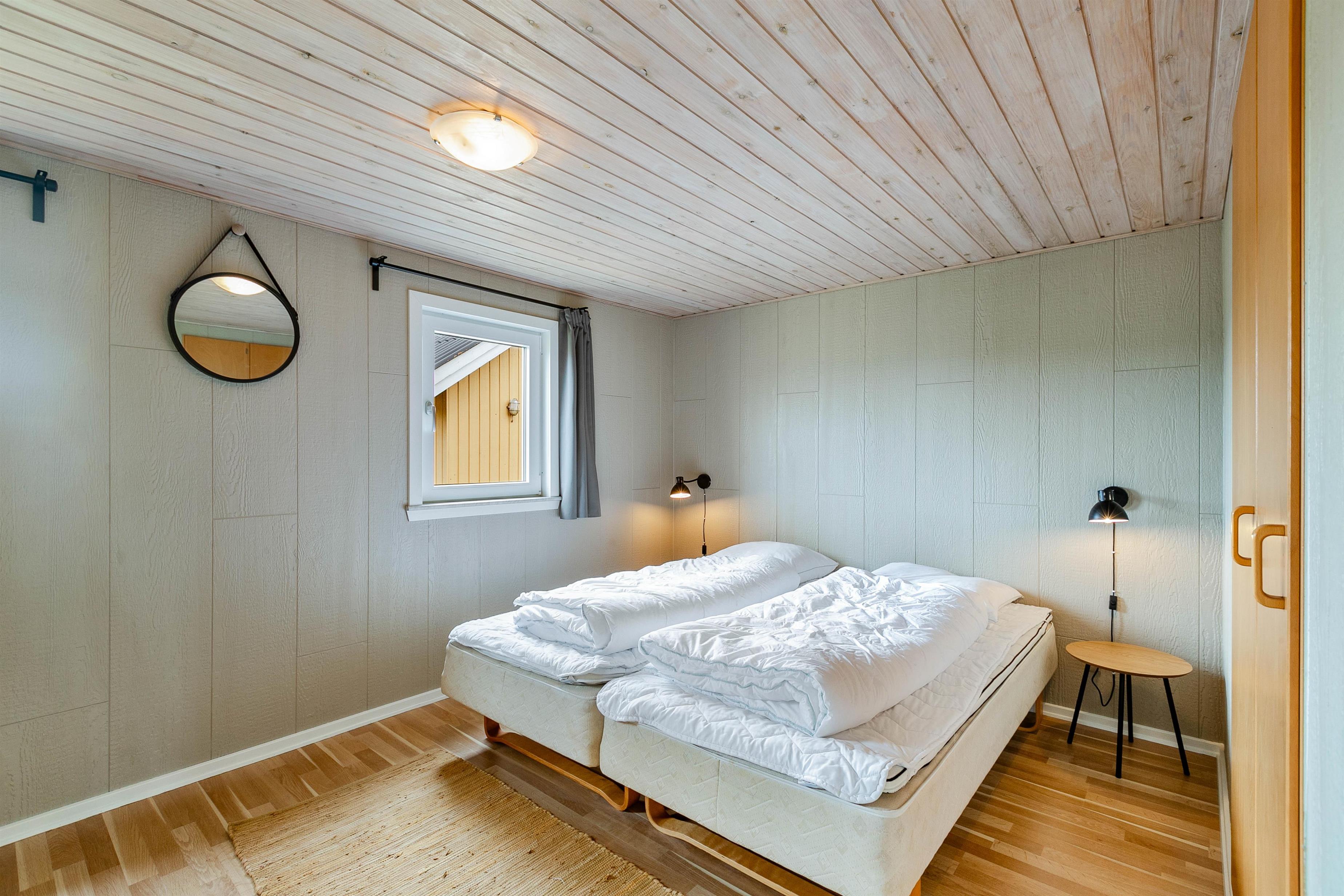 Der er 3 soveværelser i sommerhuset – 2 med dobbeltsenge, og 1 med køjesenge. Badeværelset er rummeligt, og indrettet med bruseniche og gulvvarme. I sommerhuset er også en energibesparende varmepumpe.