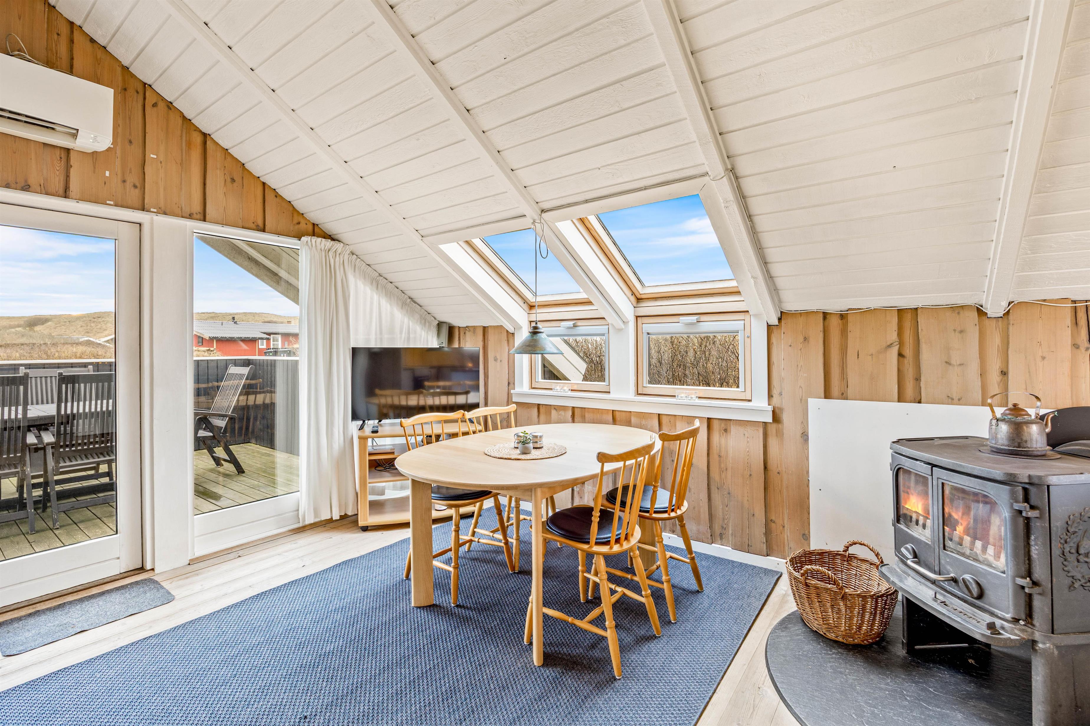 I stuen kan I virkelig mærke hyggen, når I afslutter dagen ved brændeovnen, der spreder en behagelig varme på de kølige aftener, mens den energibesparende varmepumpe sørger for et behageligt indeklima året rundt.