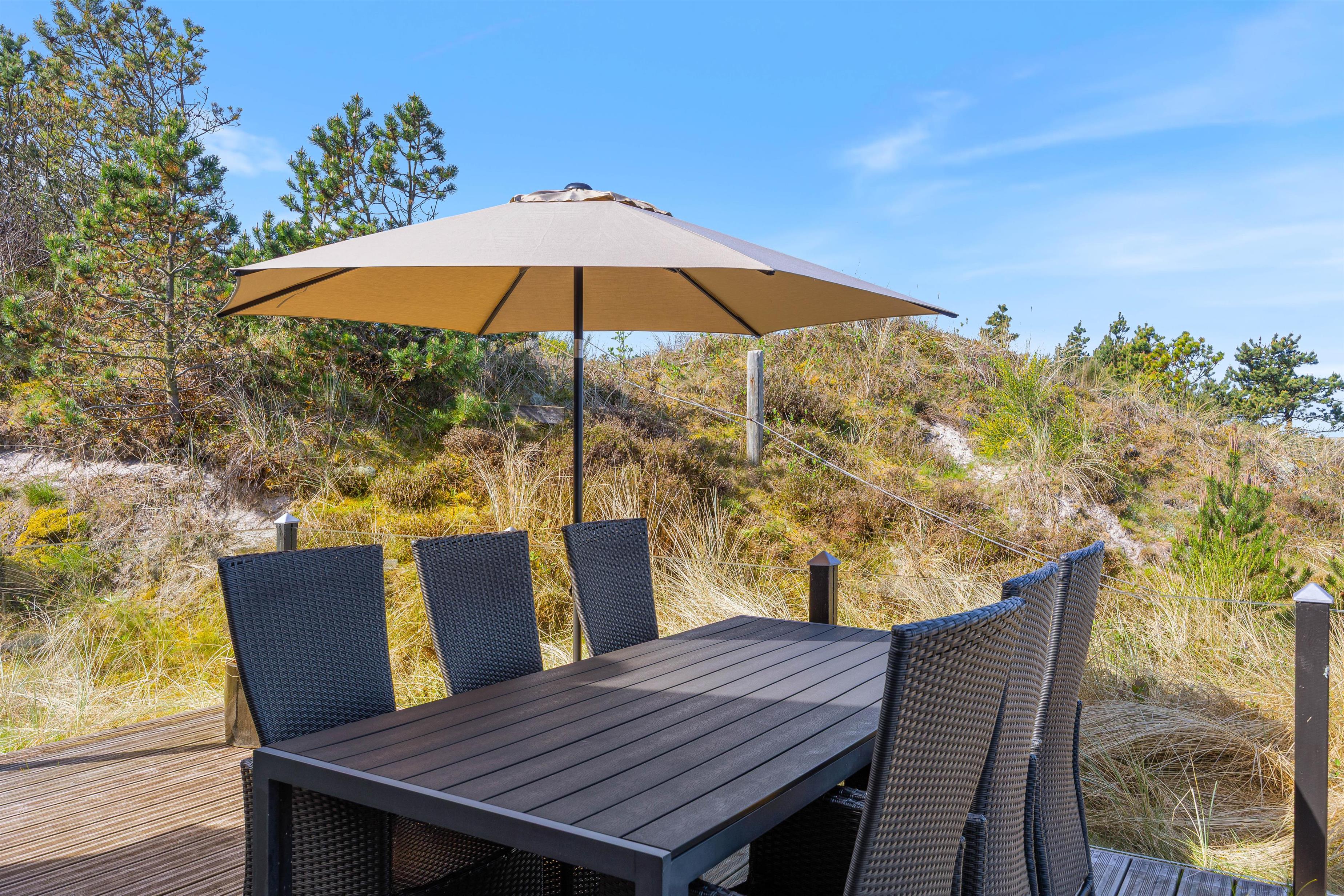 Med et areal på 1221 m² fremstår den kuperede klitgrund som et rigtigt højdepunkt. En gasgrill, komfortable havemøbler og liggestole indbyder til hyggelige grillaftener og afslappende soltimer. Der er et afskærmet terrasseområde samt et overdækket område, som giver beskyttelse og komfort året rundt. Udebruseren er tilgængelig fra april til november og er ideel efter et opfriskende dyp i det nærliggende hav eller en tur i saunaen.