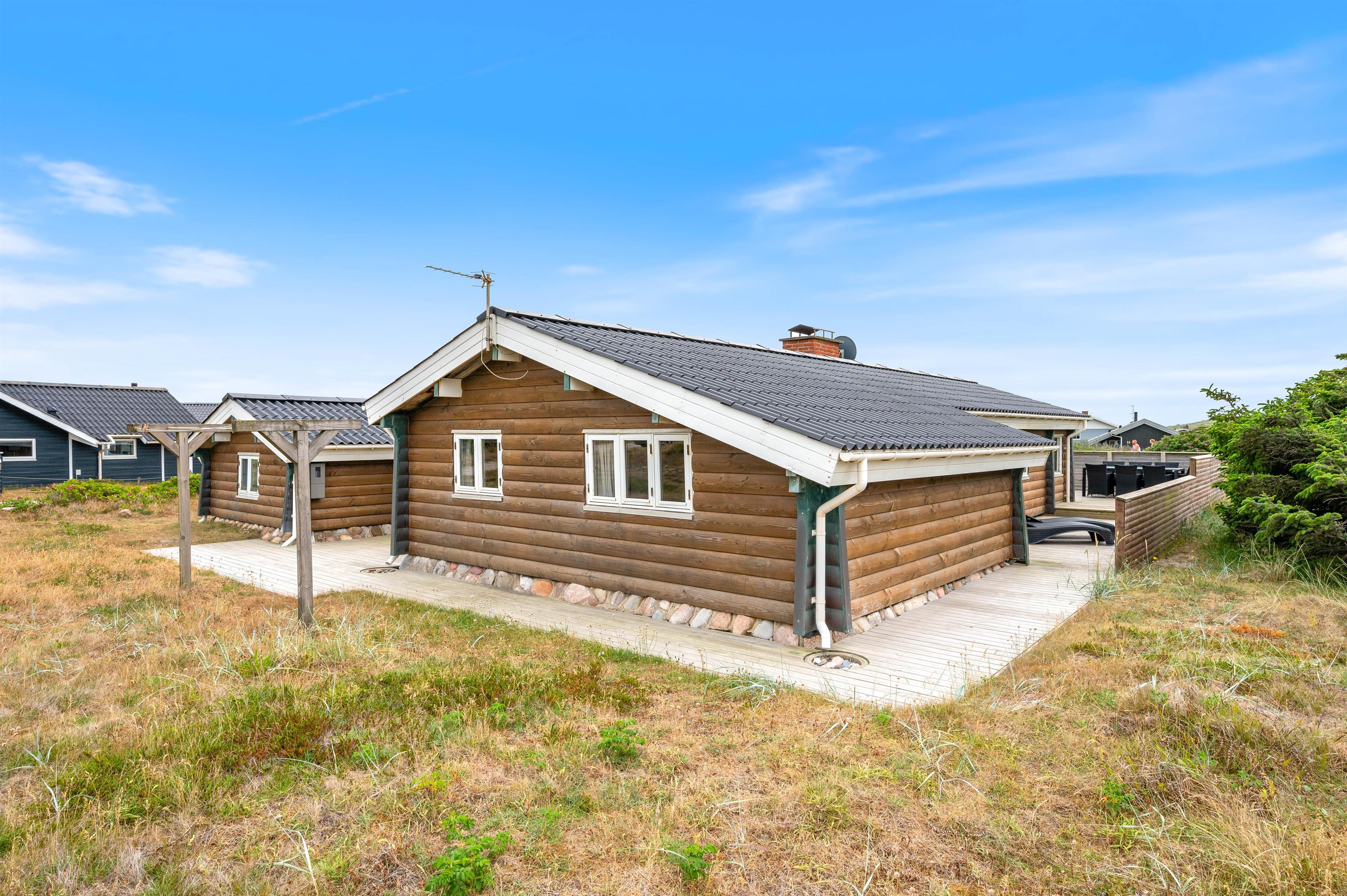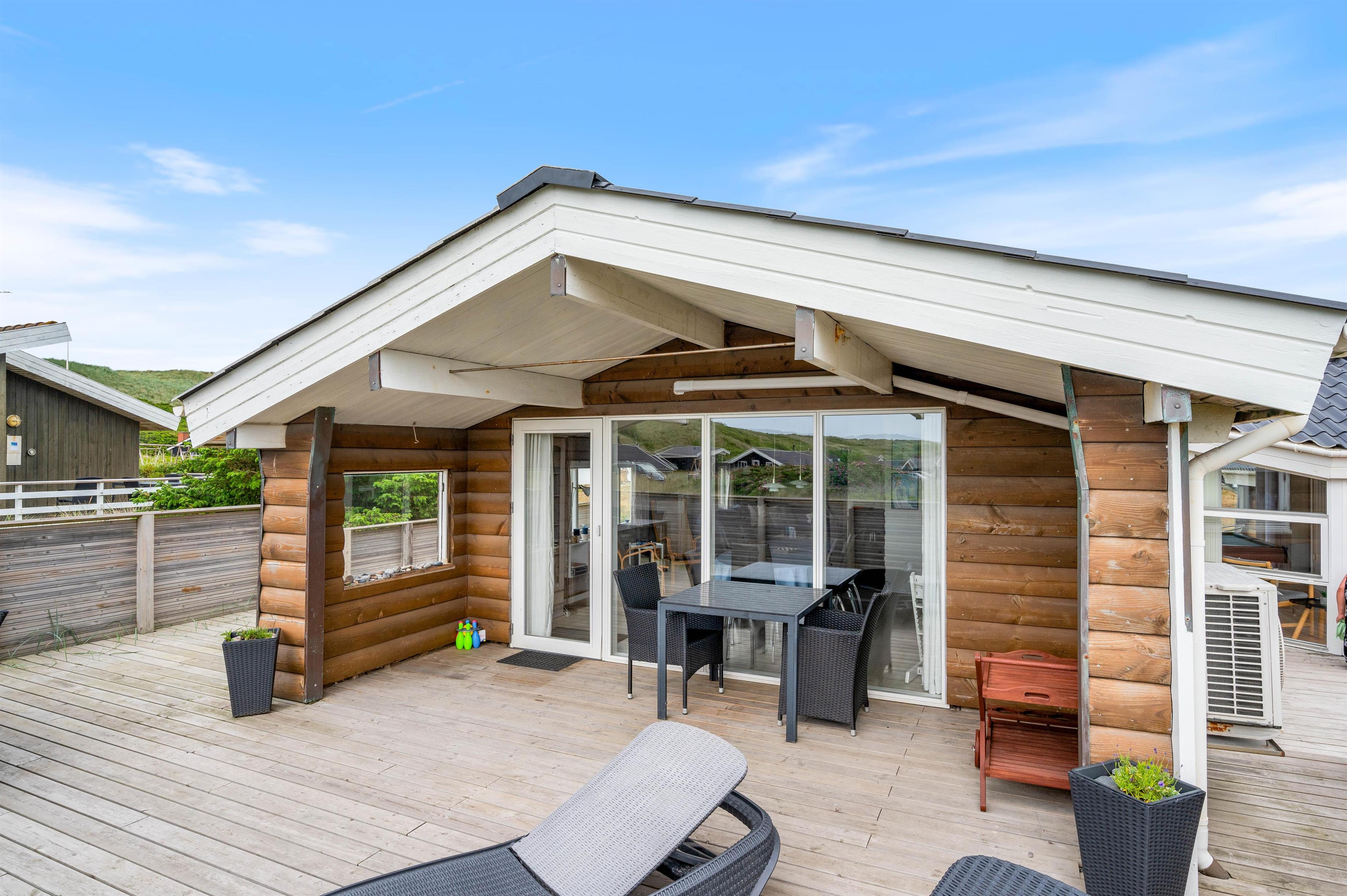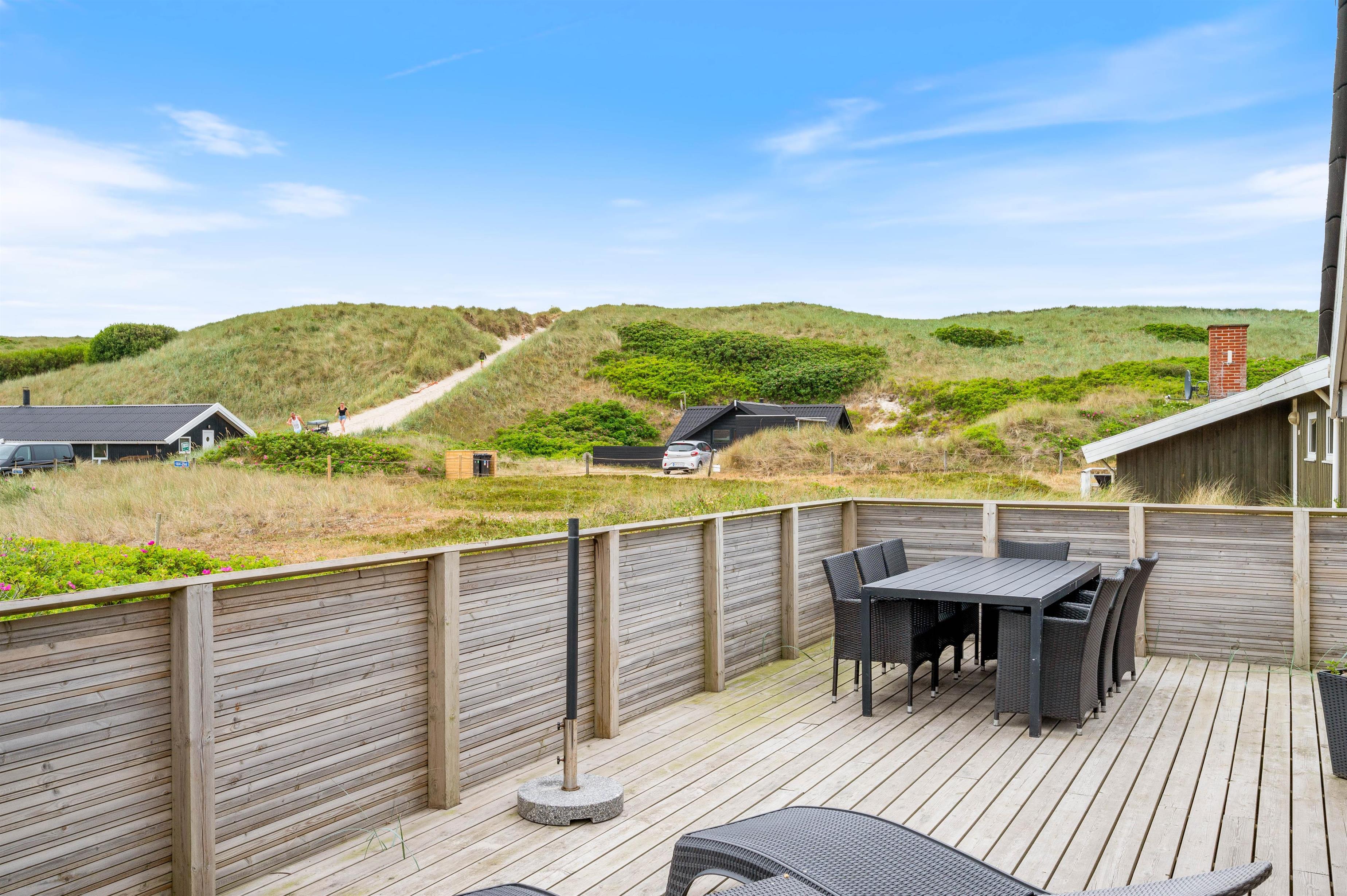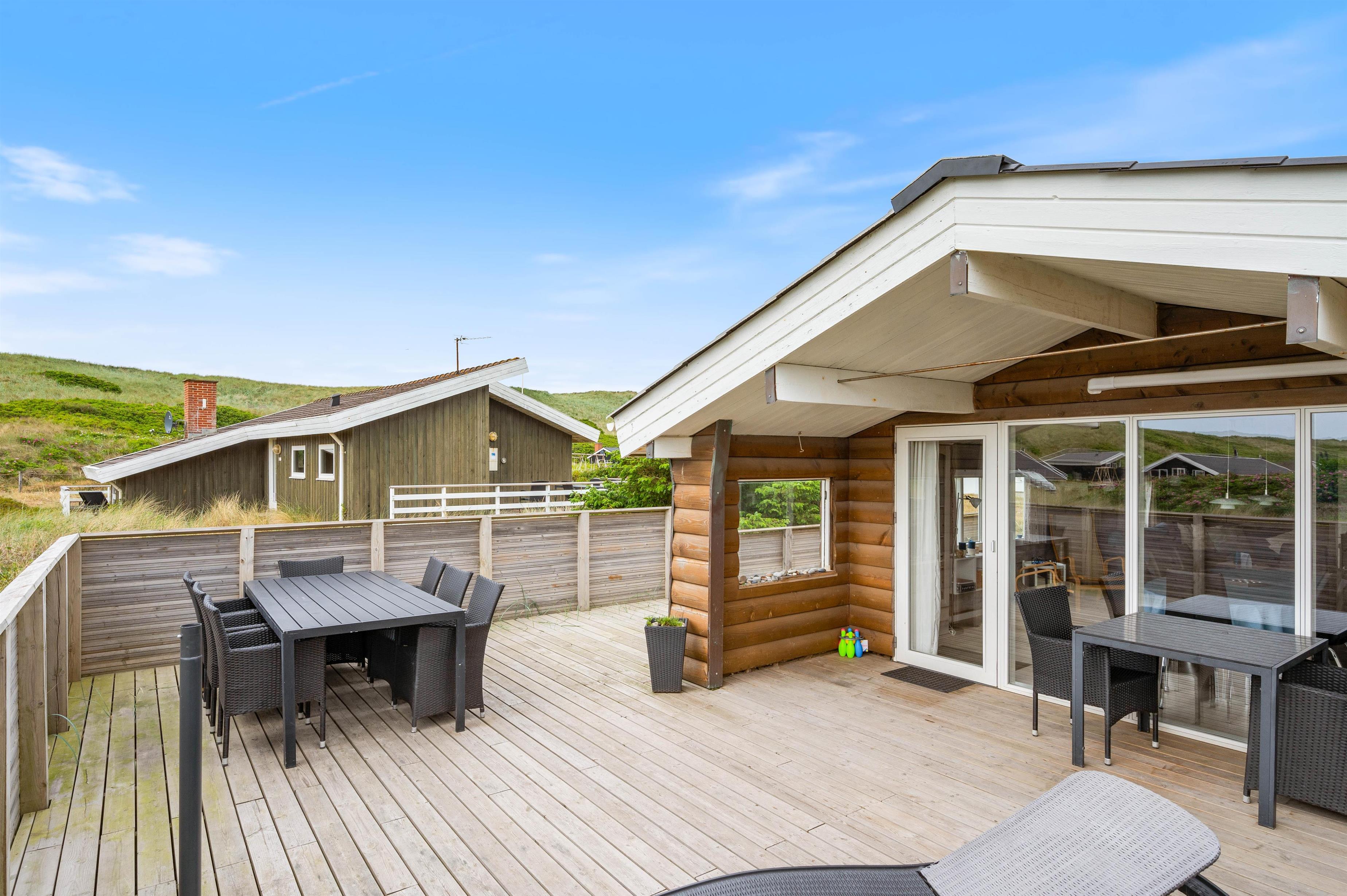 Der er rig mulighed for at nyde solens stråler på terrasserne rundt om huset, og den overdækkede terrasse forlænger ”ude-tiden”. Der er både afskærmede og åbne terrasser. Man vil altid kunne finde en læ-krog, hvor man kan nyde frokosten eller grill-middagen med solnedgangen og havets brusen i baggrunden.