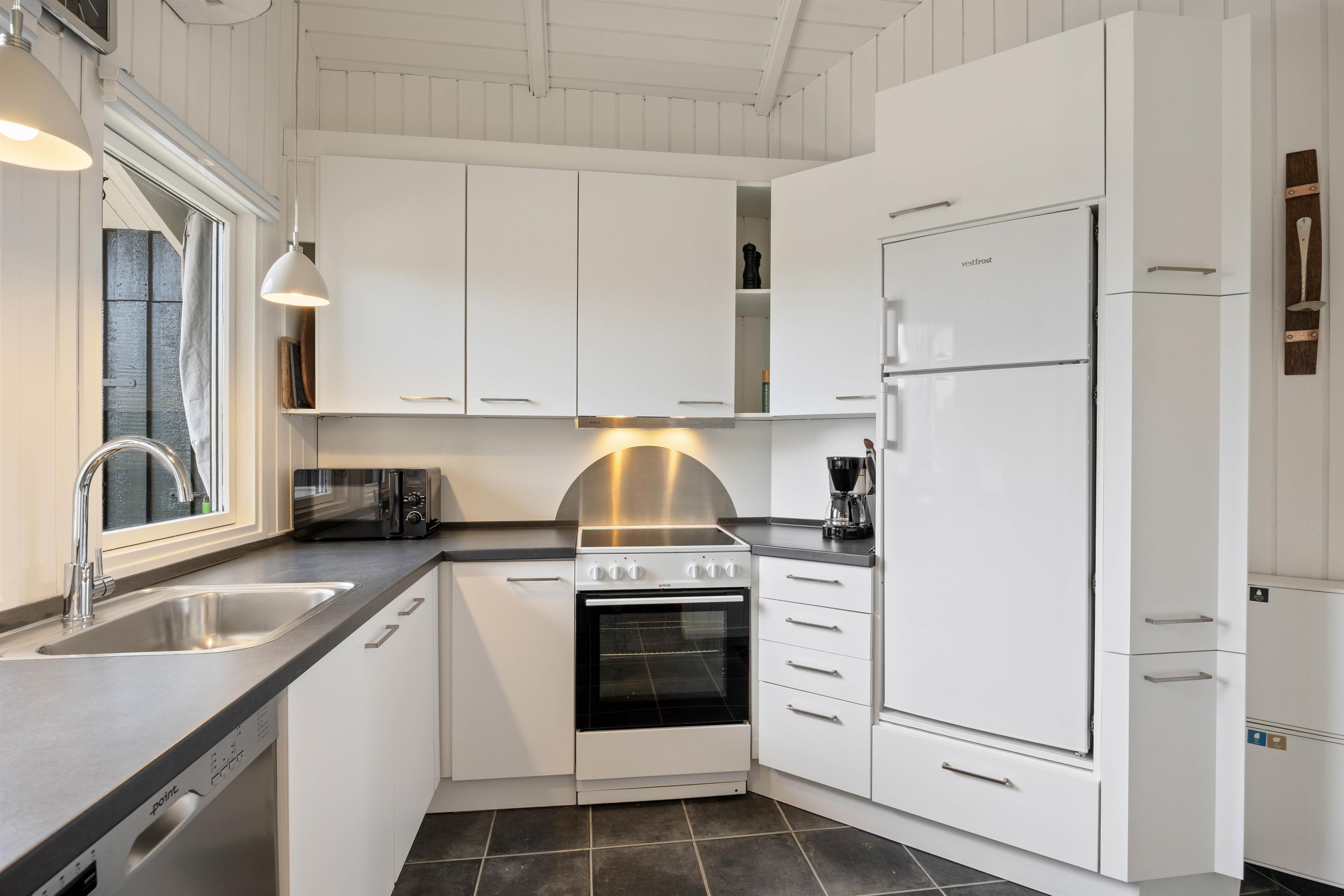 I køkkenet er der laminatgulv, opvaskemaskine, mikroovn og køleskab med frostboks. I stuen er der også trægulv samt træloft til kip, en charmerende brændeovn, et fladskærms-TV og Chromecast.