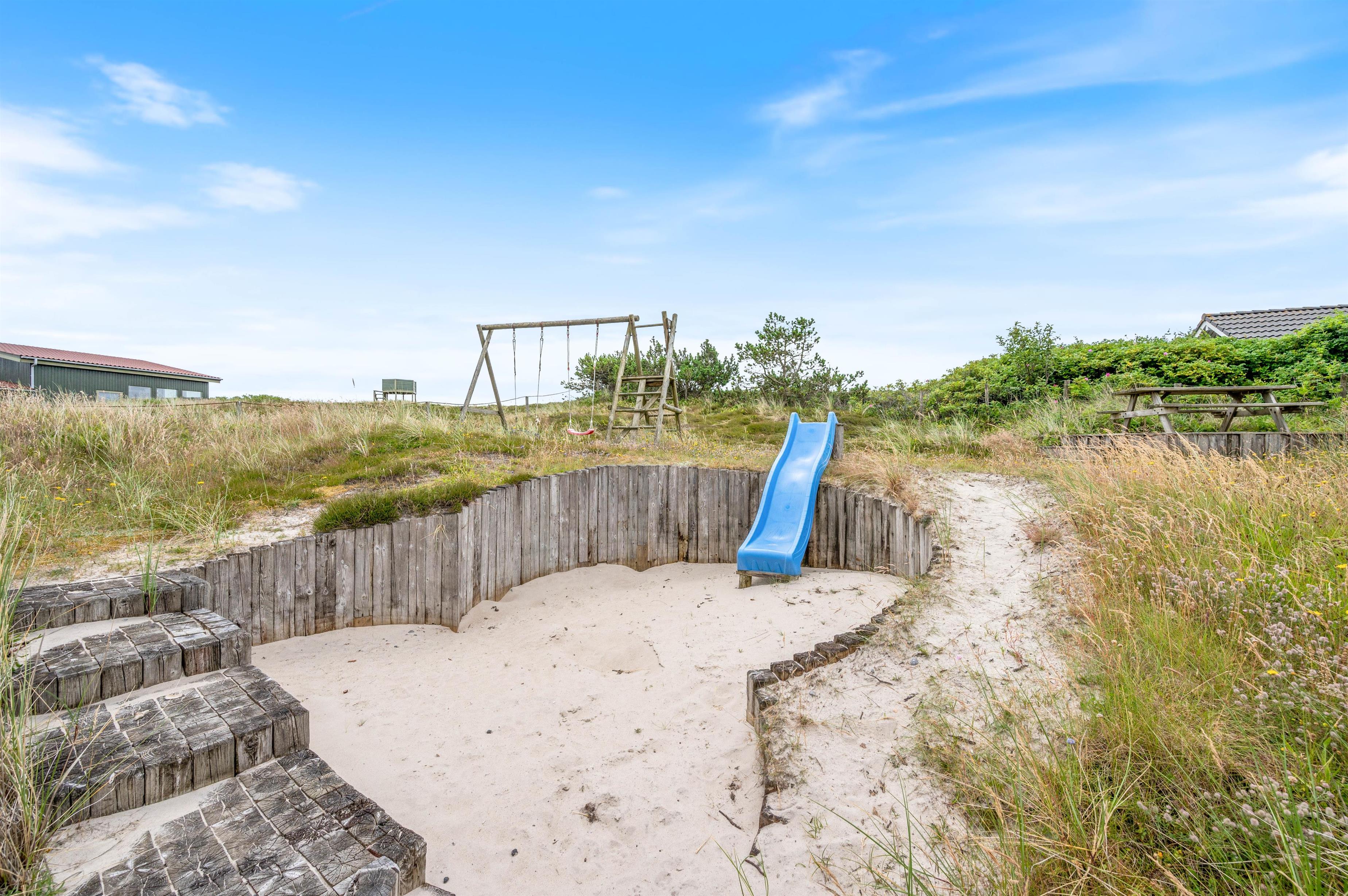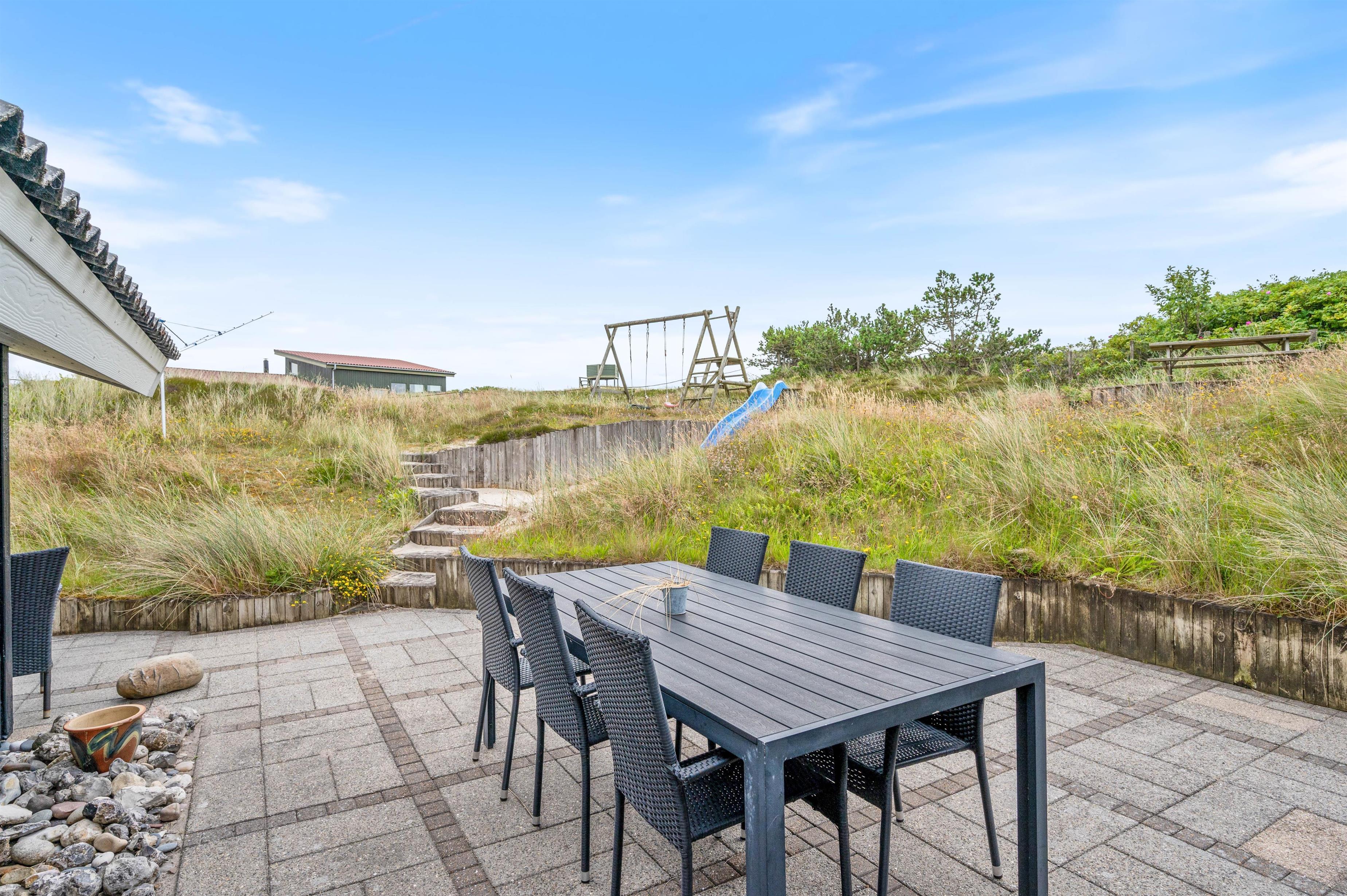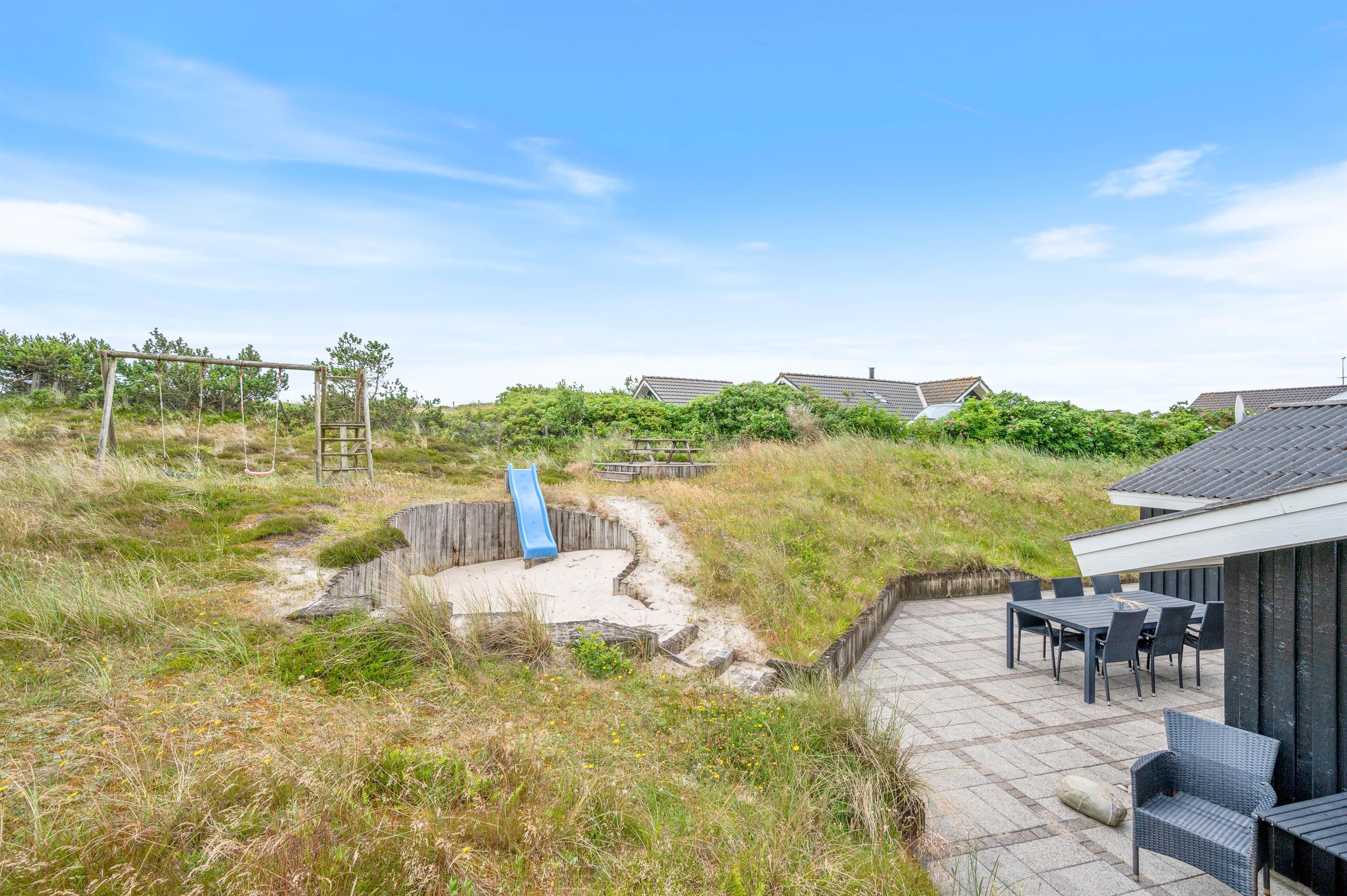 Feriehuset på Bjerregårdsvej 229 har en stor møbleret og delvis overdækket terrasse. Det helt oplagte sted at nyde solen, den friske havluft og den storslåede natur på landtangen imellem Vesterhavet og Ringkøbing Fjord. Der er også en grill til rådighed, hvis I skulle få lyst til at nyde en lækker grillmenu en aften. Der er en ekstra terrasse oppe i niveau med en dejlig udsigt over kllitterne og landskabet. For de mindste er der både sandkasse, gyngestativ og rutchebane at fornøje sig med.