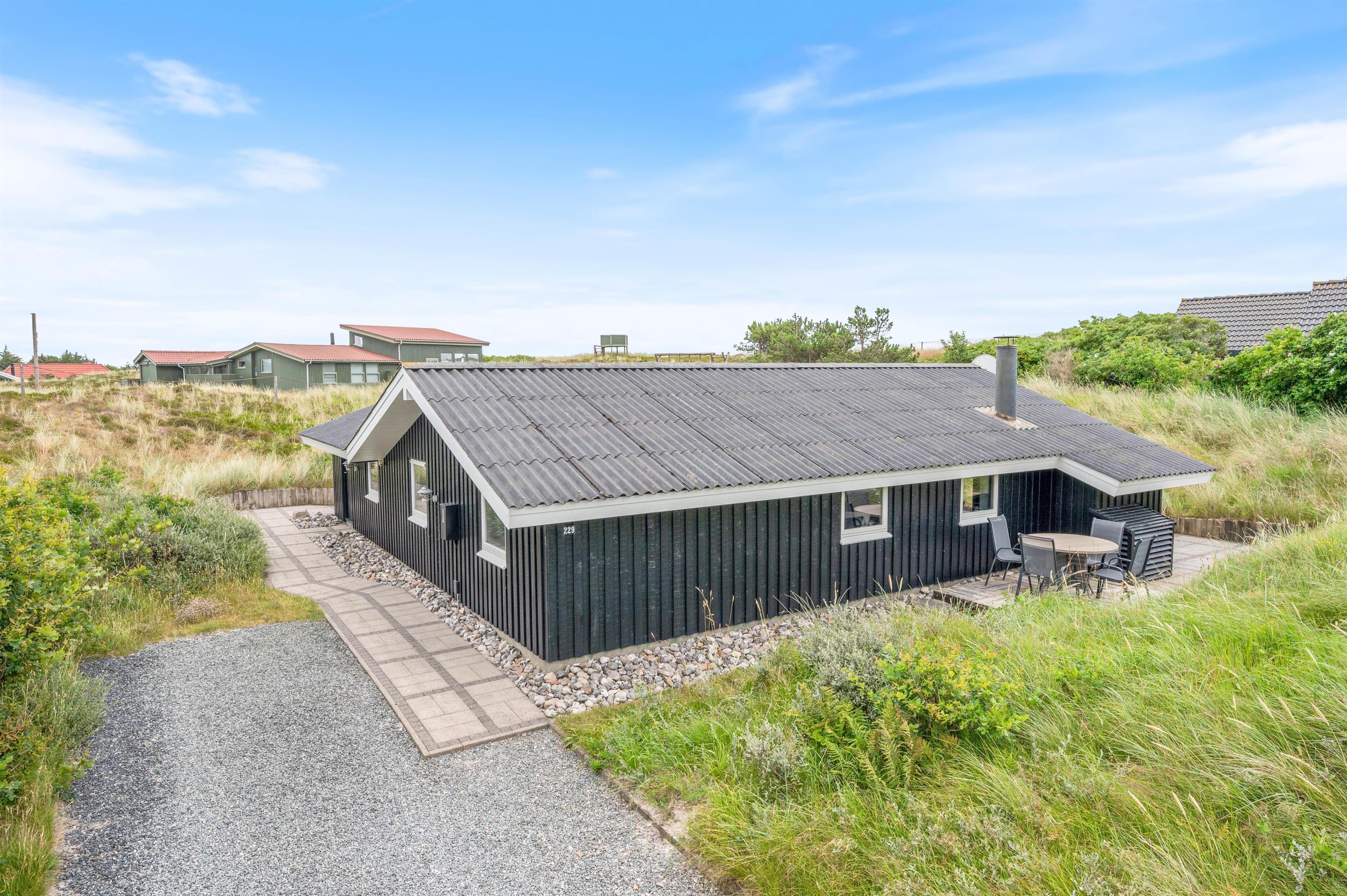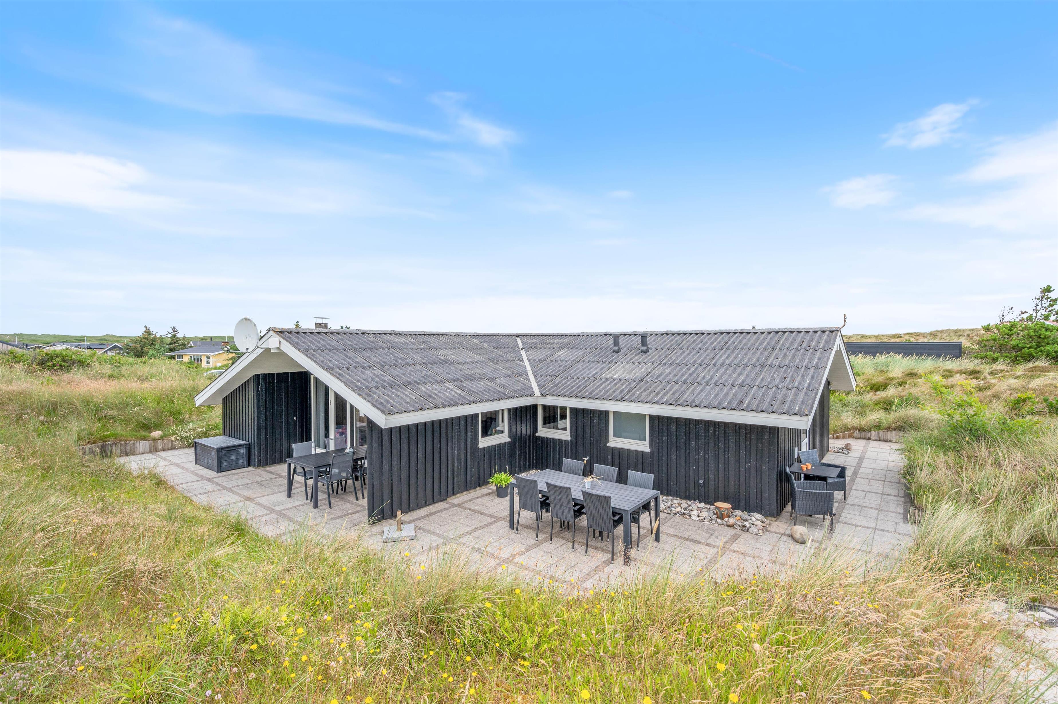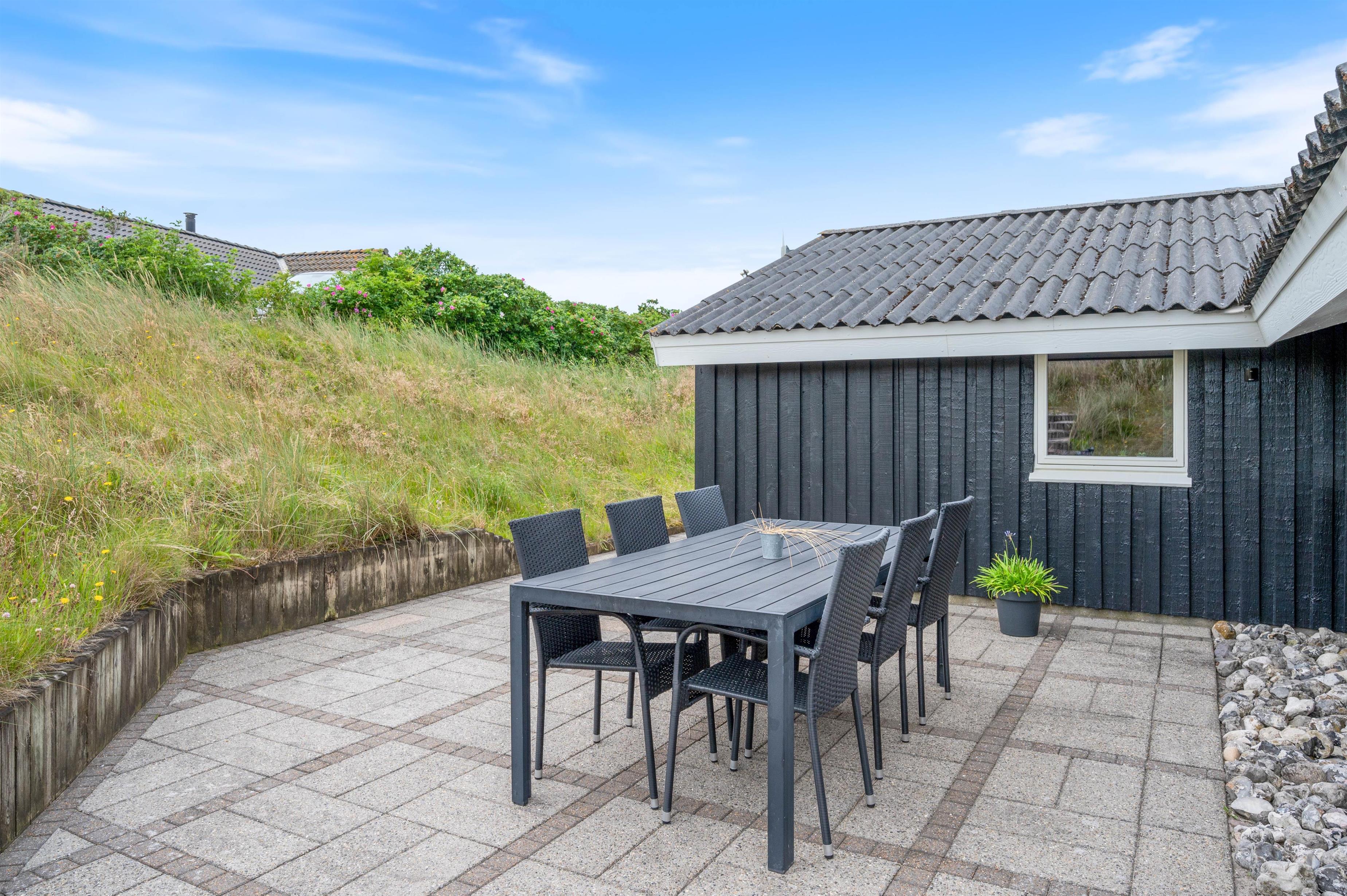 Feriehuset på Bjerregårdsvej 229 har en stor møbleret og delvis overdækket terrasse. Det helt oplagte sted at nyde solen, den friske havluft og den storslåede natur på landtangen imellem Vesterhavet og Ringkøbing Fjord. Der er også en grill til rådighed, hvis I skulle få lyst til at nyde en lækker grillmenu en aften. Der er en ekstra terrasse oppe i niveau med en dejlig udsigt over kllitterne og landskabet. For de mindste er der både sandkasse, gyngestativ og rutchebane at fornøje sig med.