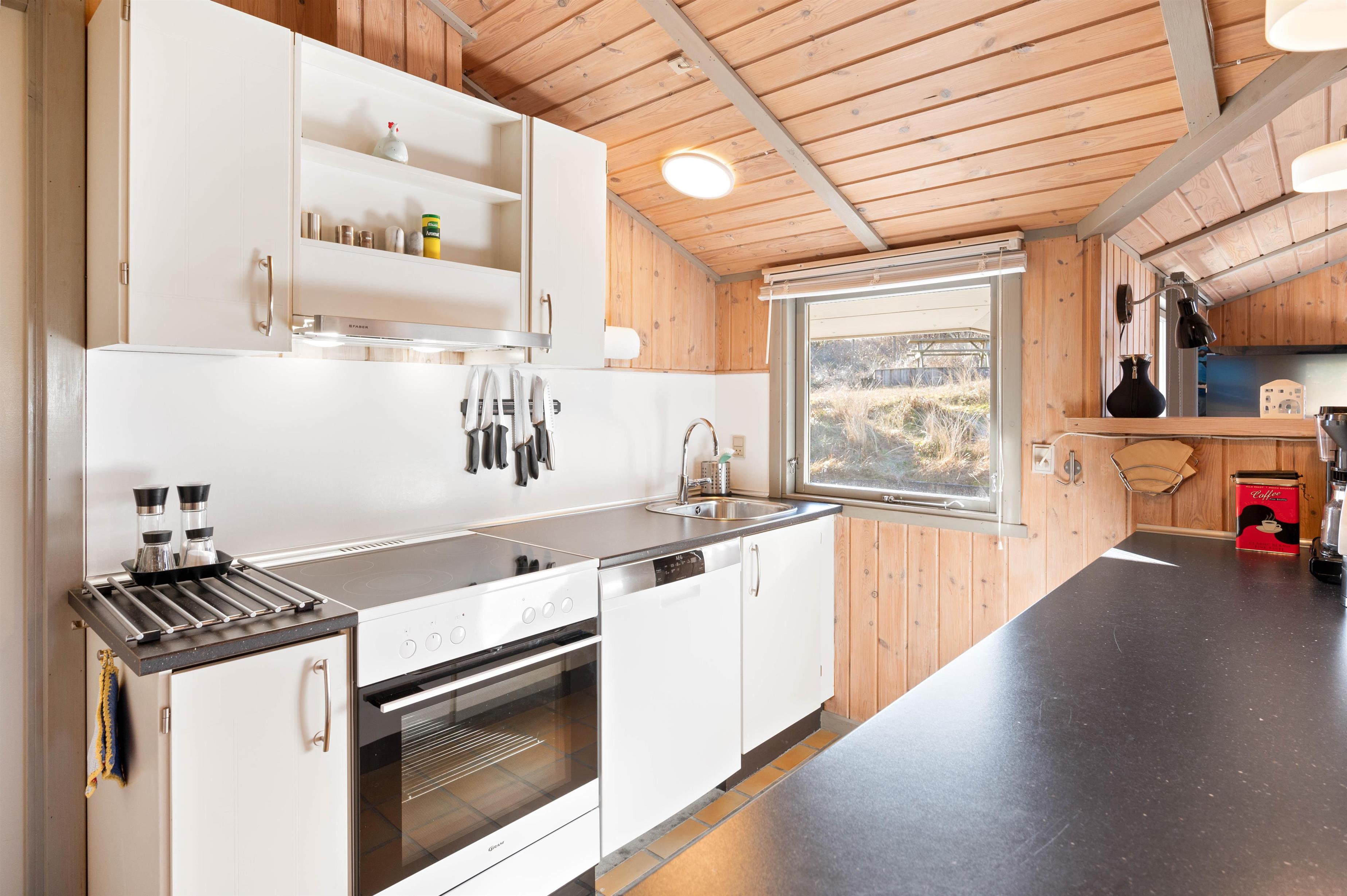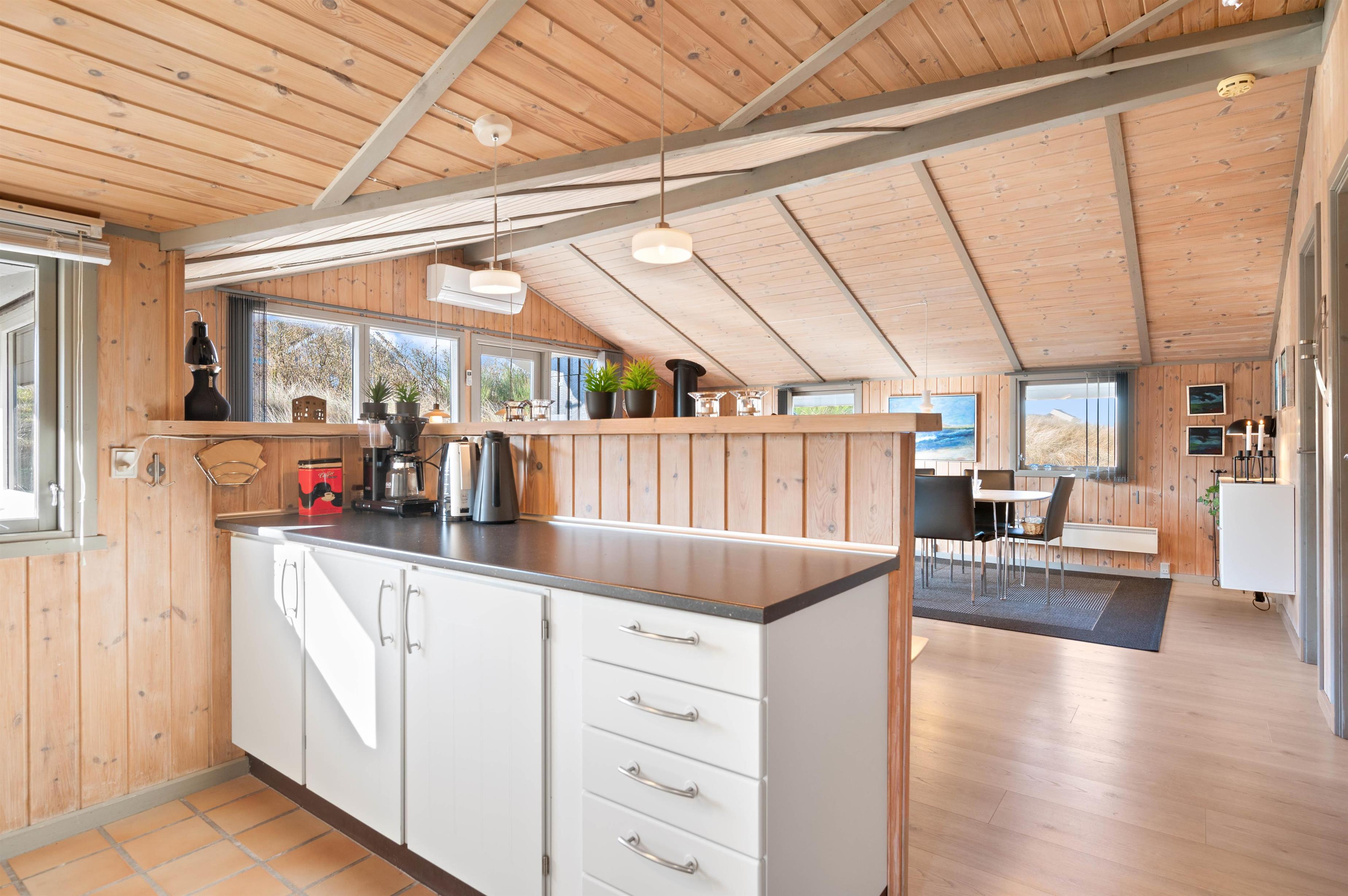 Det lyse og funktionelle køkken er åbent i forbindelse med stuen og indeholder alt, hvad du behøver, for at fremstille lækre måltider. Imens kan du være i kontakt med dem, som befinder sig i stuen, eller følge med i, hvad der sker på terrassen. I stuen er der en god spiseafdeling og opholdsafdeling, som begge nyder godt af varmen fra brændeovnen. Det træbeklædte loft til kip giver en rigtig god rummelighed. Den energibesparende varmepumpe er med til at give god forbrugsøkonomi.