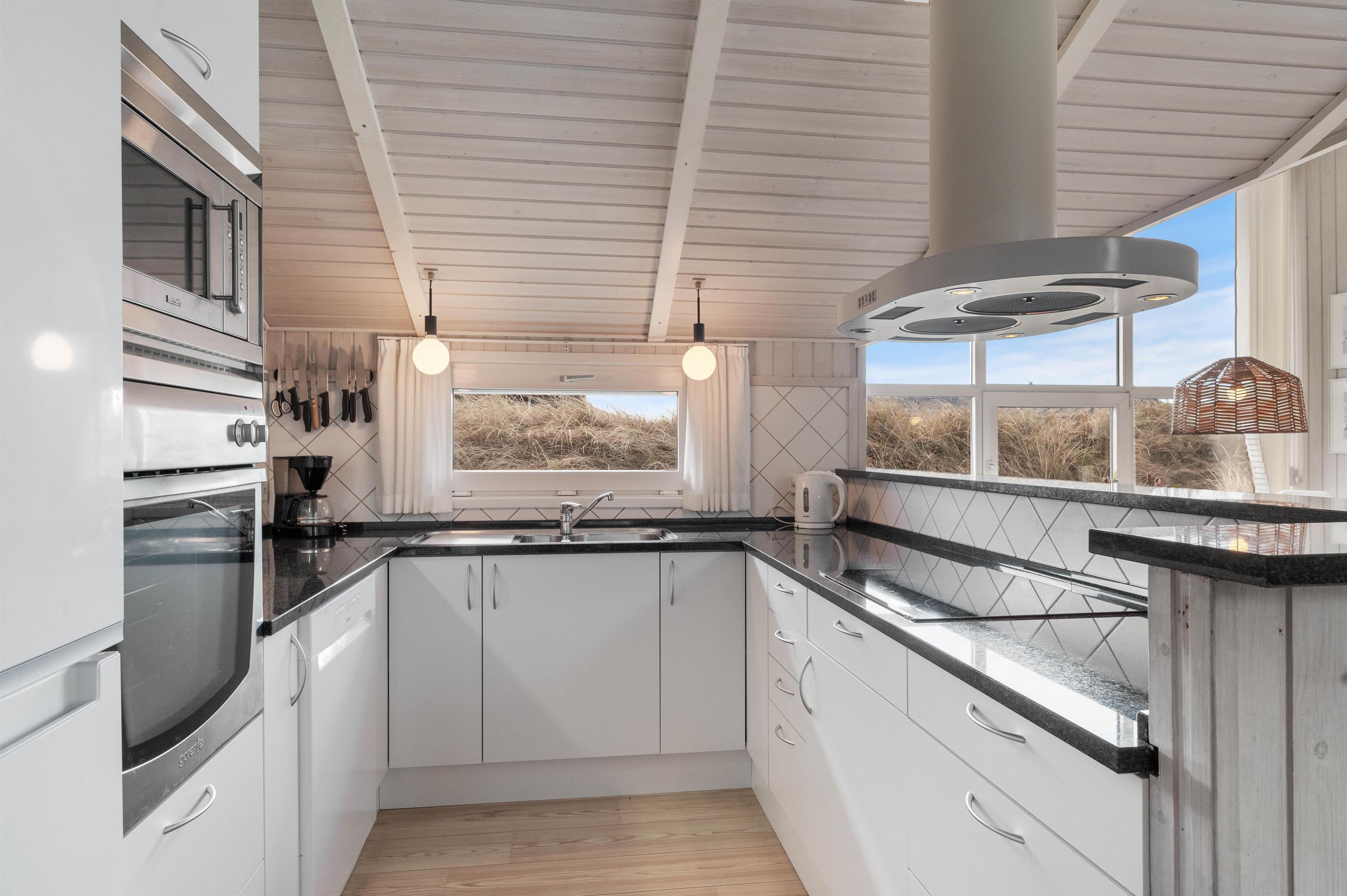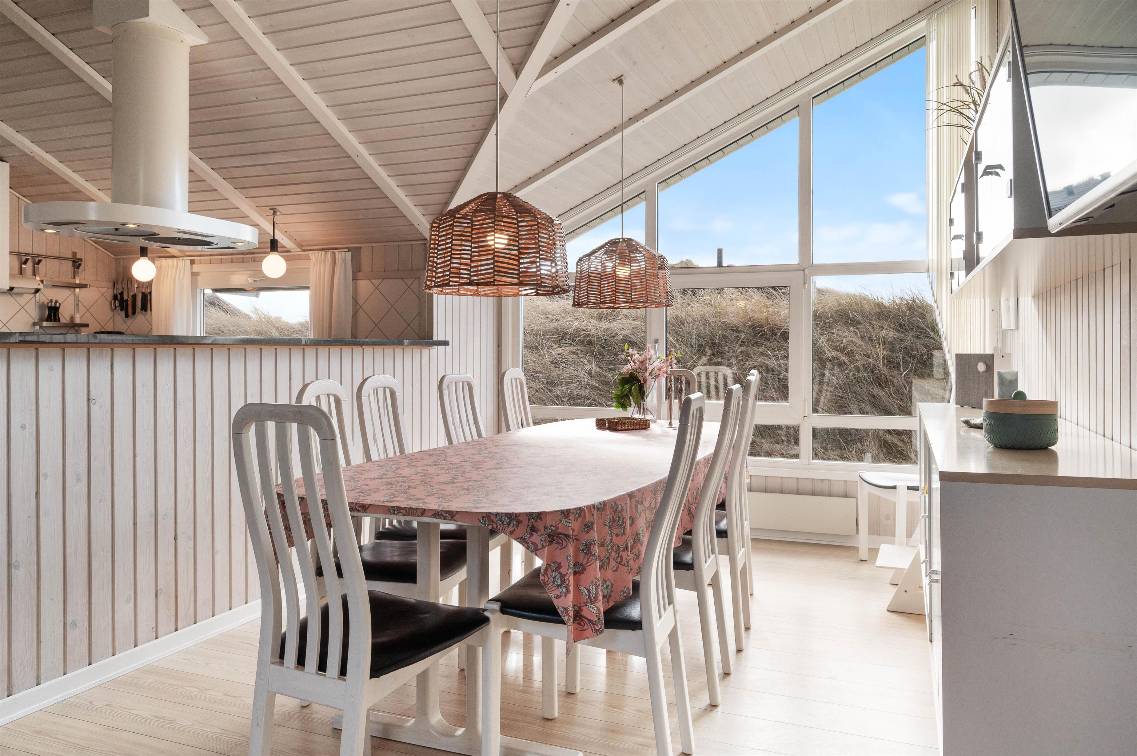 I det lyse og venlige sommerhus på Bjerregårdsvej 351 kan I ikke undgå at få en dejlig ferie. Det åbne køkken indeholder alt, hvad I har brug for til at forkæle hinanden med lækre, hjemmelavede måltider. Der er et fint lysindfald i stuen med både ovenlysvinduer og de brede vinduespartier. I det komfortable sofahjørne kan I hygge jer foran den knitrende ild i brændeovnen, og den store udestue er lys og indbydende hele dagen. De 5 soveværelser er alle indrettet med gode senge og skabsplads, og i børneværelset er der installeret et ekstra fjernsyn.