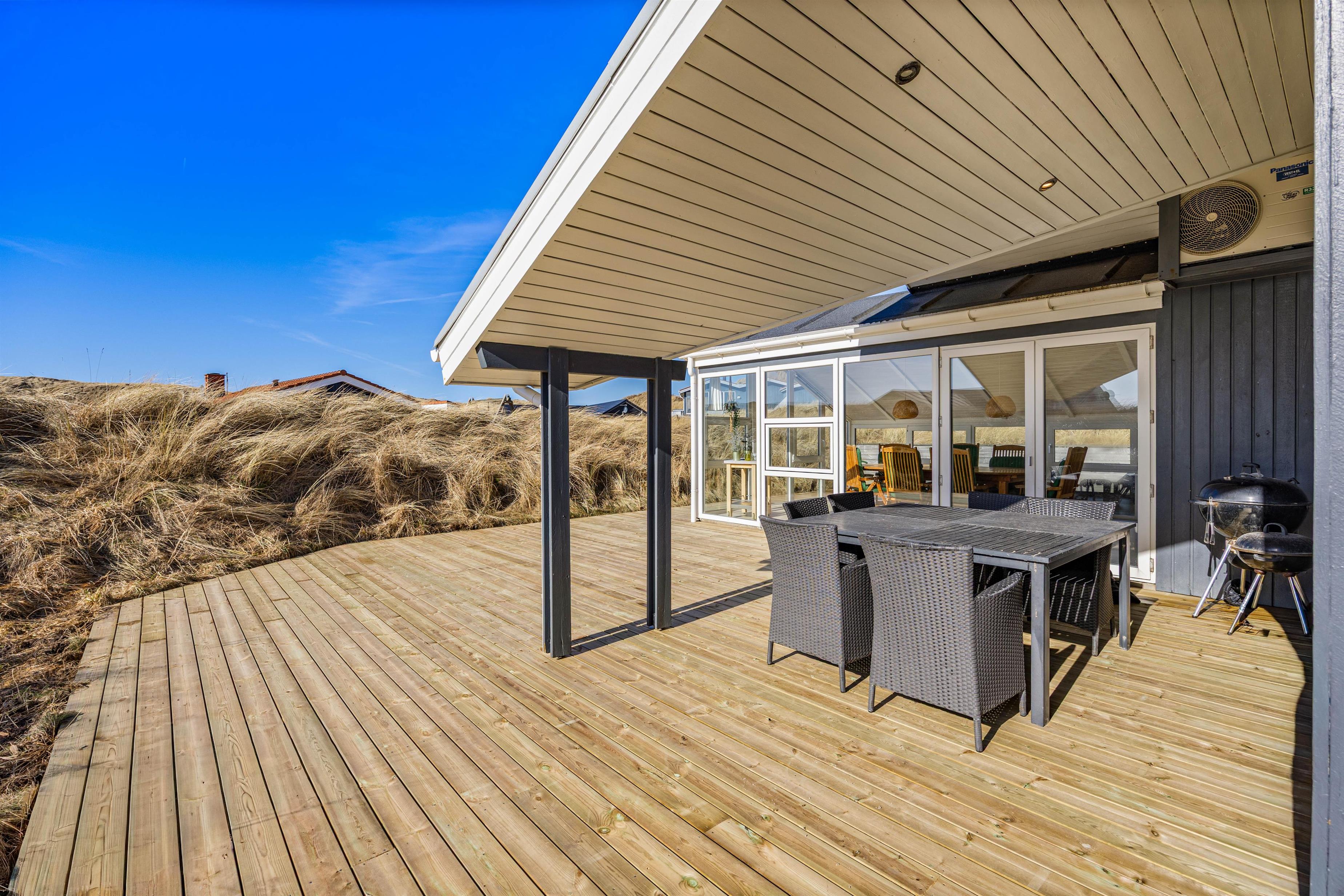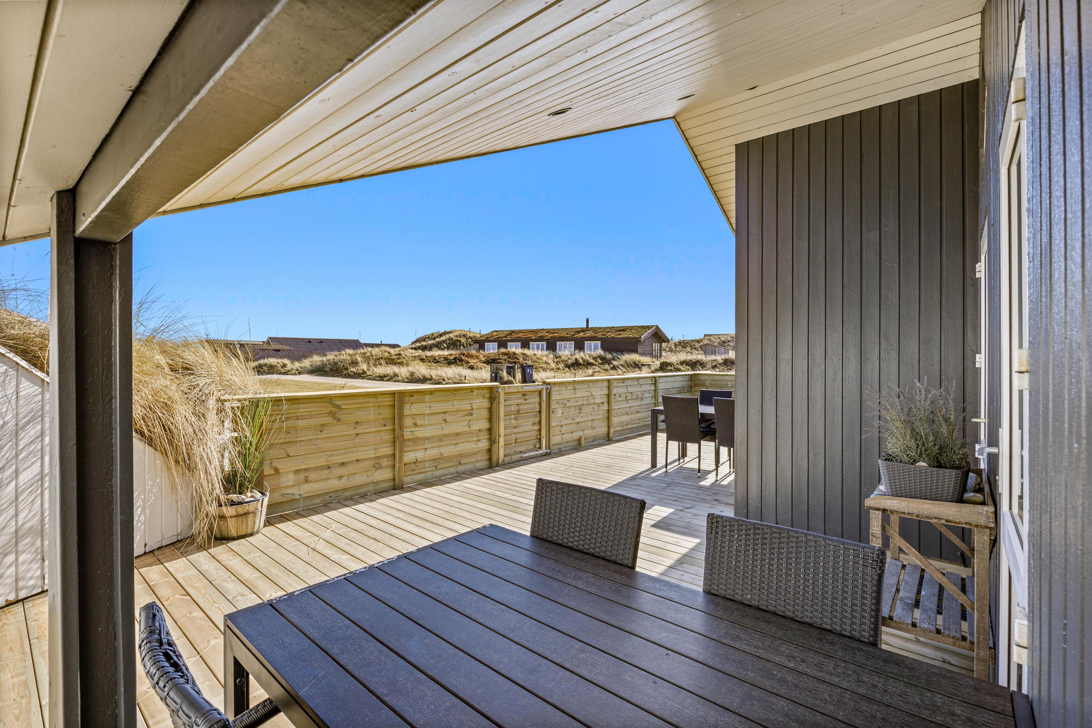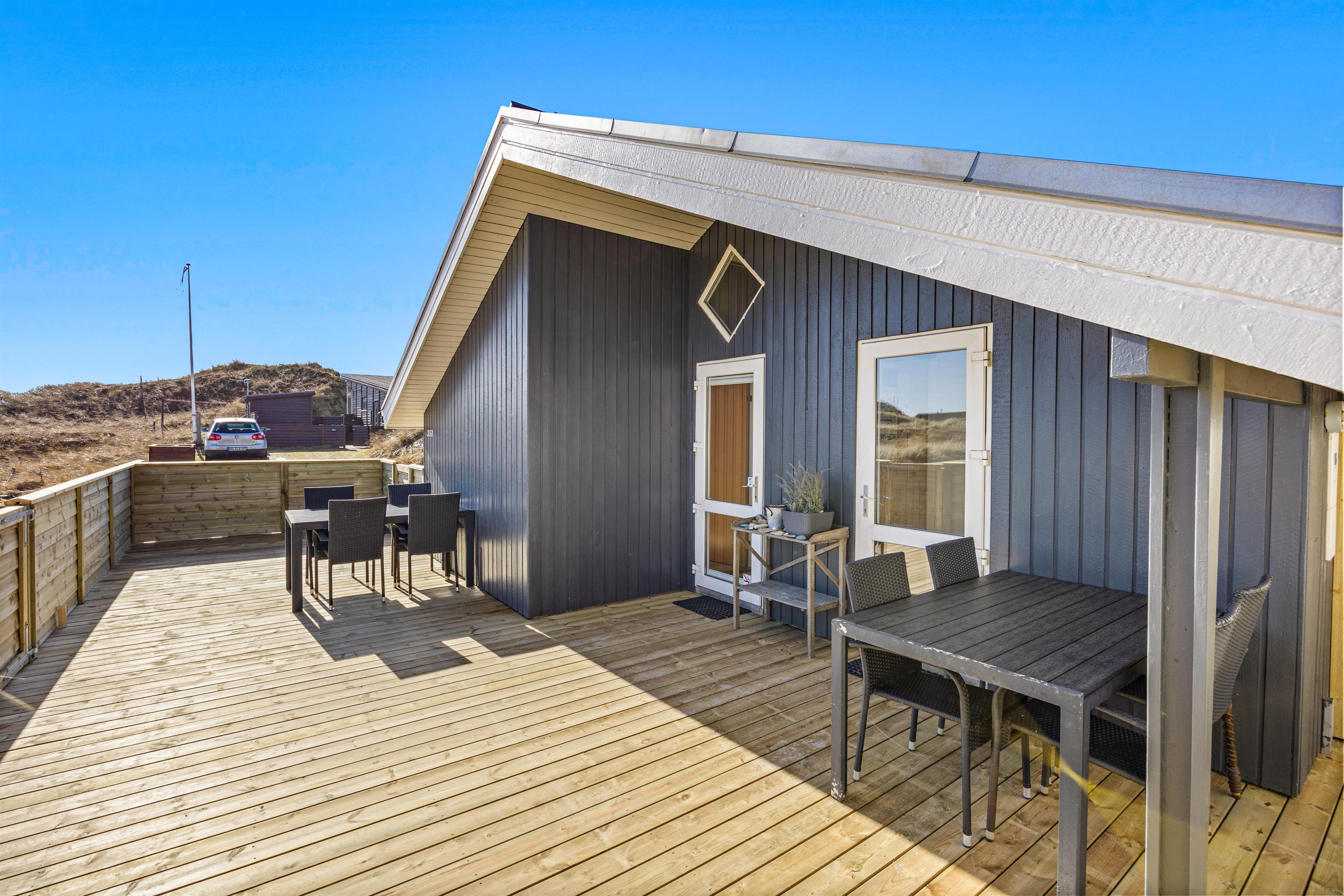 Den rummelige terrasse går hele vejen rundt om feriehuset. En del af terrassen er overdækket og hele terrassen er afskærmet. Her kan du virkelig få fuldt udbytte at den friske luft, for ligemeget hvilket hjørne det blæser fra, kan du altid finde et sted, hvor du kan slappe af på liggestolen eller nyde en dejlig middag fra grillen. Til de små er der sandkasse i forbindelse med terrassen.