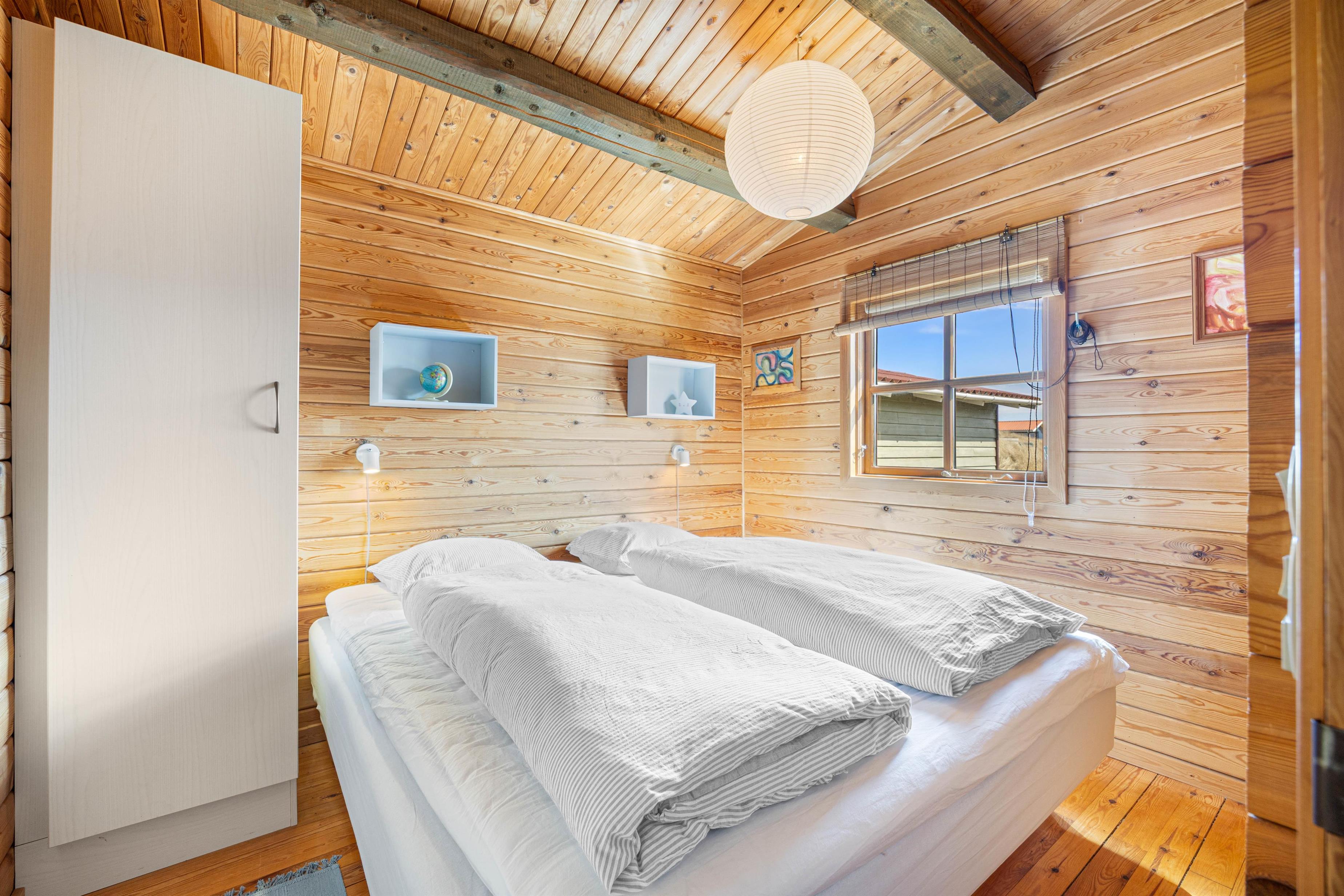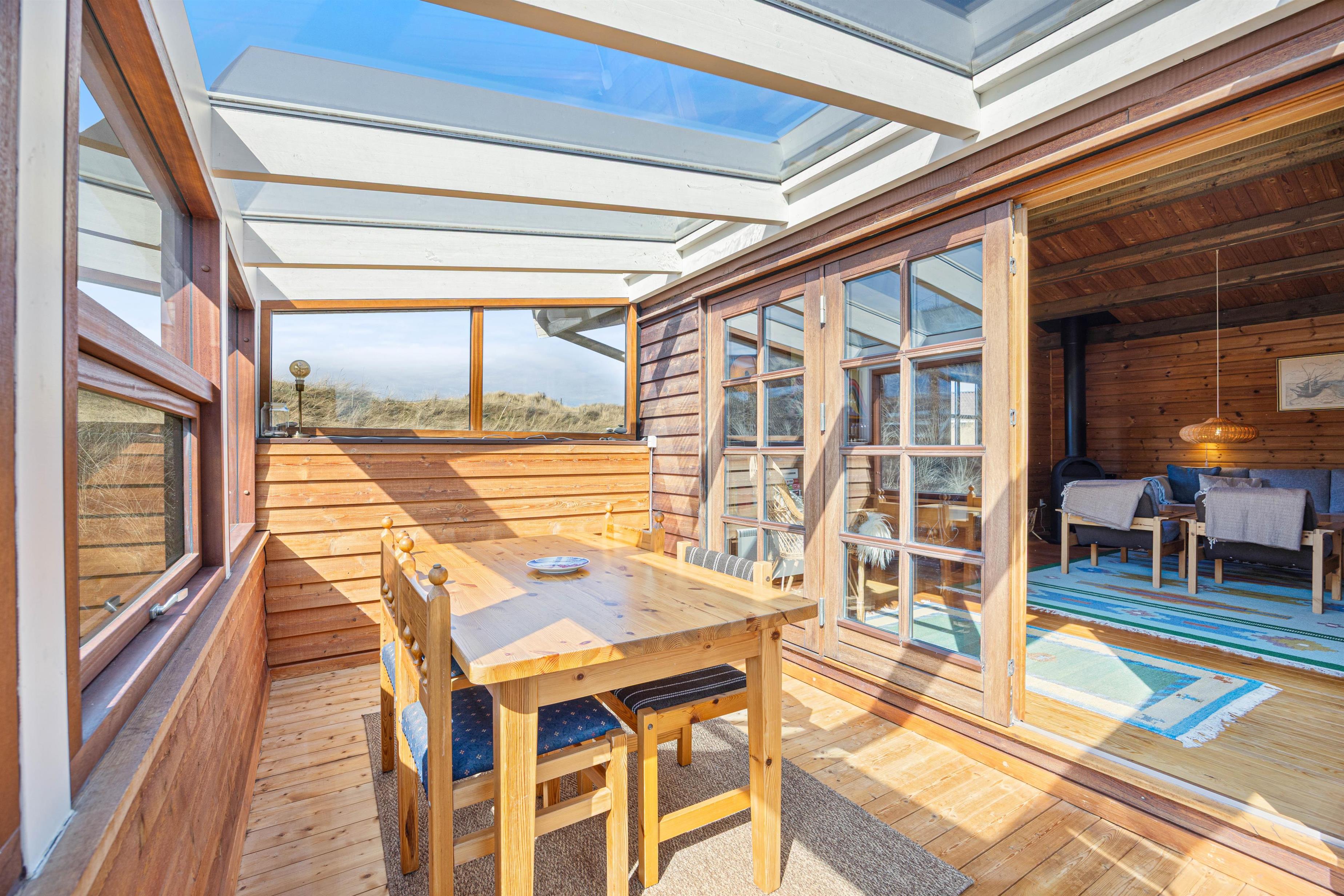 Dette 2-stjernede feriehus i Bjerregård byder på 66 m2 boligareal med en gennemtænkt planløsning. Opholdsrummet er åbent og suppleres af en brændeovn, som skaber en dejlig varme på køligere dage. En udestue forlænger opholdsområdet og giver et lyst og indbydende sted at opholde sig.