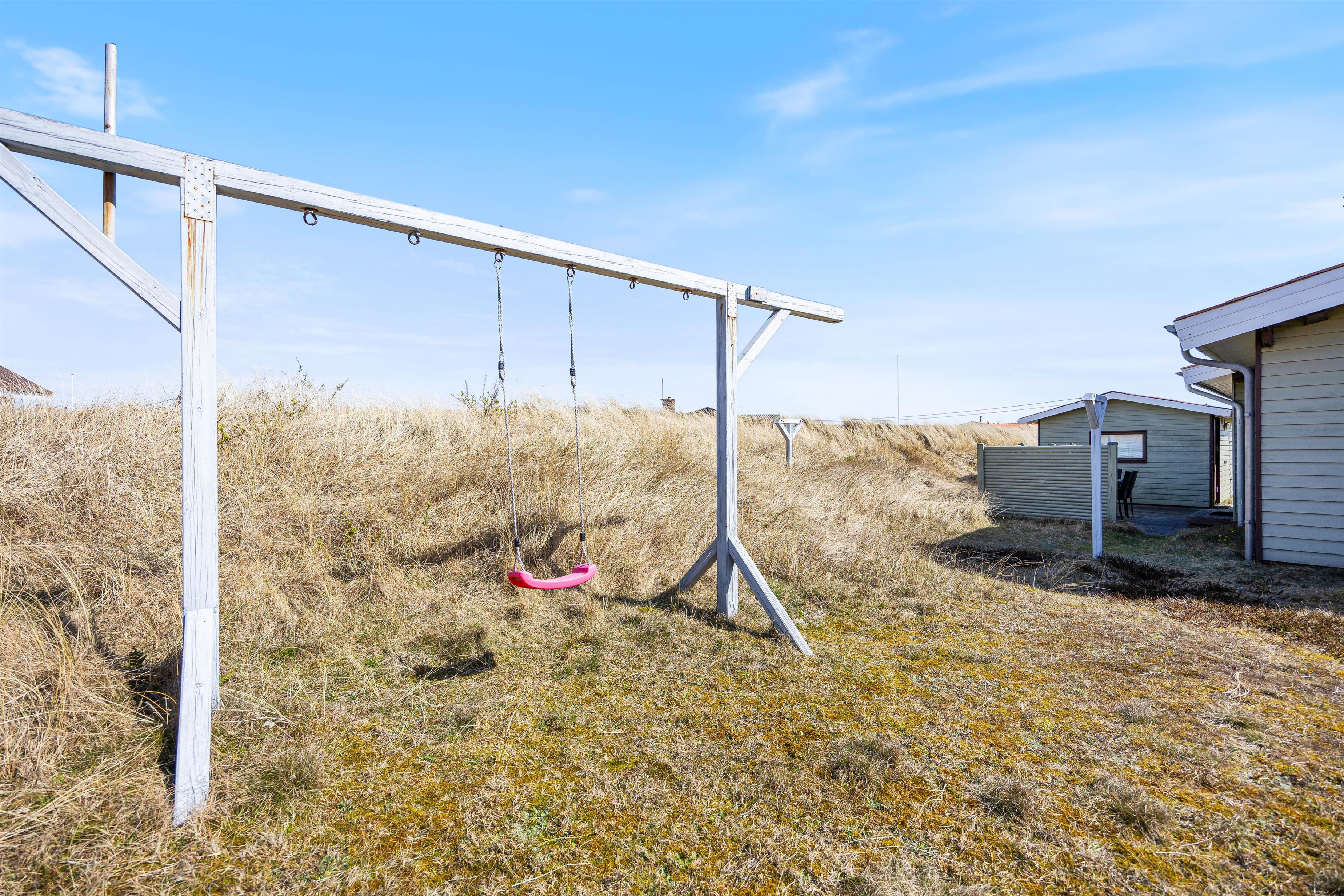 Den kuperede naturgrund giver god plads til udendørs aktiviteter og afslapning. På terrassen kan I nyde den friske luft eller lade dagen gå på hæld i rolige omgivelser. Til de yngste er der en gynge, mens I kan læne jer tilbage og nyde naturen omkring jer. Stranden ligger kun 300 m fra feriehuset og indbyder til lange gåture ved Vesterhavet. Indkøbsmuligheder finder I cirka 1000 m væk.