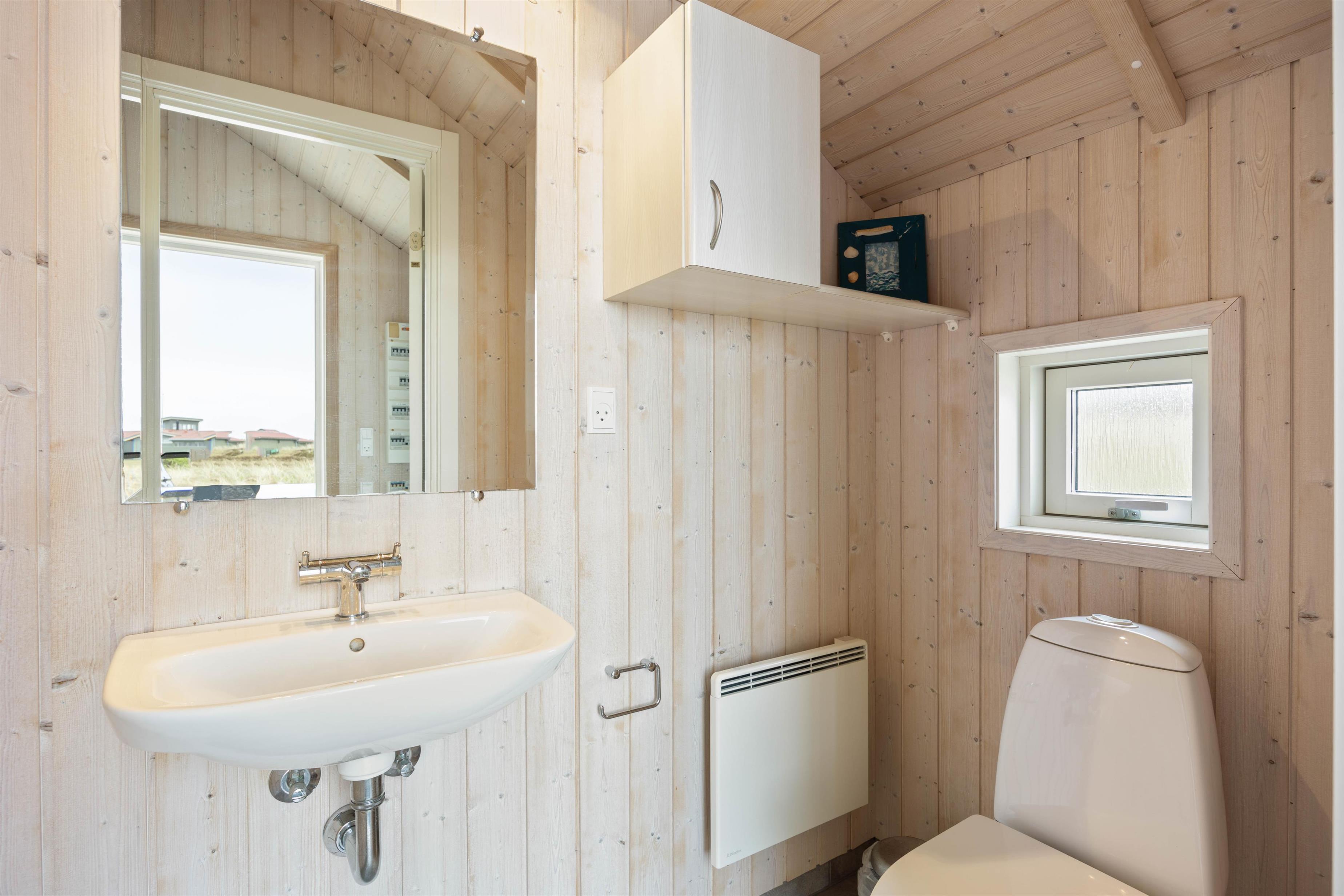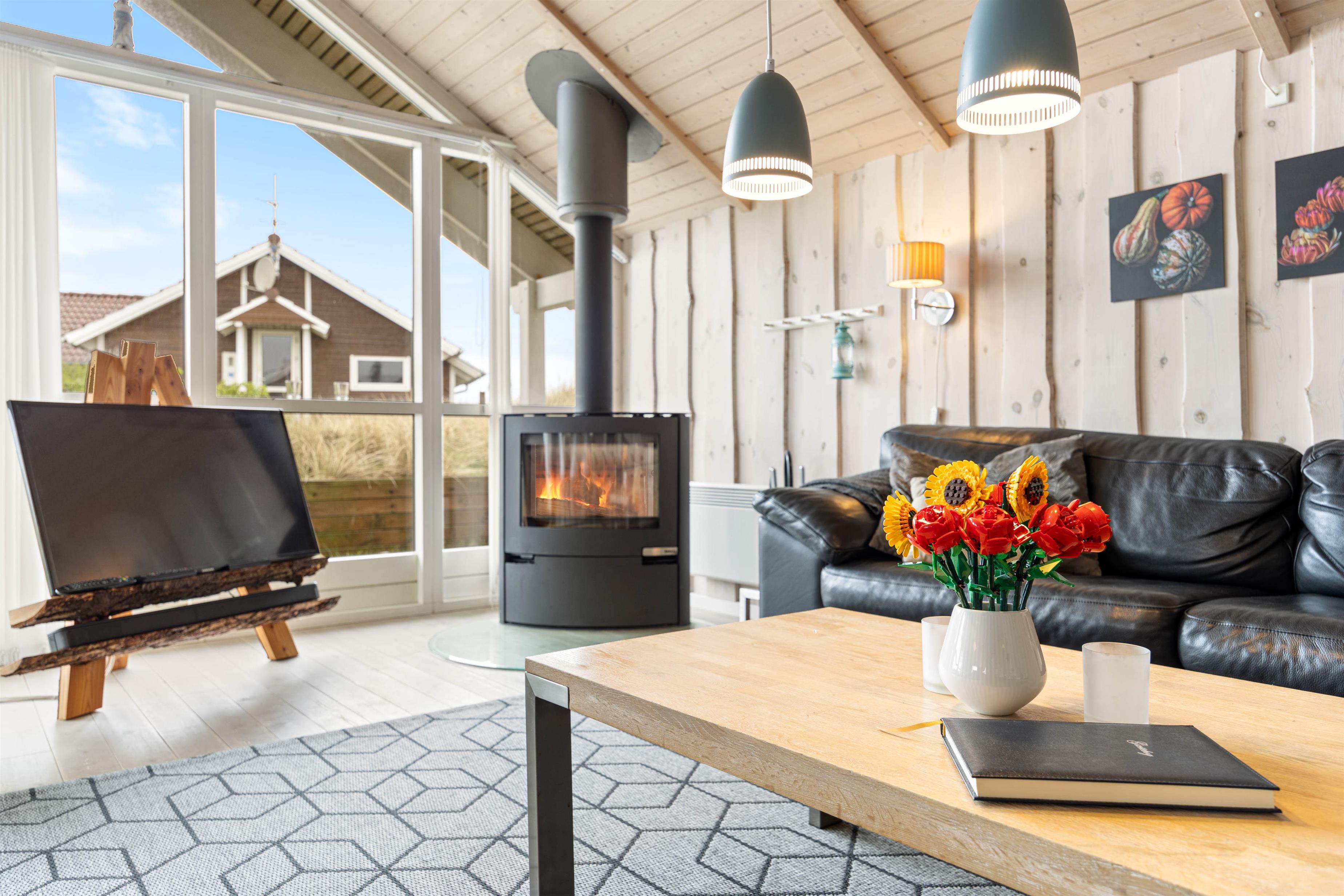 Med øje for klassisk sommerhus-hygge er sommerhusets indretning traditionel og med en indbydende atmosfære. Det åbne opholdsrum er det perfekte sted at samles efter en dag fyldt med udendørs aktiviteter. Slap af foran den knitrende brændeovn, der spreder en behagelig varme eller nyd en forfriskende saunaoplevelse efter et dyp i spabadet, der giver krop og sind ny energi. Spabad og sauna er placeret på sommerhusets badeværelse, men her er også et gæstetoilet i sommerhuset. Både badeværelse og gæstetoilet er udstyret med gulvvarme.