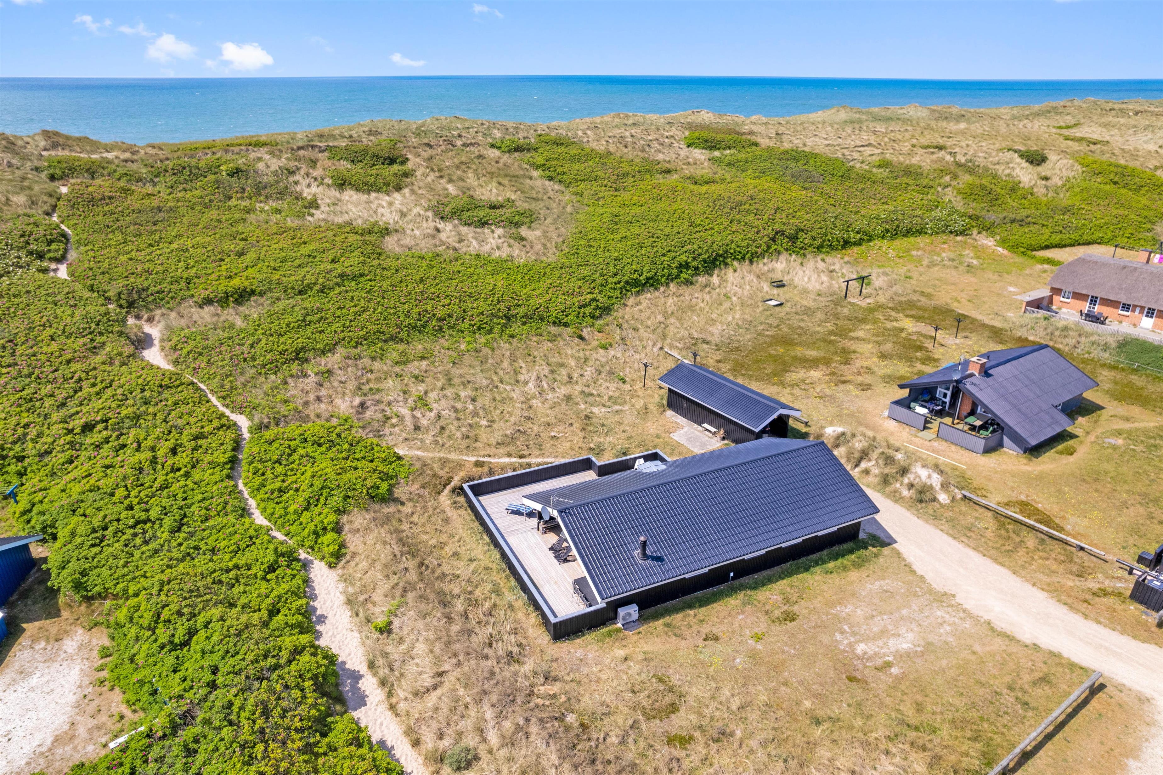 I første klitrække i Bjerregård finder I dette moderne og hyggelige sommerhus, hvor op til 6 personer samt 2 hunde kan nyde en dejlig og afslappende ferie. Sommerhuset har både brændeovn, varmepumpe og en infrarød sauna. På terrassen kan I nyde sommervejret og den friske havluft i de komfortable havemøbler.