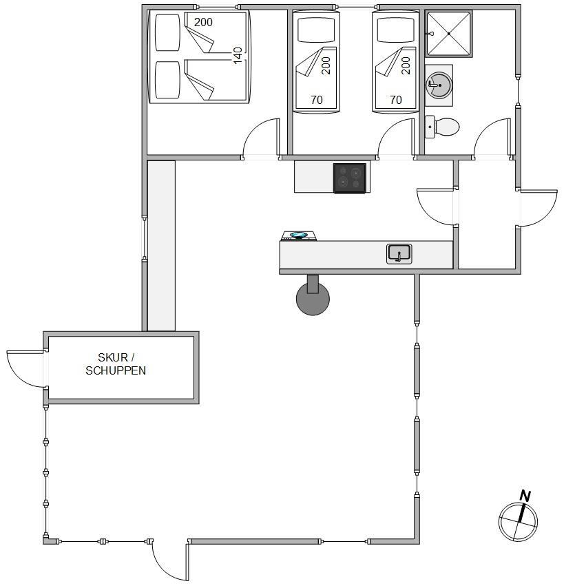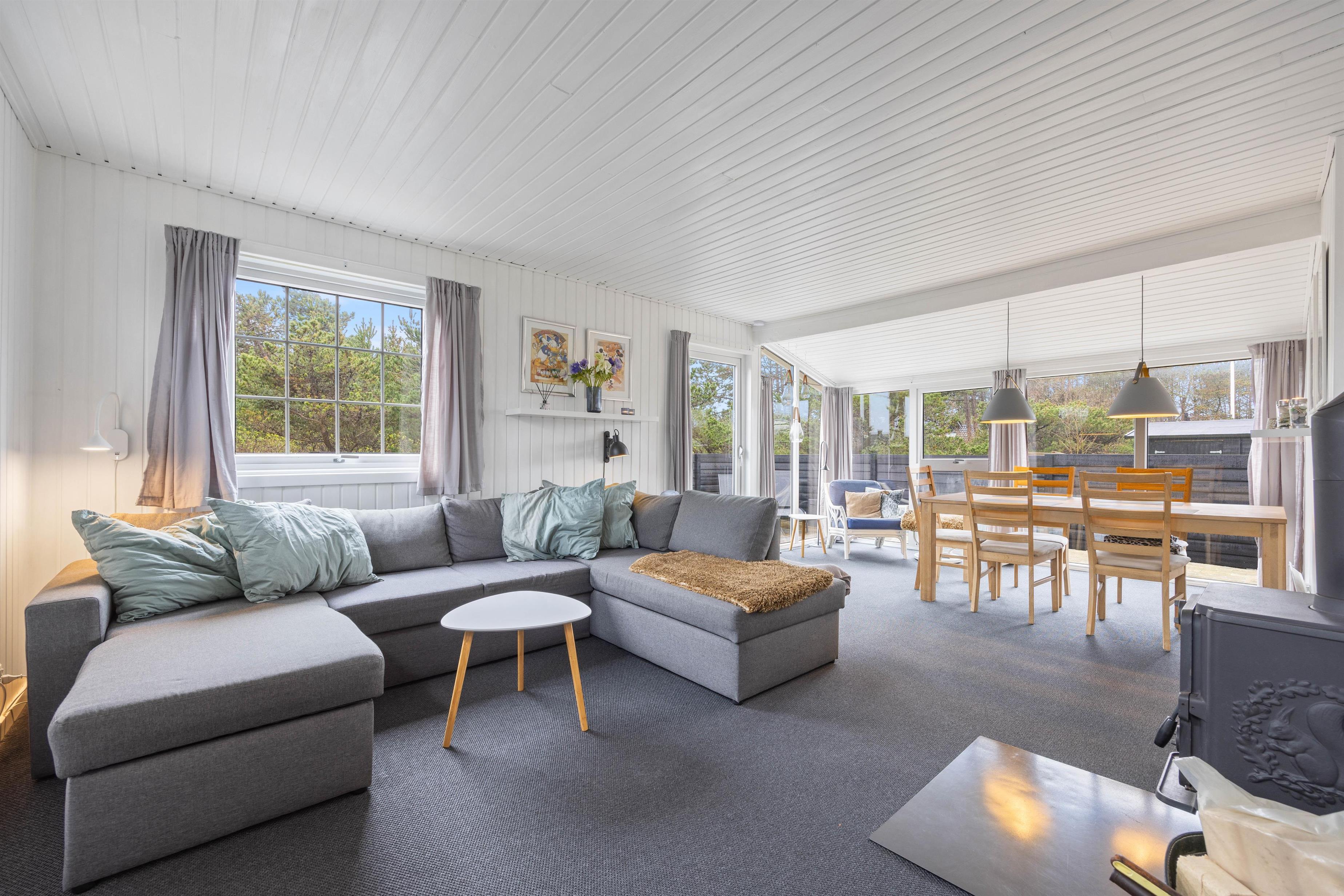 Hjerterummet i sommerhuset er stuen, der ligger i forlængelse af spiseplads og det tilstødende køkken. I stuen kan I slappe af sammen foran brændeovnen, mens de gode feriemåltider kan tilberedes i det veludstyrede køkken. Efter at have nydt en god middag ved spisebordet kan I finde brætspillet frem og hygge jer, mens opvaskemaskinen klarer opvasken for jer.