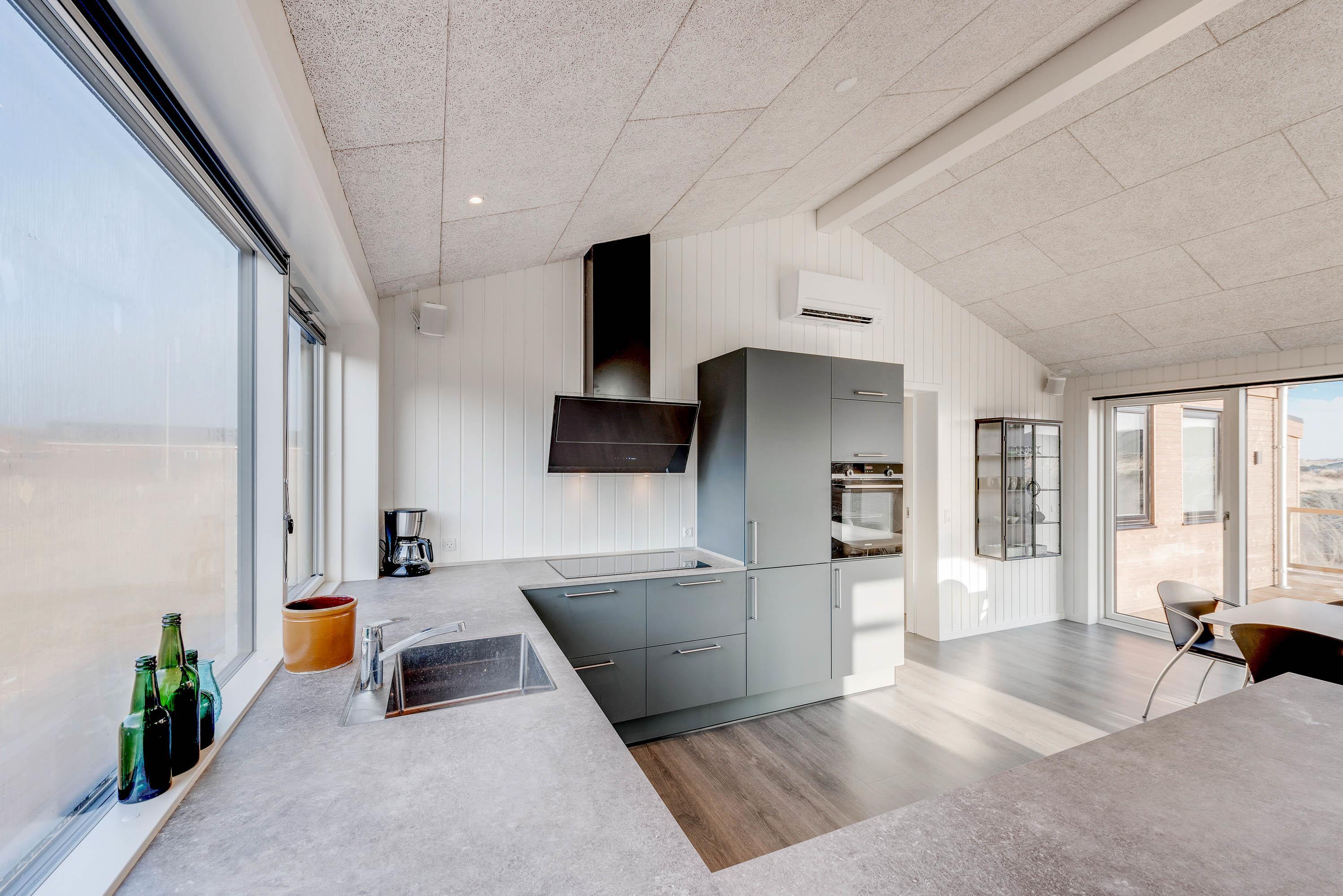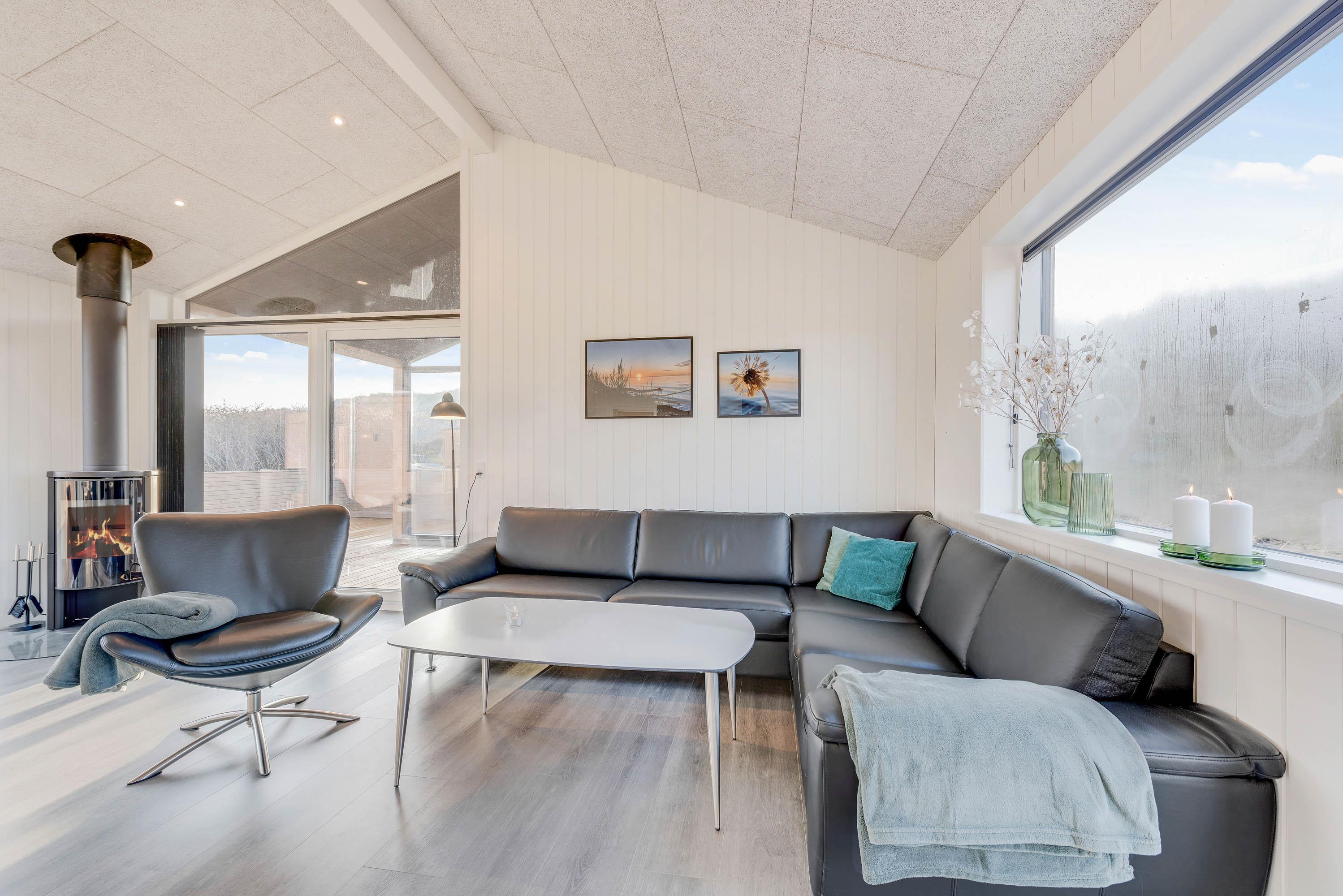 Det store opholdsrum vil danne rammerne om mange skønne feriestunder, hvor I sammen kan nyde ferien og det gode selskab. Her er store vinduespartier, som inviterer Bjerregårds smukke klitlandskab indenfor.