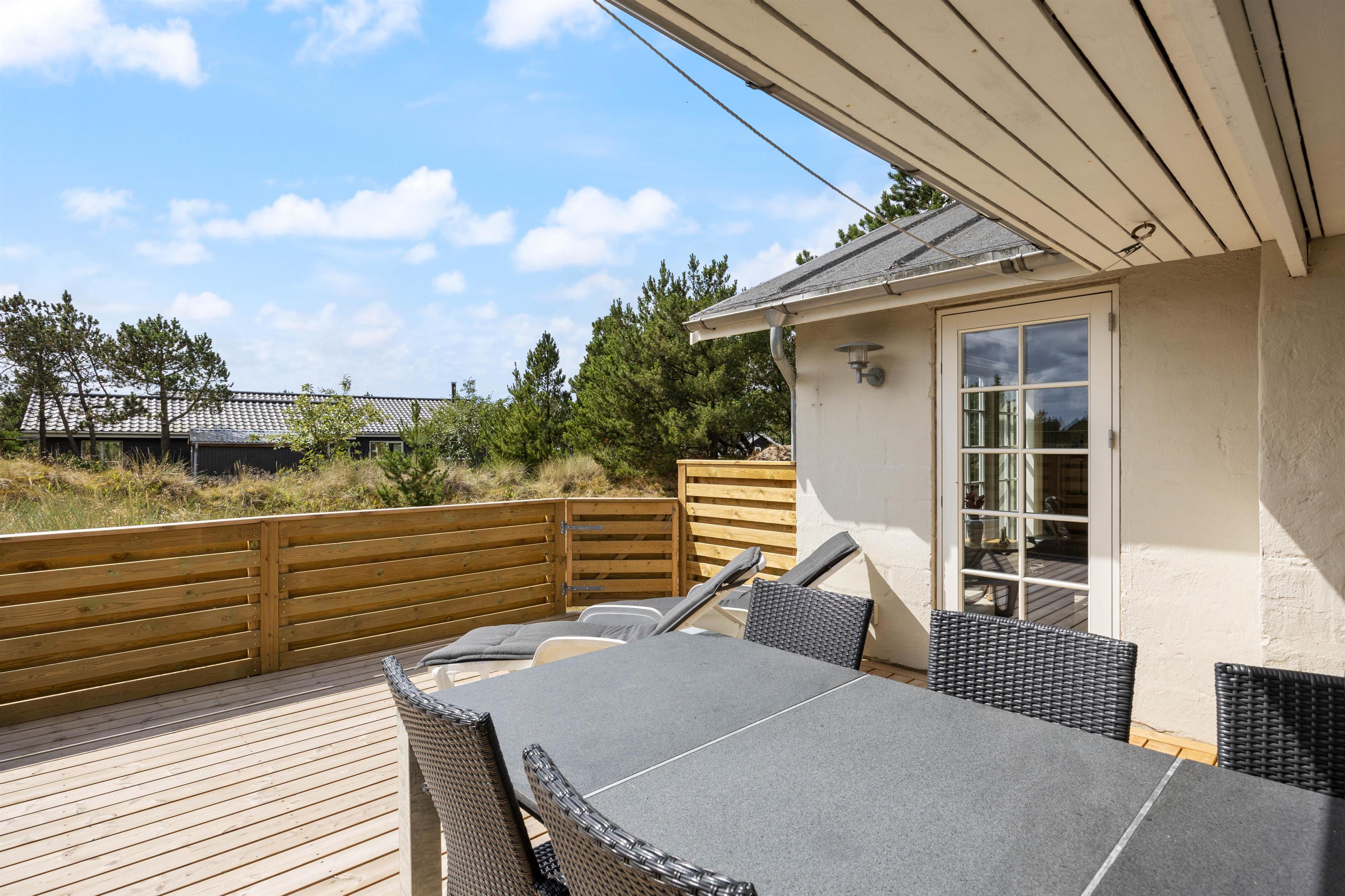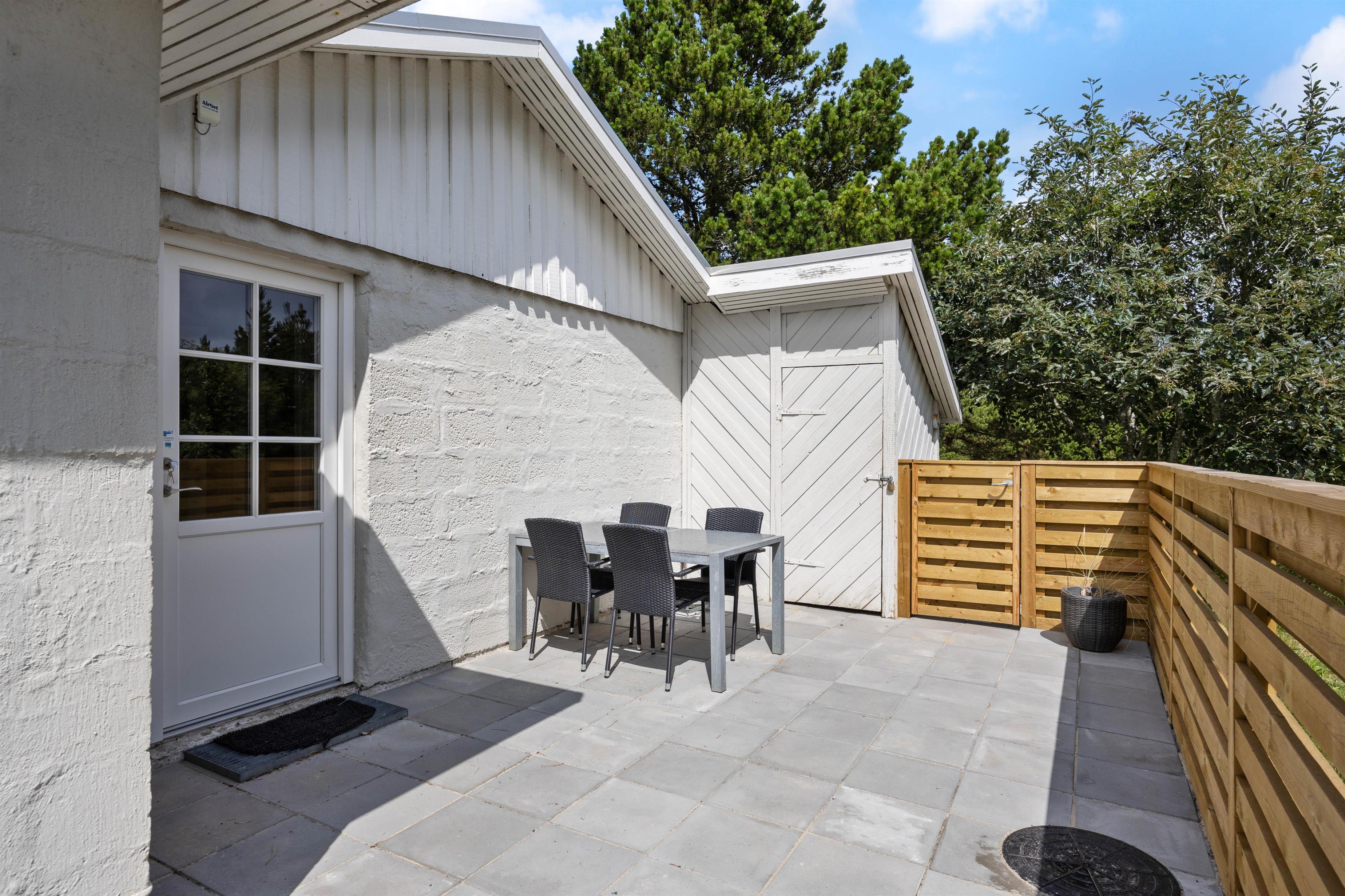 I kan også tilbringe mange gode timer udendørs ved sommerhuset på Bjerregårdsvej 19. Den lukkede og afskærmede terrasse er sydøst vendt og danner de perfekte rammer til at nyde solopgangen med dagens første kop kaffe.