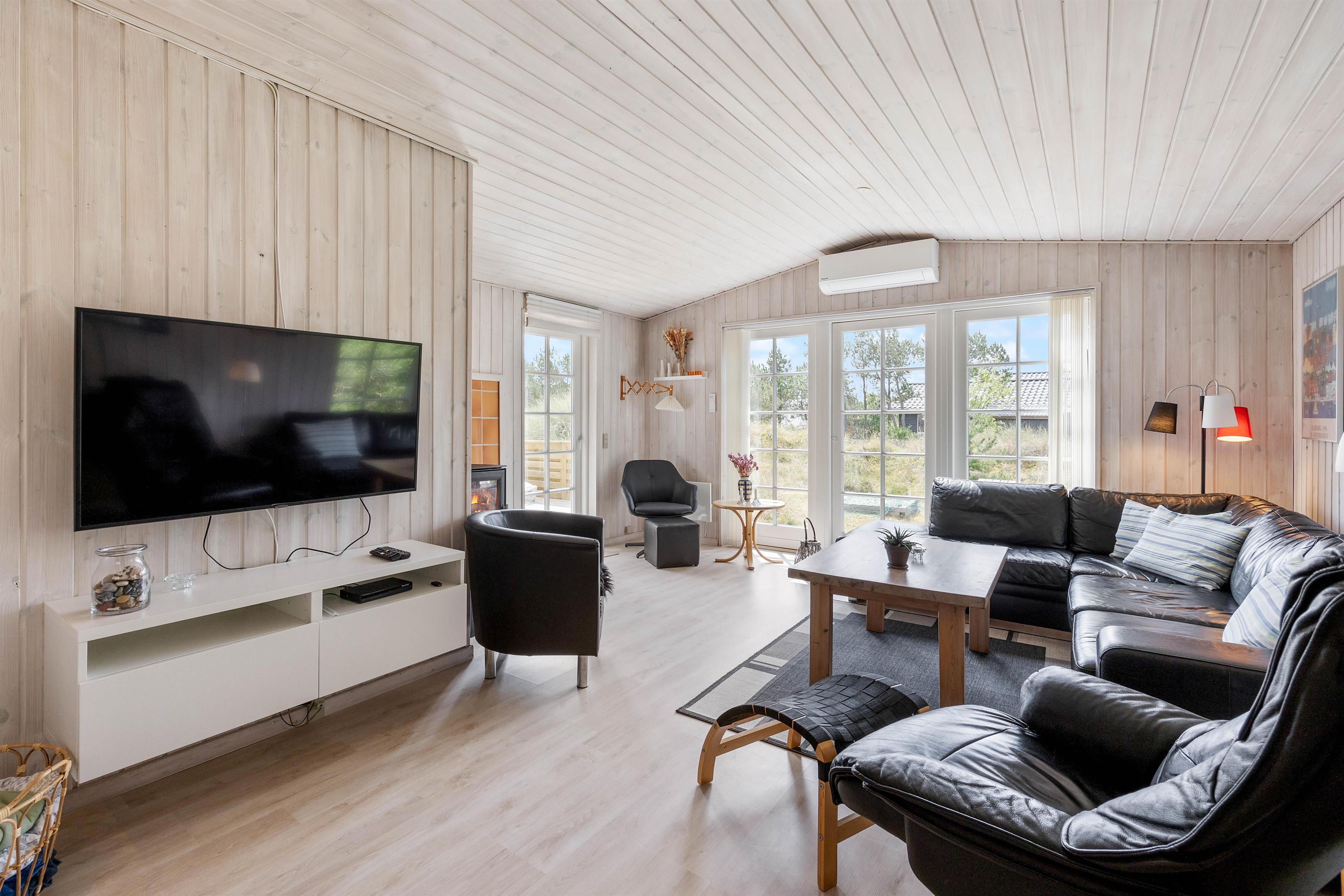 Vinduerne fra gulv til loft skaber et naturligt lysindfald og den centralt placerede brændeovn giver en behagelig varme og lader jer virkelig slappe af til træets knitren.