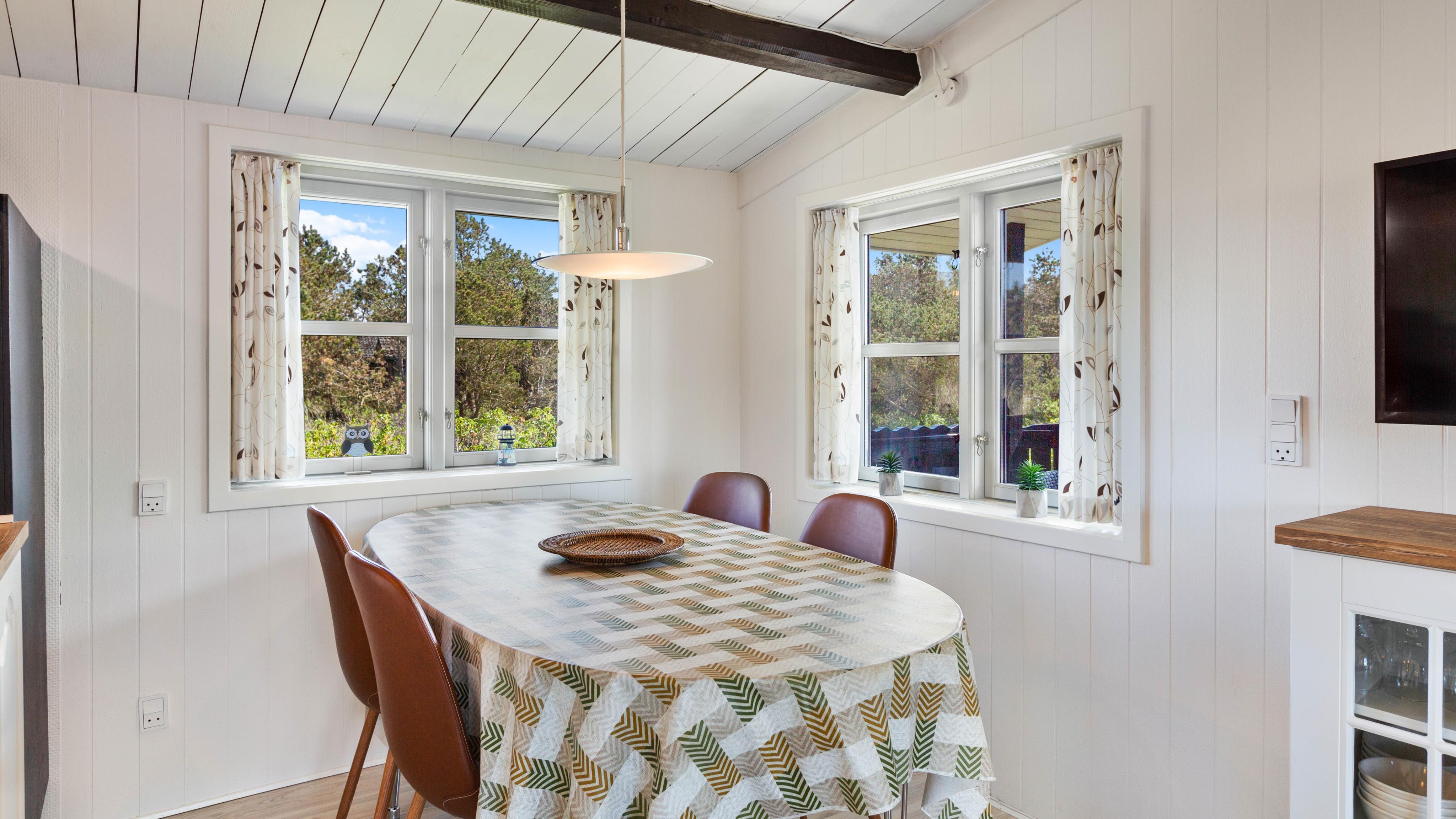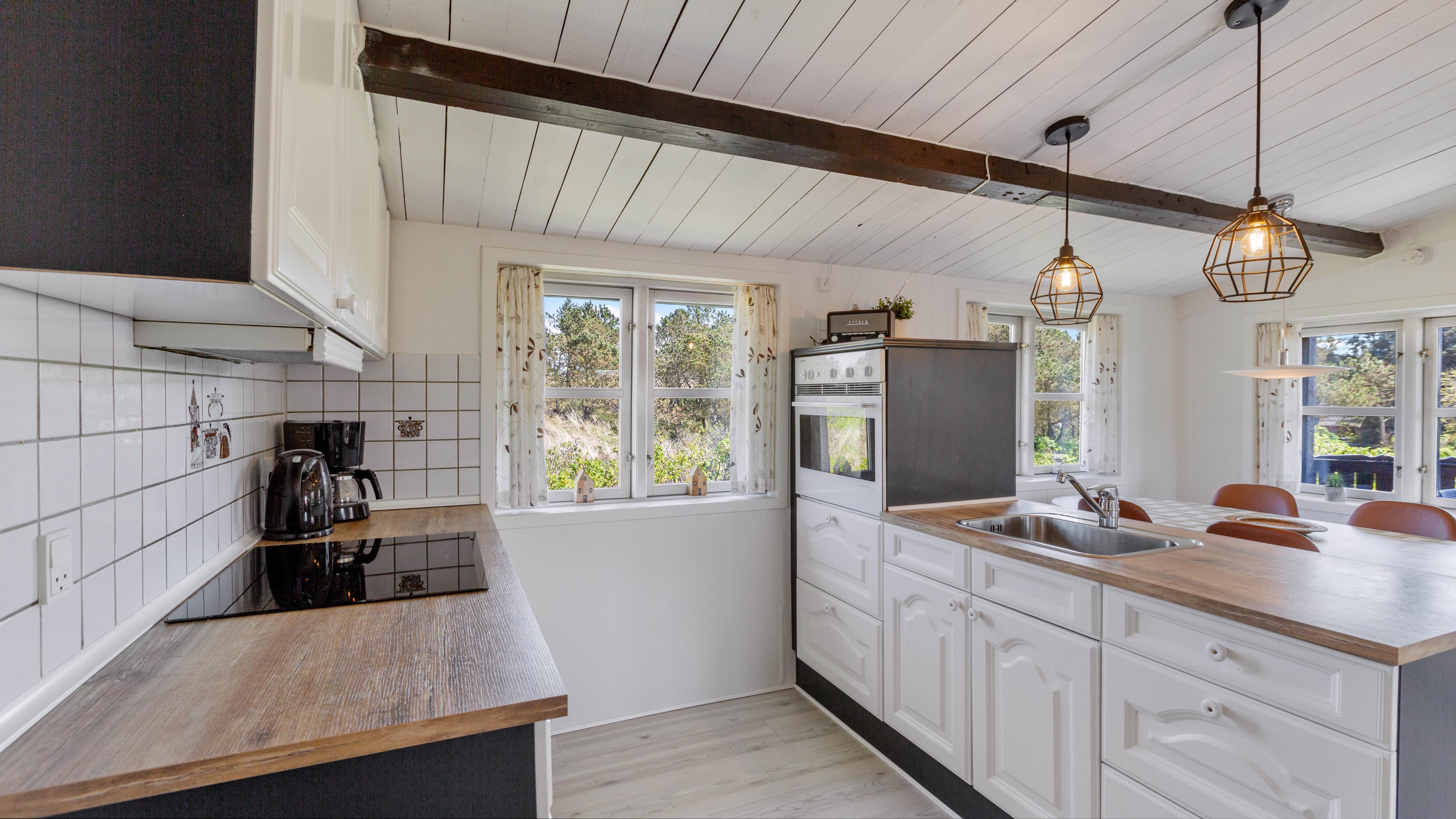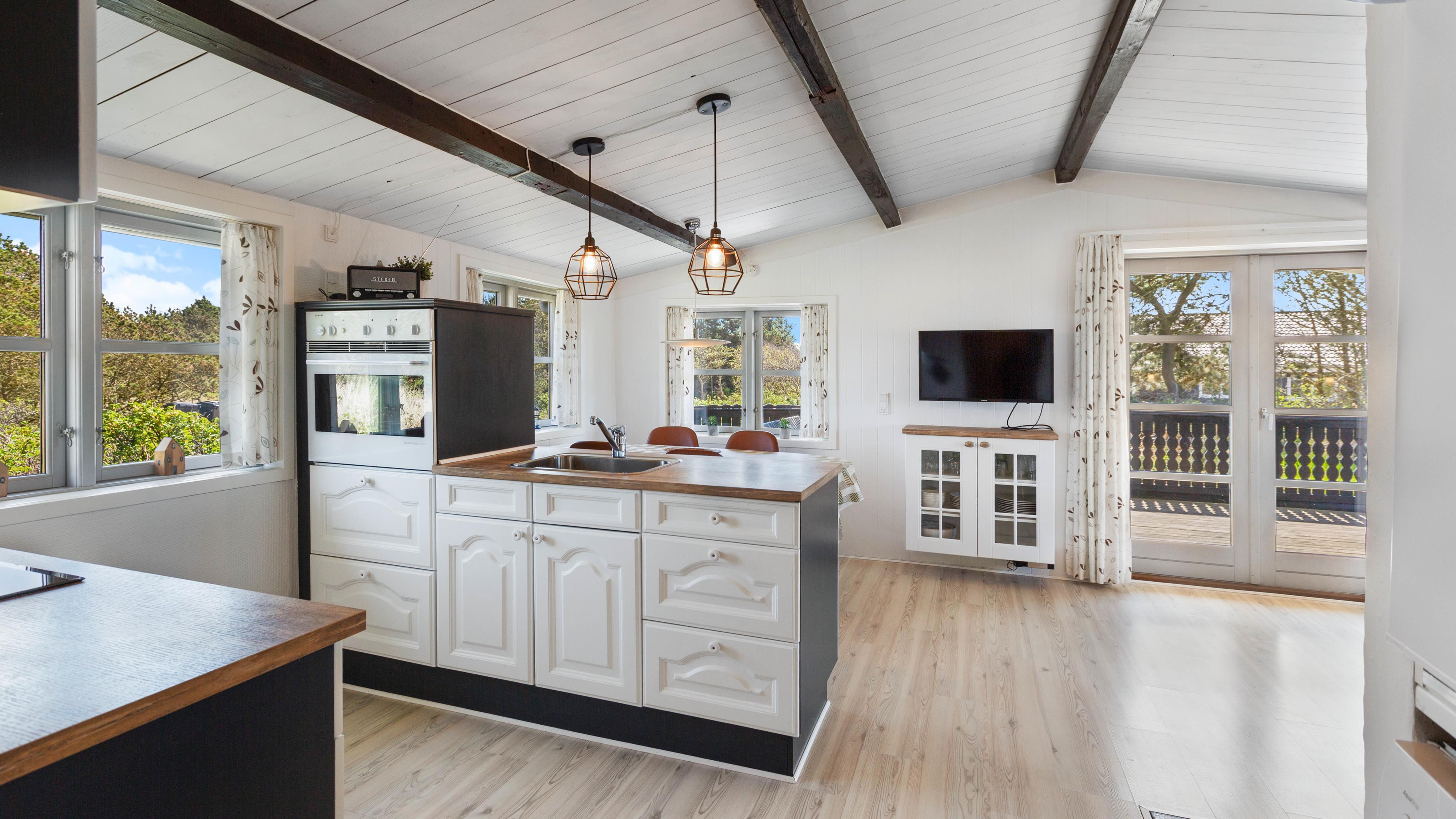 Sommerhuset er opført i klassisk sommerhusstil med træbeklædt facade og fritlagte loftsbjælker. Feriehuset er indrettet med komfortable møbler og i rolige farver – og her er god plads til jeres lille familie. Sommerhusets leverum, stue og køkken i åben forbindelse, gør det nemt at være sammen, selvom børnene spiller i stuen og du laver mad i det funktionelle køkken.