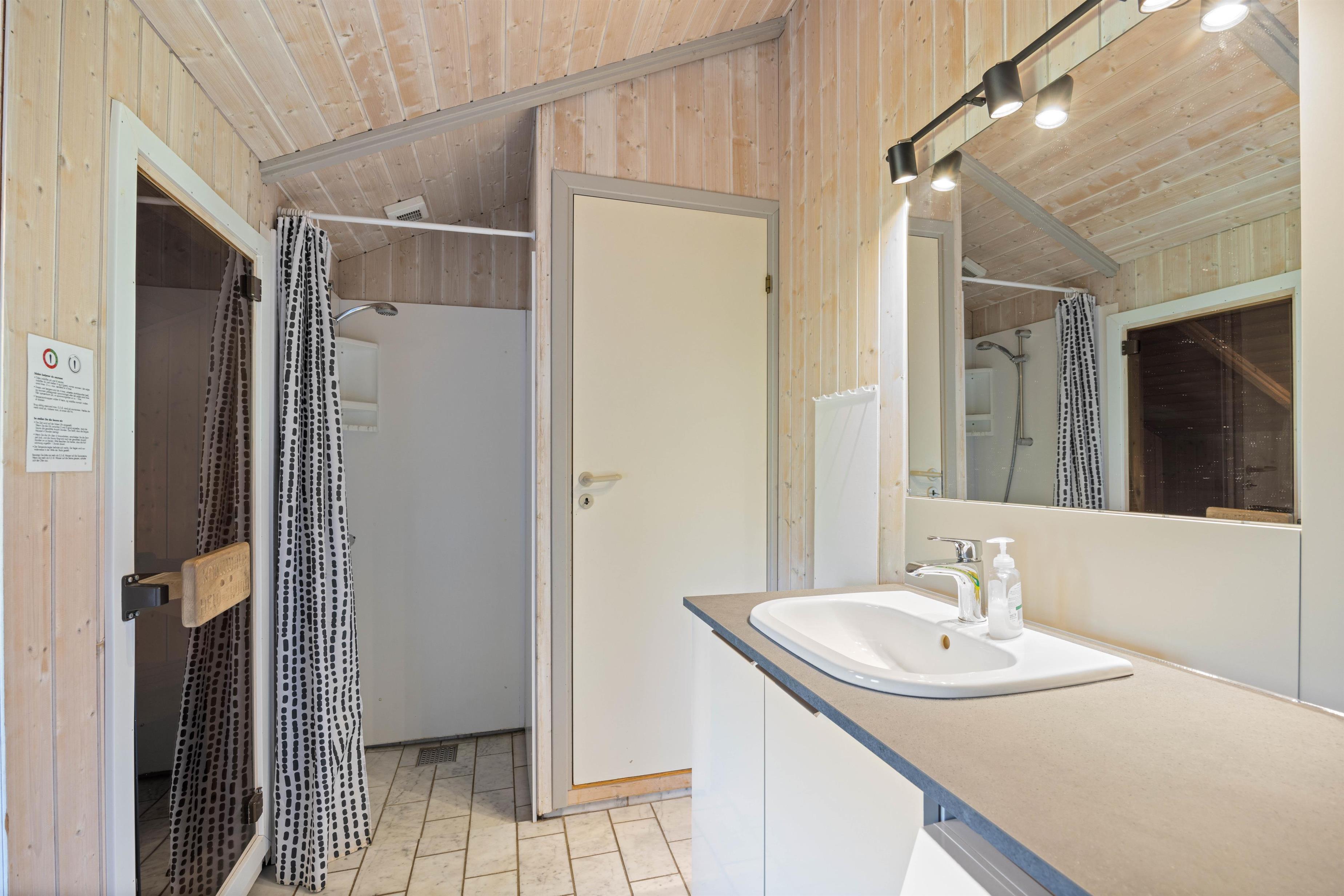 Sommerhuset har 1 badeværelse med gulvvarme samt 1 gæstetoilet, så der ikke bliver lang kø om morgenen. På badeværerelset er der lagt op til afslapning og velvære i det boblende spabad og den varme sauna. I sommerhuset finder I desuden en vaskemaskine, så I kan vaske lidt tøj eller håndklæder i løbet af ferien.