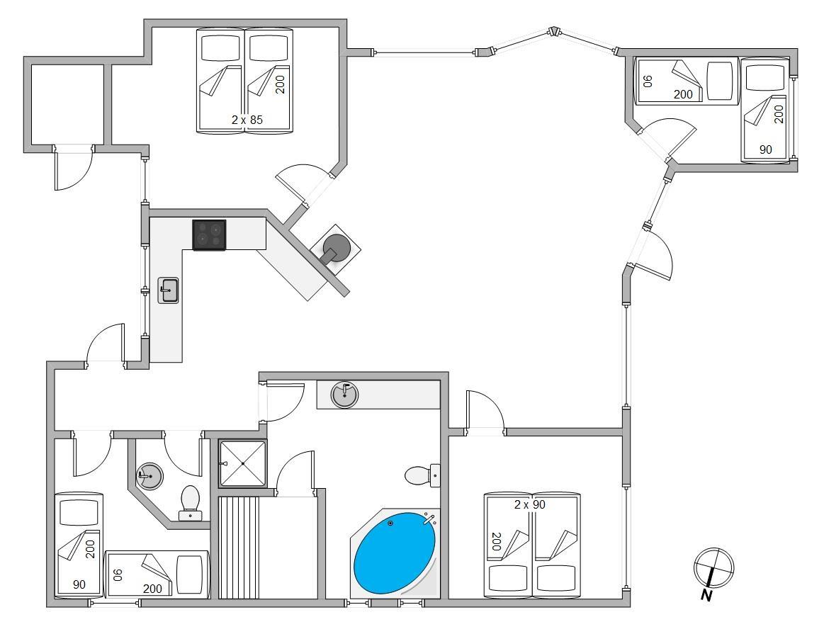 Sommerhuset er indrettet med højt til det træbeklædte loft og med et dejligt lysindfald, der skaber en dejlig atmosfære i feriehuset. Fra køkkenet har I overblik over både spise- og opholdsafdeling, hvor den rustikke brændeovn skaber hygge sammen med TV'et. 4 soverum – 2 med dobbeltsenge og 2 med enkeltsenge – giver plads til 8 personer, som kan få en god nats søvn og samle energi til morgendagens ferieaktiviteter.