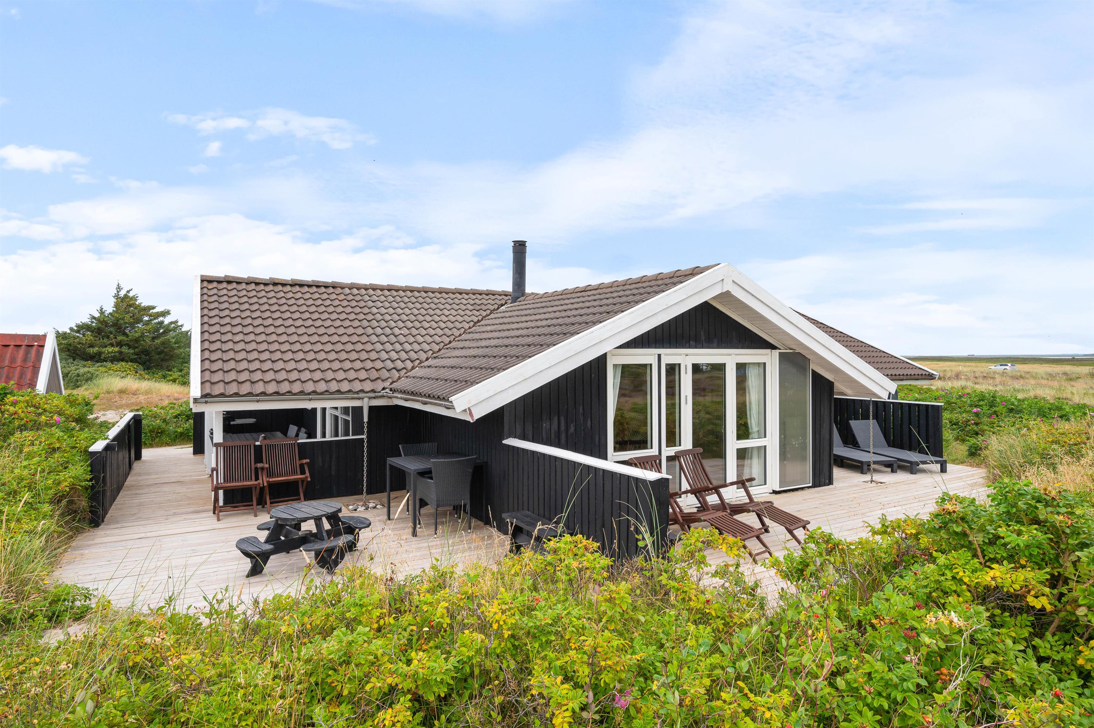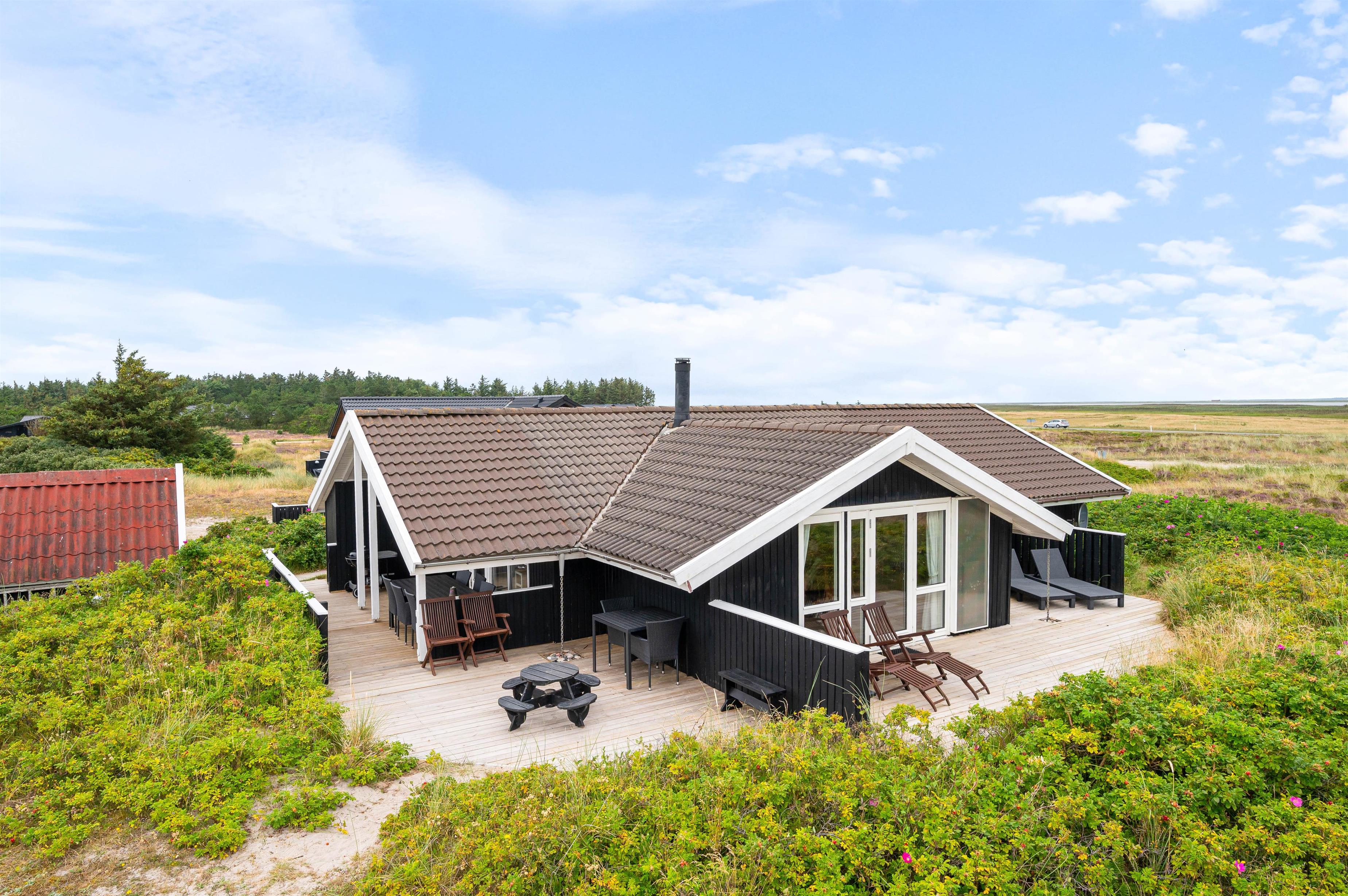På den brede træterrasse, som løber omkring feriehuset, kan I rykke rundt efter sol og vind. Tag solbad på liggestolene eller slap af i havemøblerne - Der er mange kroge, så I altid kan finde en god plet at opholde jer på. Tænd op i grillen til aften og nyd et lækkert grillmåltid sammen. Bagefter kan I nå en tur til Vesterhavet, hvor I kan betragte solnedgangen. En solnedgang i Vesterhavet er altid en oplevelse – uanset vejret.