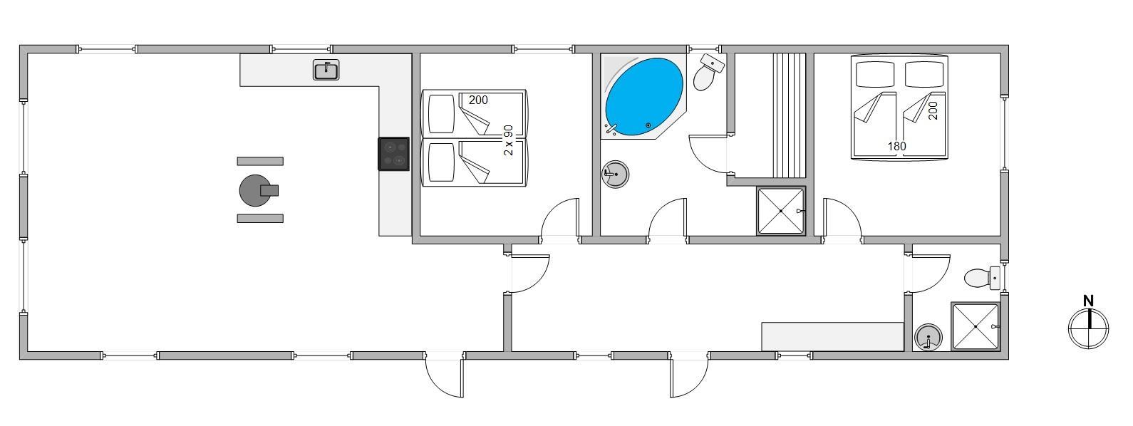 Når I træder ind i feriehuset, kommer I først ind i entréen – perfekt til sko og jakker. Her står også vaskemaskinen og tørretumbleren klar. Herfra er der adgang til de 2 soveværelser med komfortable dobbeltsenge (180x200), samt de 2 badeværelser med bruser og gulvvarme. På det største badeværelse finder I desuden en lille wellness-oase med både spabad og sauna – helt perfekt efter en lang dag på stranden.