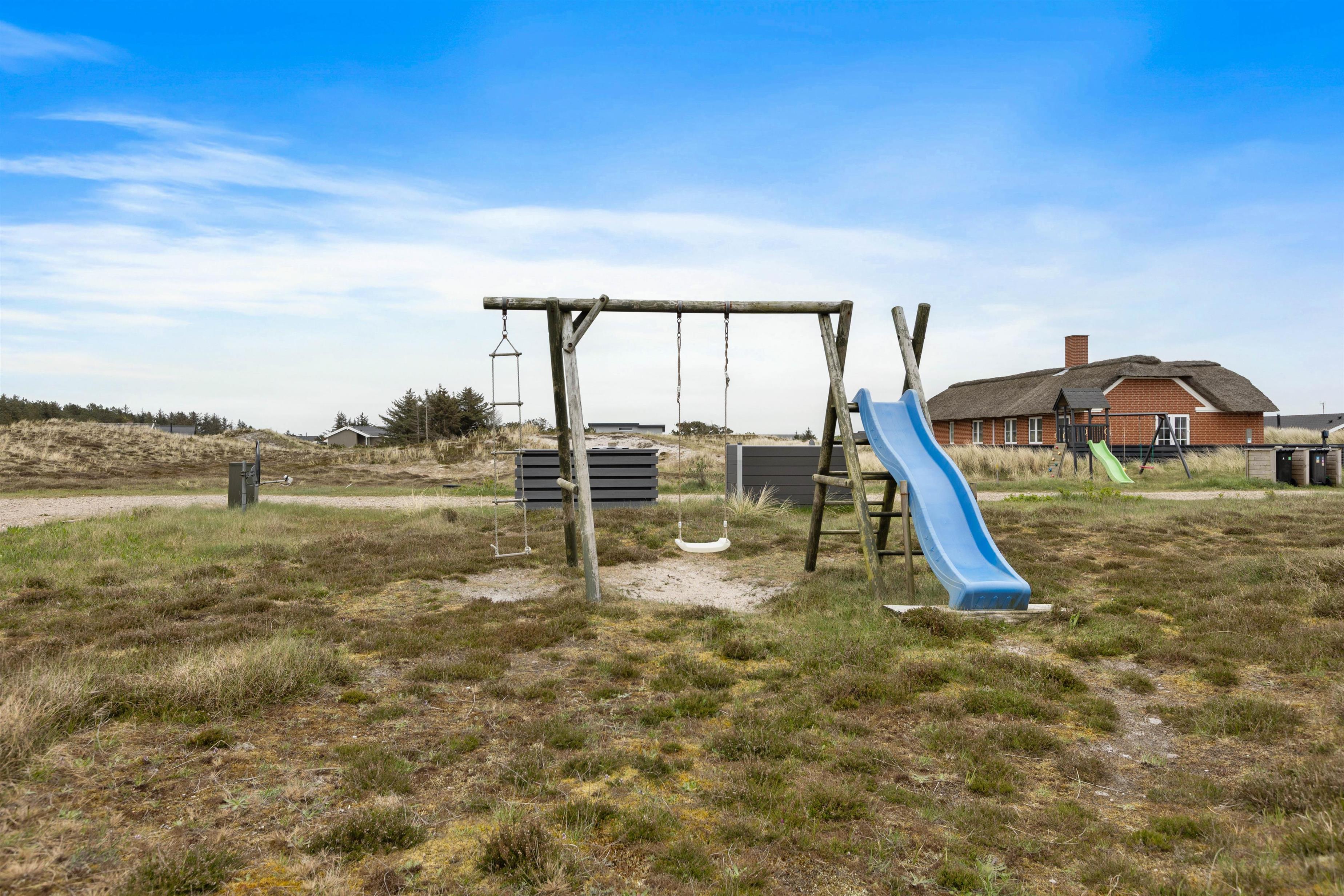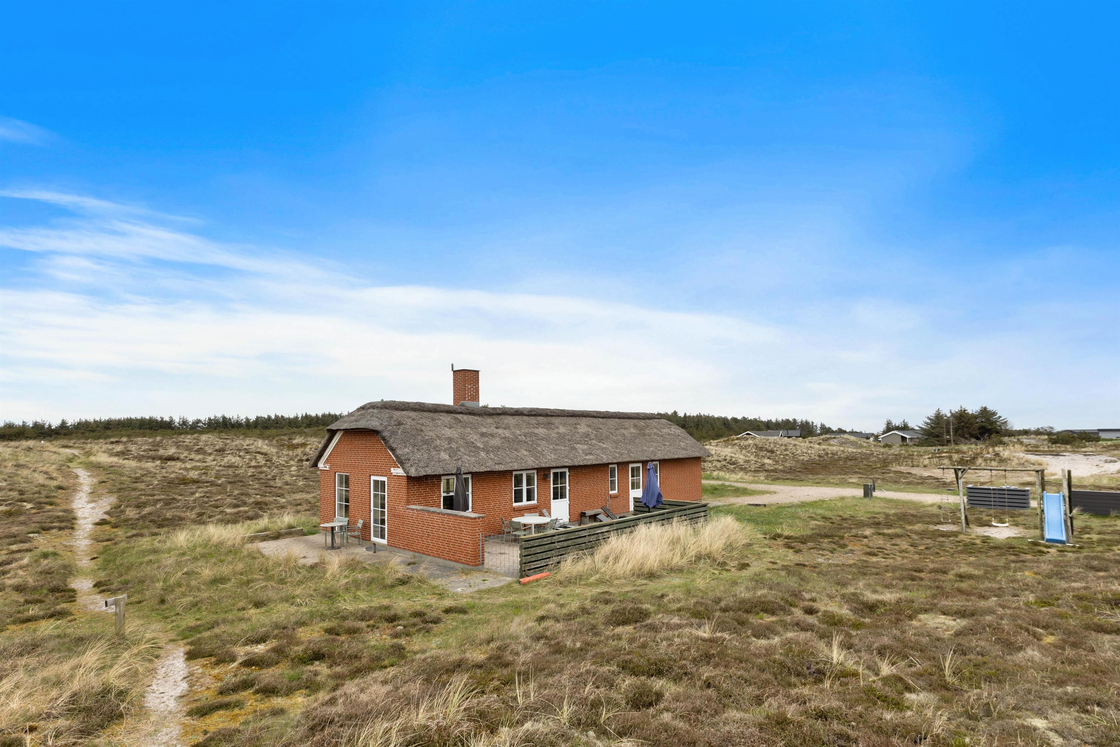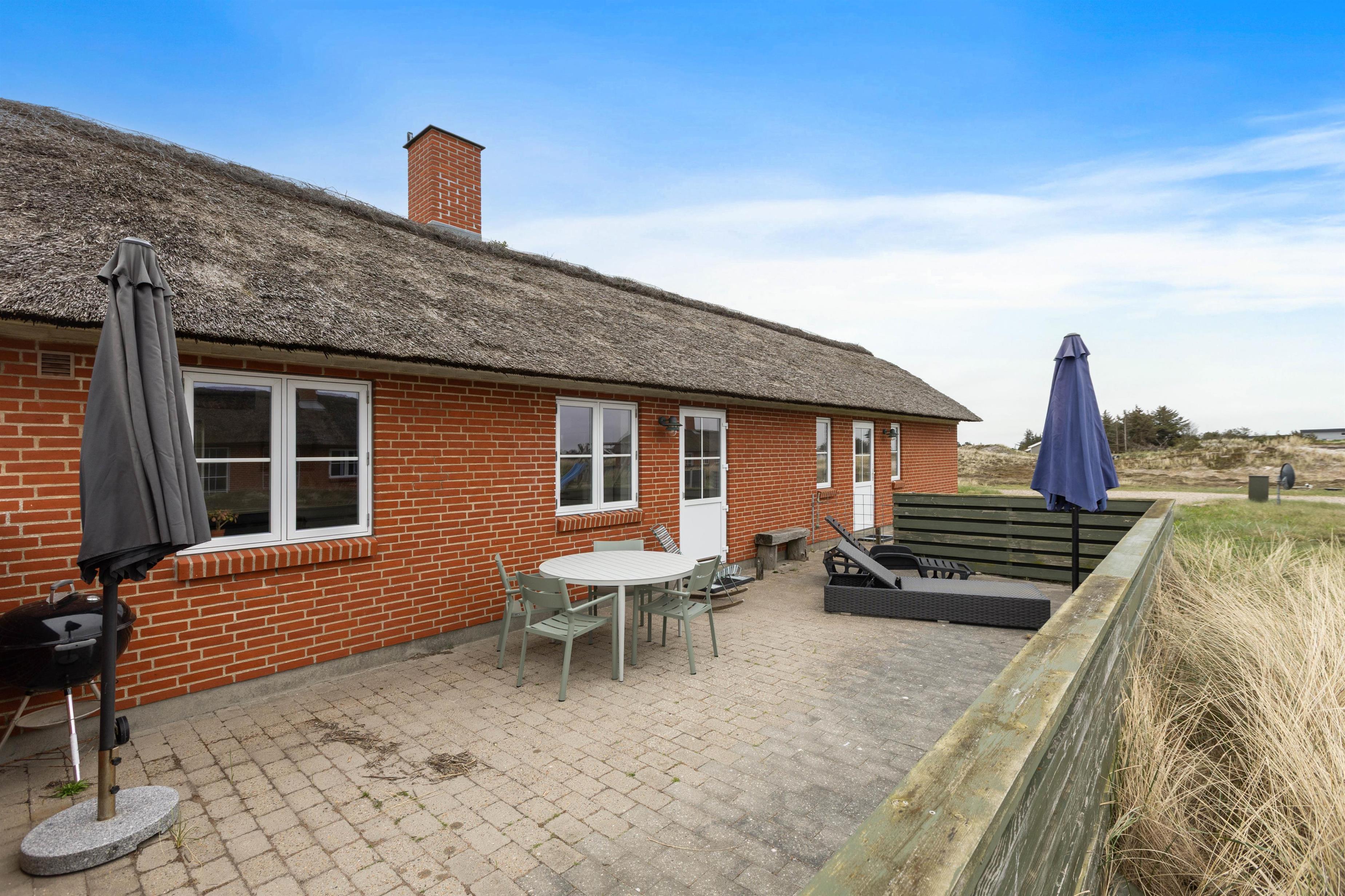 Fra stuen kommer I ud på den lukkede terrasse – perfekt, hvis hundene skal løbe frit, mens I slapper af på liggestolene og samtidig kan holde øje med børnene, der leger på gyngestativet eller prøver rutsjebanen. Den anden terrasse er åben og giver en flot udsigt over hede og klitter. Her kan I finde sol eller læ, alt efter vind og vejr, og om aftenen kan I tænde op til lækker grillmad.