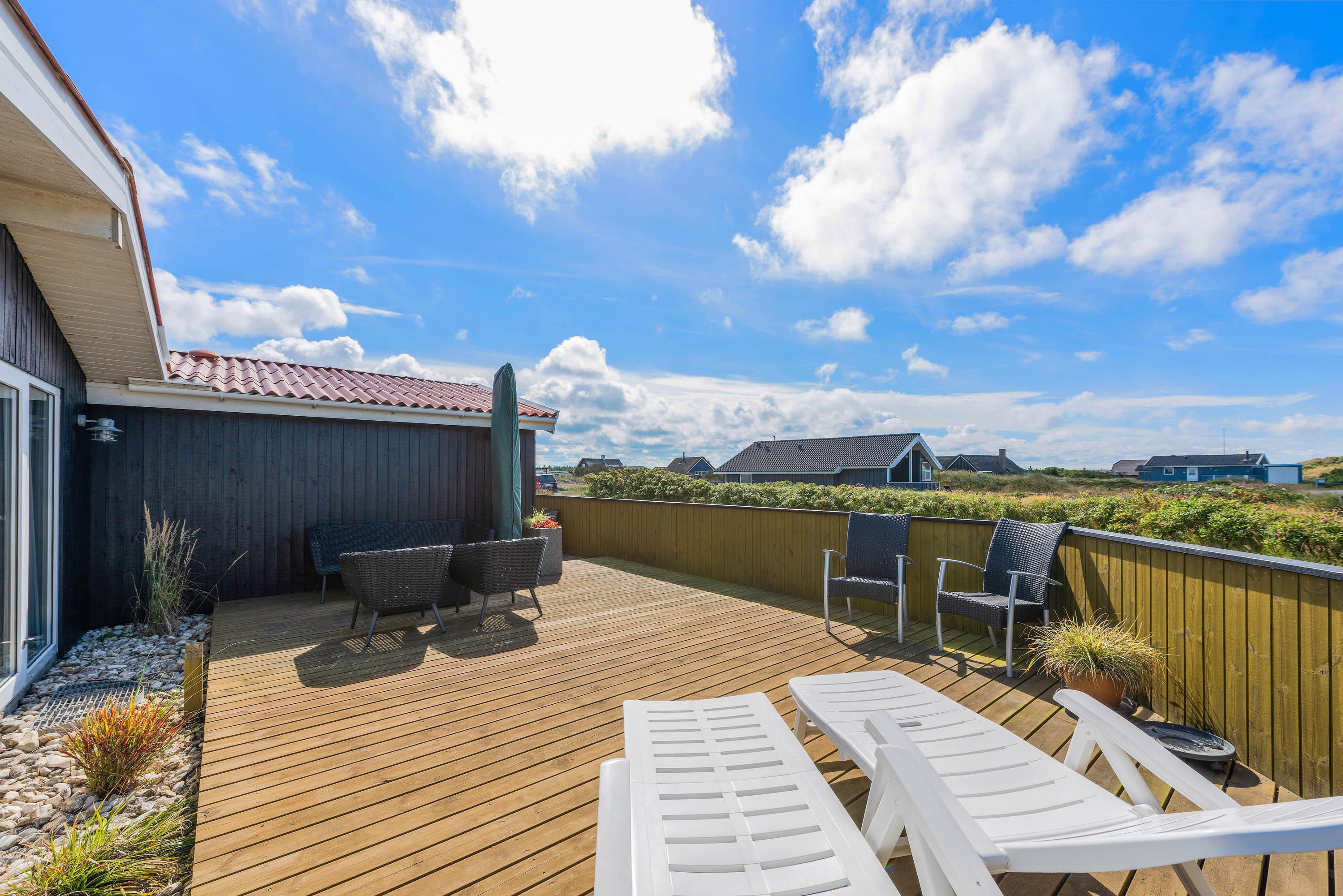 Mod syd finder I en stor terrasse, helt lukket og delvist overdækket og med læ-hjørner. Her kan I nyde eftermiddagssolen og den friske, salte havduft fra liggestolene, hele tiden med havets beroligende brusen i baggrunden. Nyd aftenen med en veltilberedt grillmiddag – måske friskfangede fisk - på terrassen mens I ser solen farve himlen orangerød og gå ned bag klitterne.