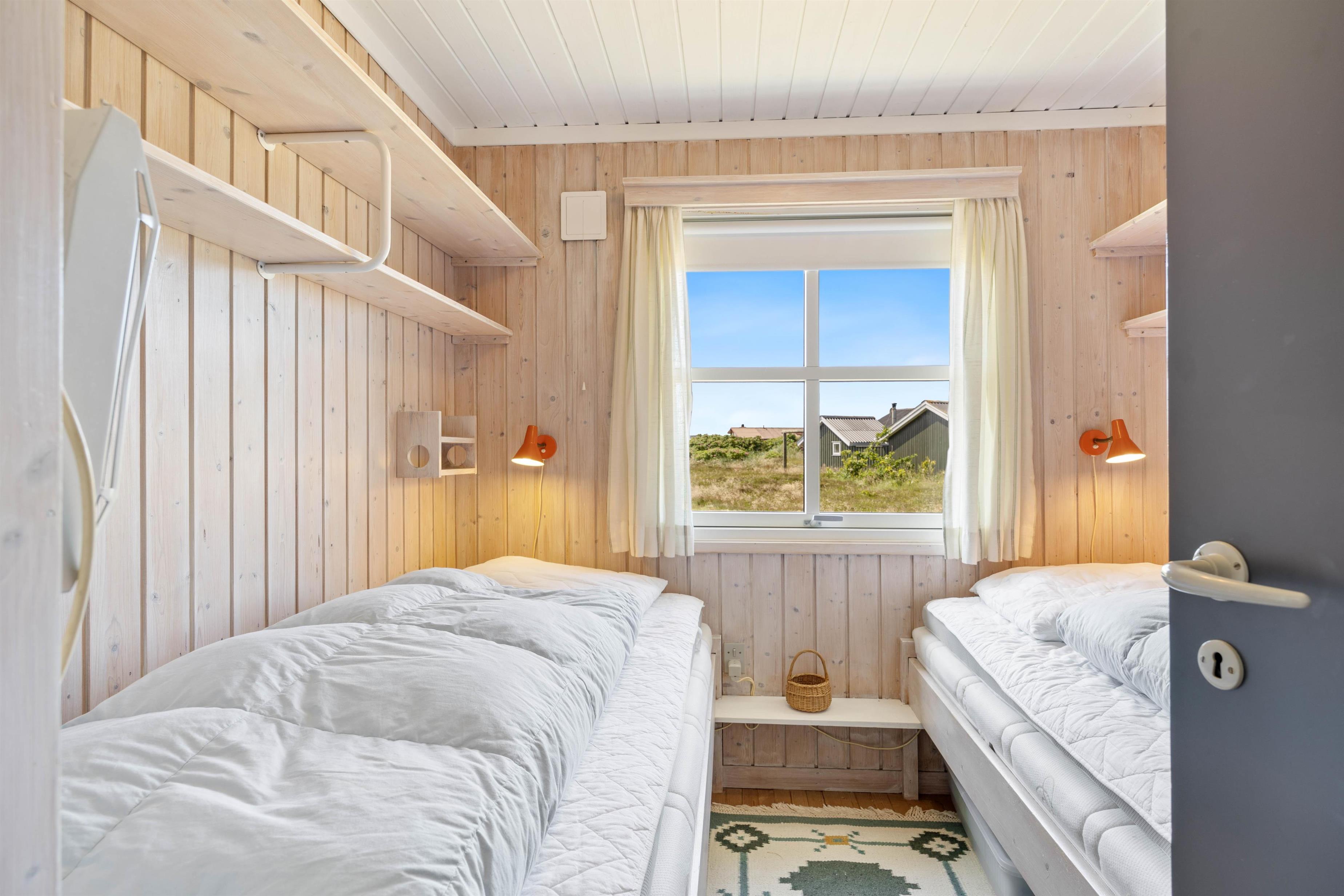 Det praktiske badeværelse med dagslys er udstyret med en bruser. Når feriedagen går på hæld, kan I trække jer tilbage til 2 rolige soveværelser. Det ene har en dobbeltseng og det andet 2 komfortable enkeltsenge. Læg mærke til, at vesterhavsluften gør noget godt for nattesøvnen.