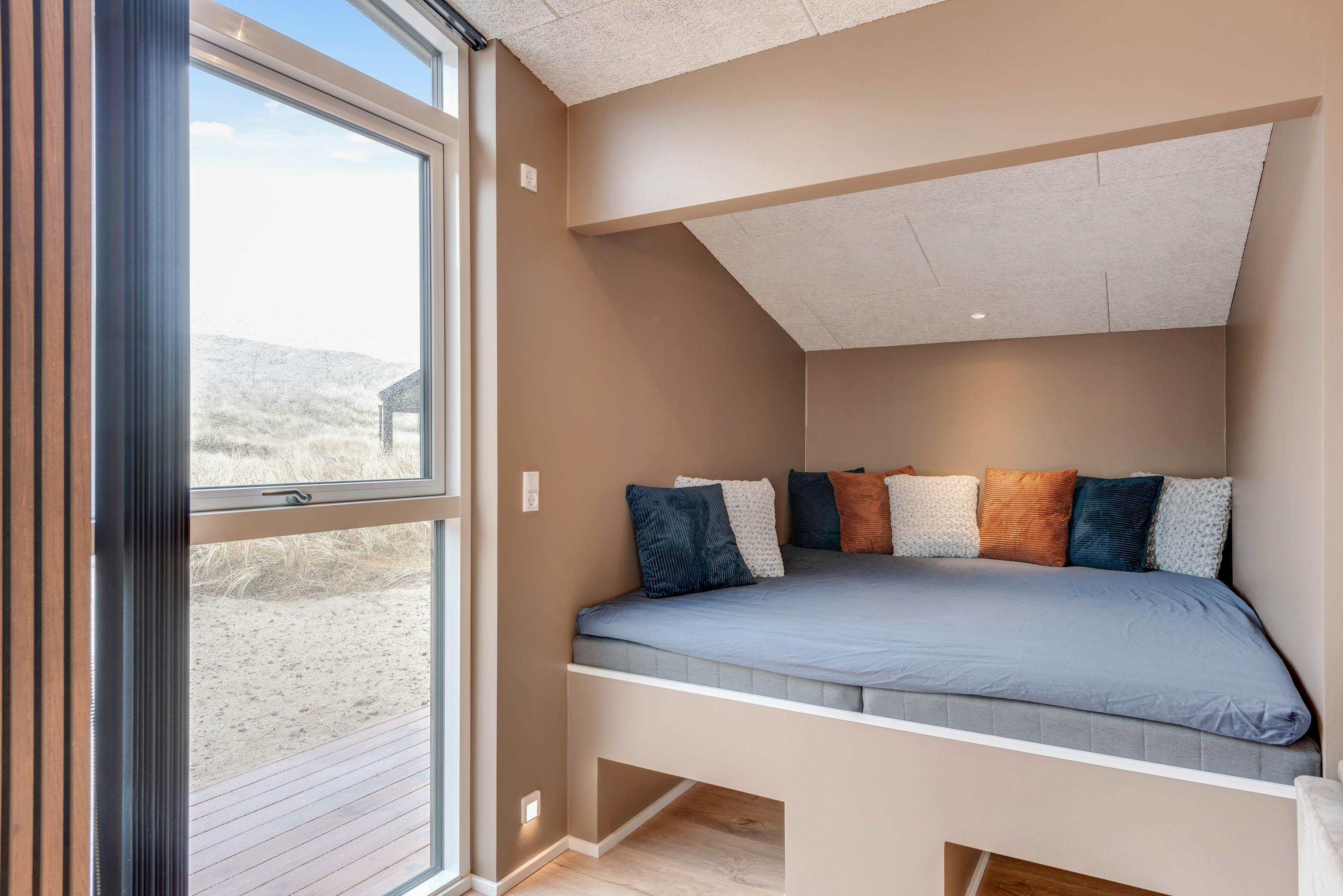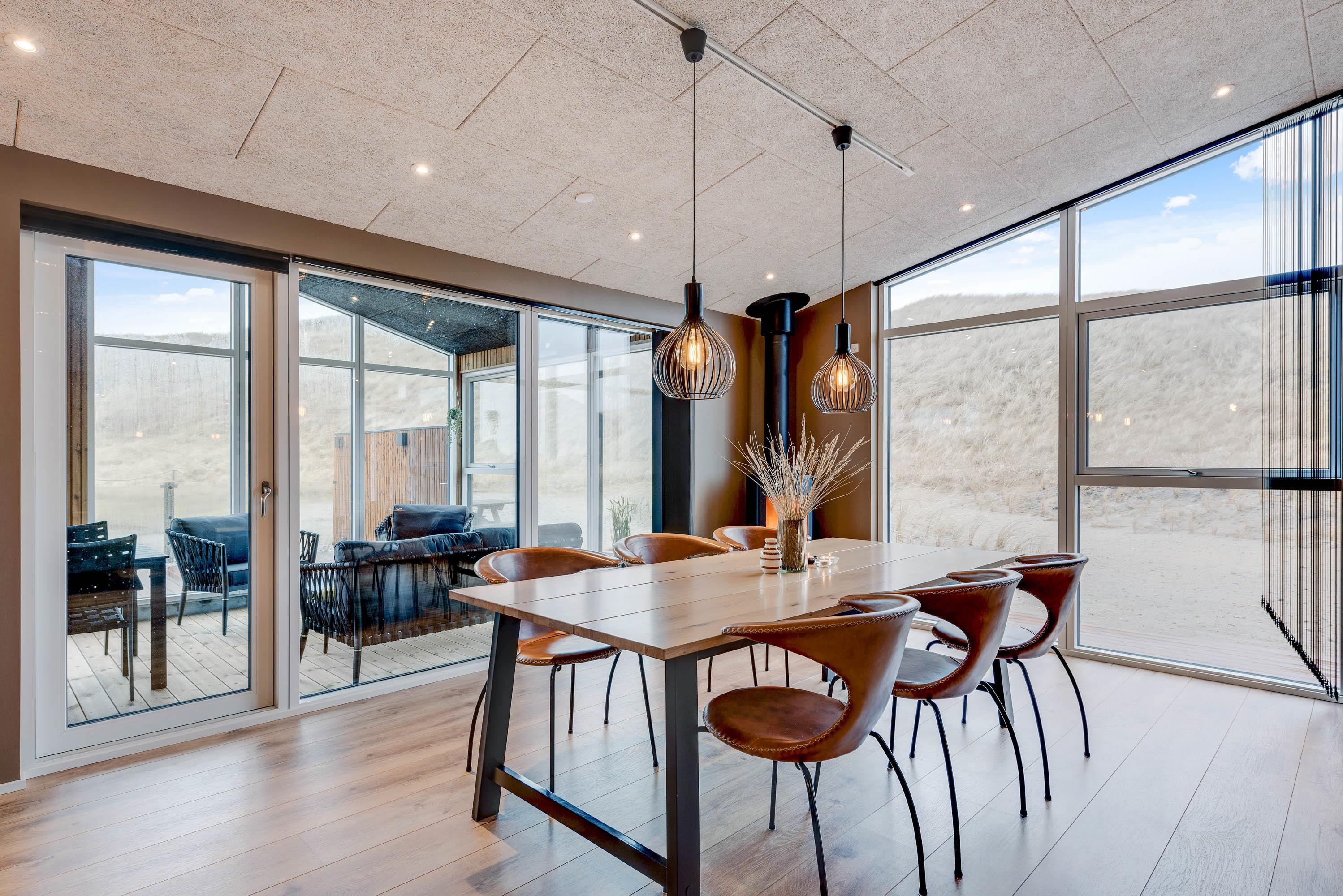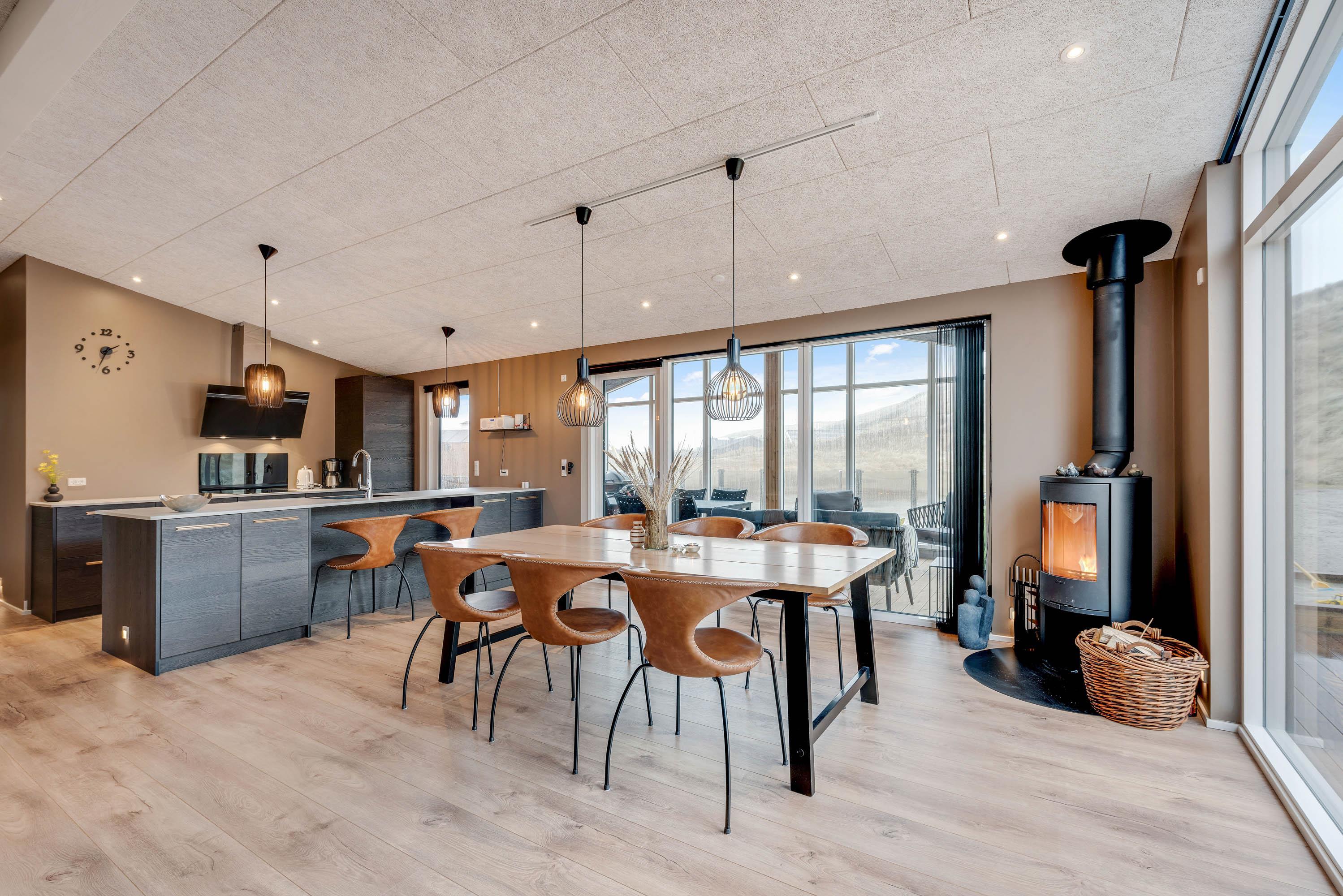 Det i 2021 byggede sommerhus er virkelig stilfuldt indrettet med gode kvalitetsmøbler, som I vil finde jer godt tilpas i under ferien. I alrummet, der kombinerer køkken, stue og spisestue, kan I samles til gode stunder omkring spisebordet eller i sofaerne foran tv'et. Brændeovnen, der står i alrummet, sætter prikken over i'et for sommerhusstemningen og bidrager med ekstra hygge.