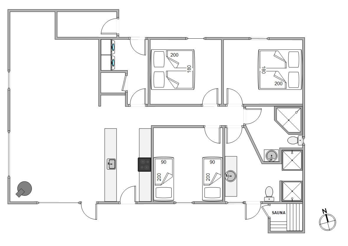 Sommerhuset er desuden indrettet med 3 soveværelser, der alle har dobbeltsenge, 2 badeværelser med gulvvarme samt en hyggelig alkove.