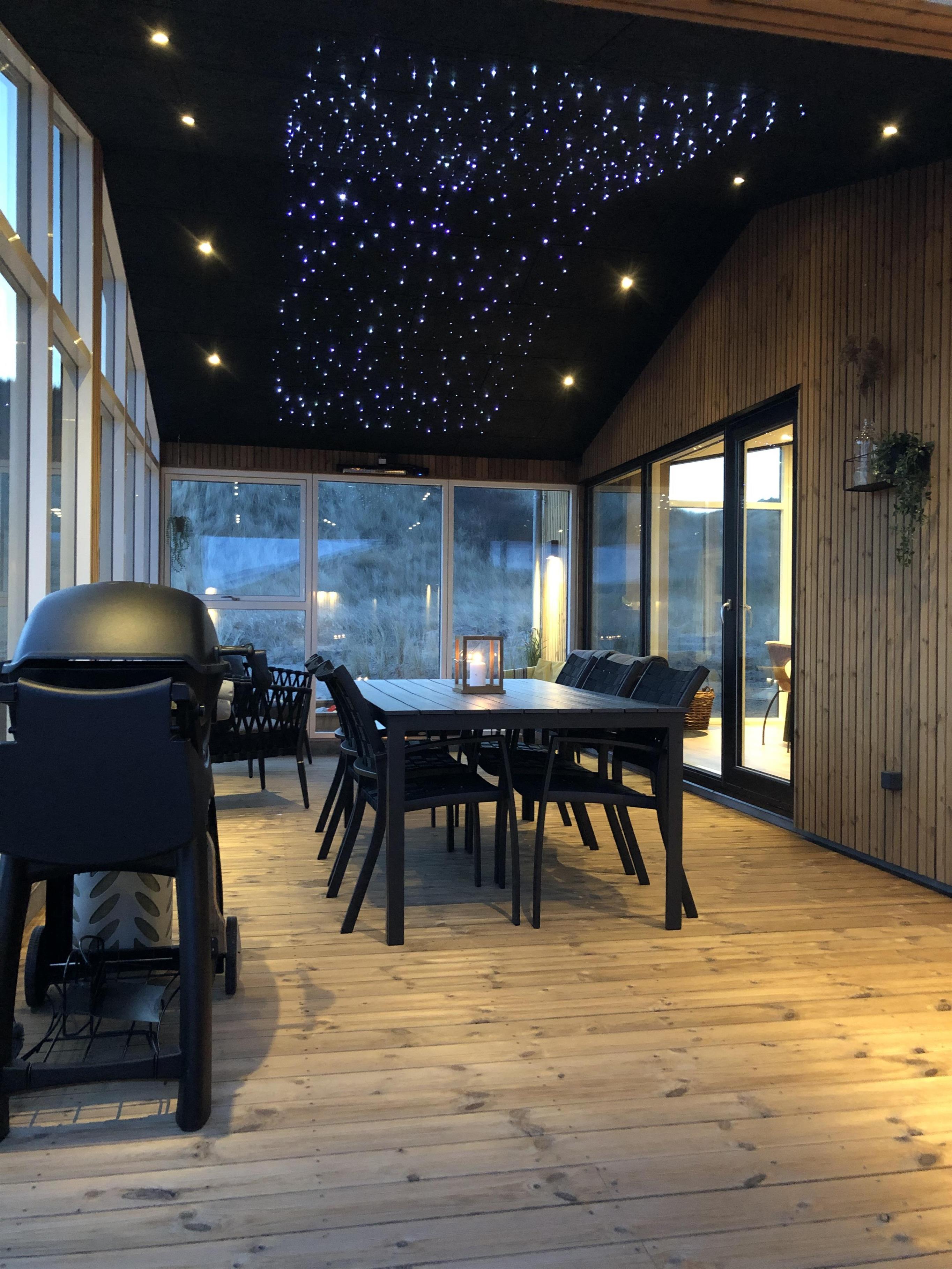 Når dagen går på hæld, kan I samles på terrassen og tænde op i grillen. Mens bøfferne steger på grillen, kan I finde de kølige drikkevarer frem, så I er klar til at afslutte dagen med manér. Under den overdækkede del af terrassen er der installeret en flot stjernehimmel, som gør ferieaftenerne ekstra magiske.