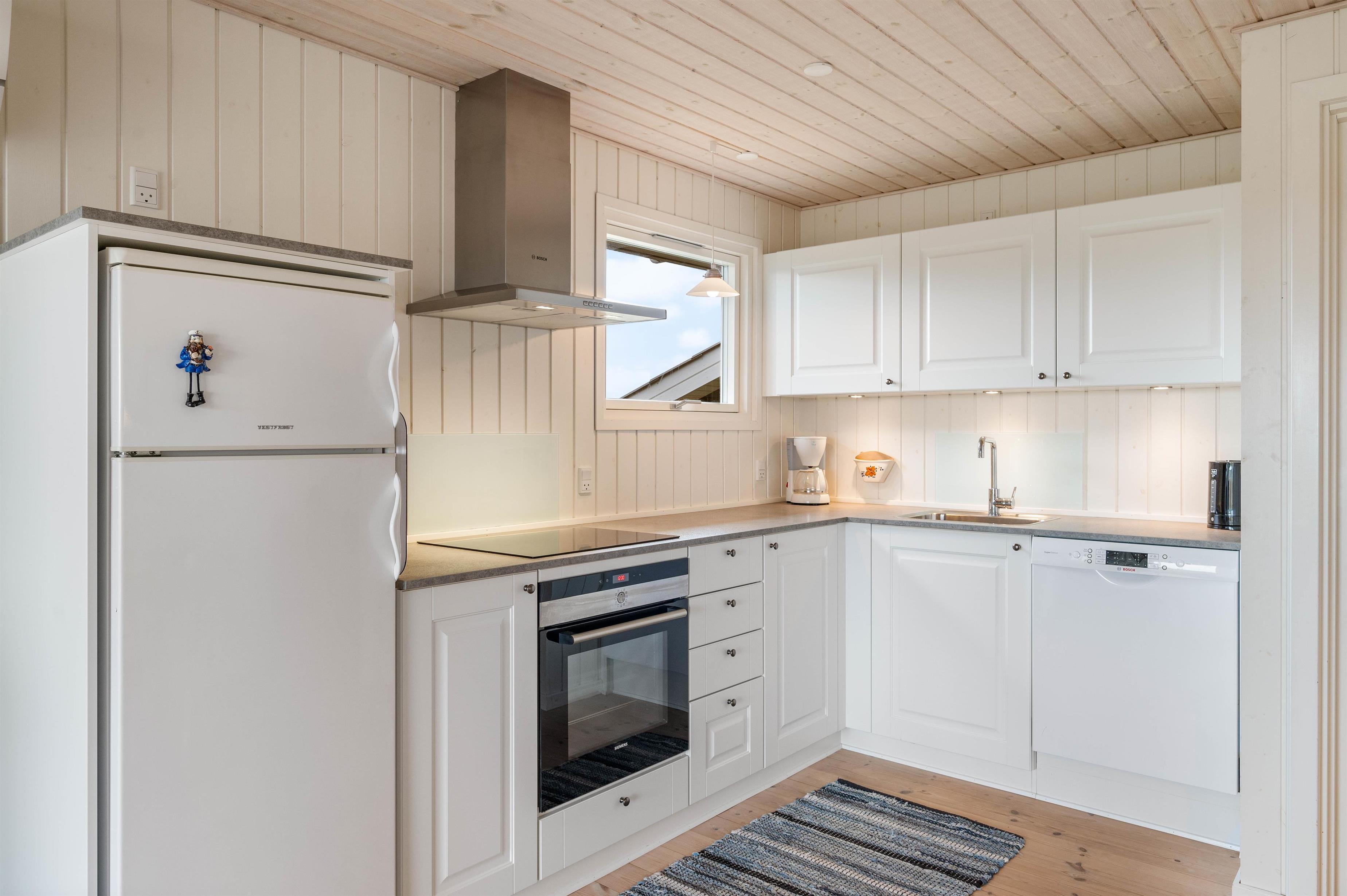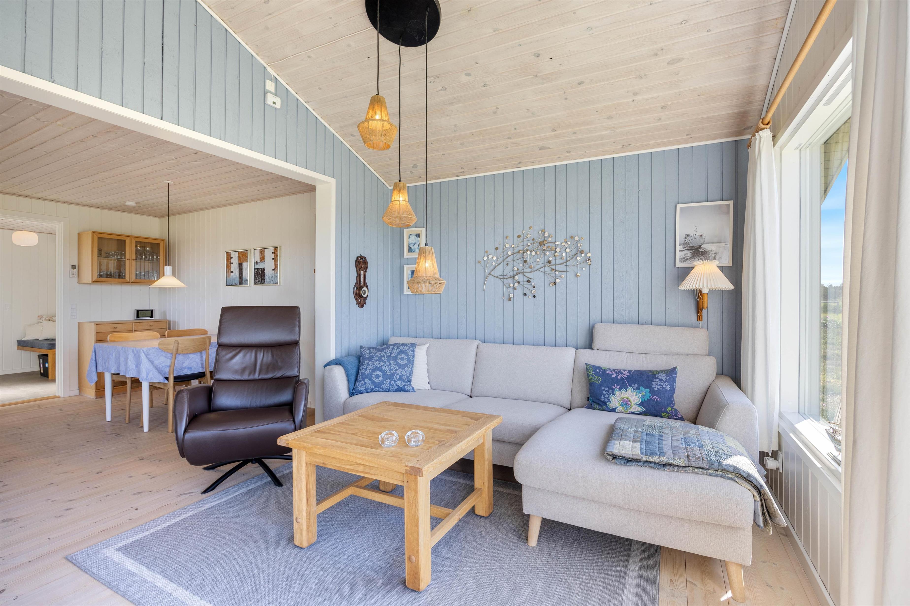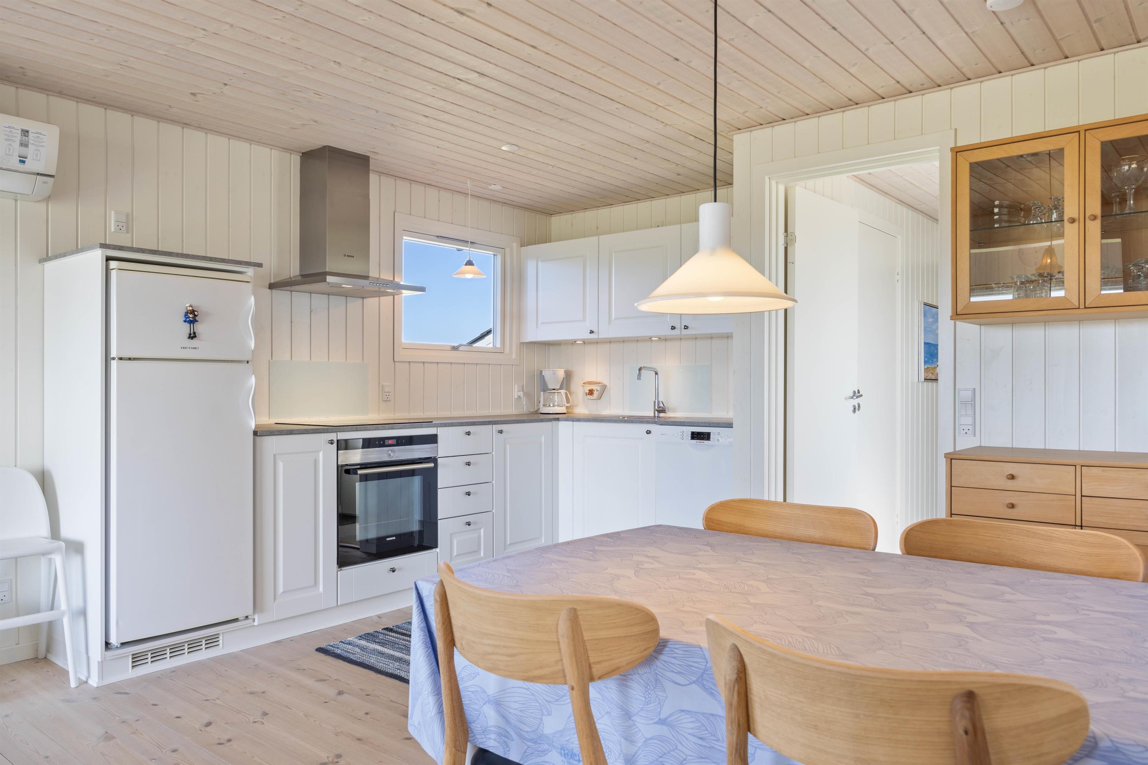 Sommerhuset er ældre, men løbende renoveret. Centrum i feriehuset er det hyggelige kombinerede køkken- og opholdsrum, hvor familien samles. I den funktionelle køkkenafdeling med blandt andet opvaskemaskine og mikroovn, er der ikke langt til spisebordet, hvor børnene kan hygge sig med spil, mens maden tilberedes. Fra køkkenafdelingen er der åbent ind til det hyggelige opholdsrum, hvor brændeovnen kan sørge for ekstra hygge og indbyde til total afslapning med en god bog og en kop kaffe.