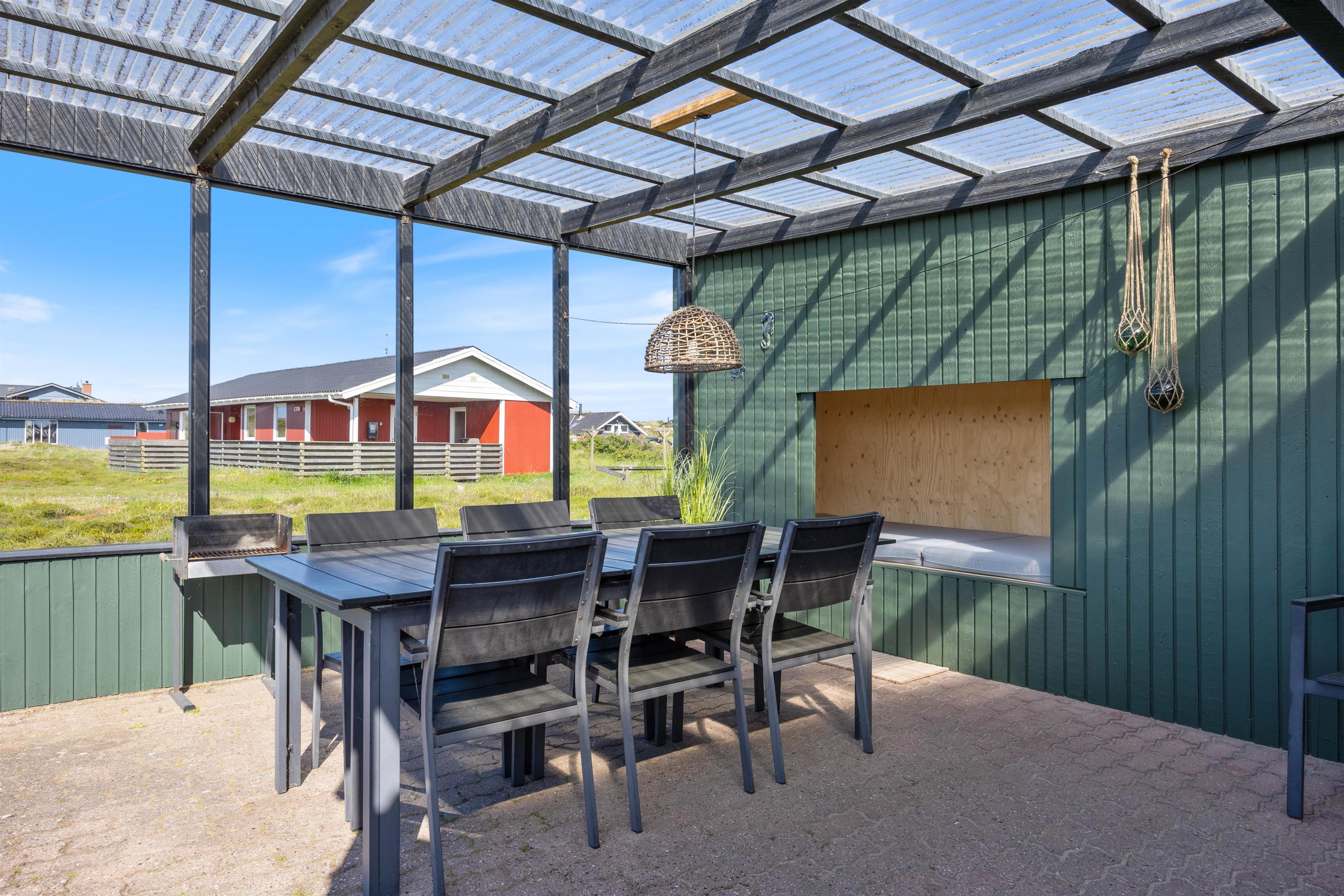 Mod syd, og op til det uberørte fredede hedeområde, er der en dejlig overdækket terrasse, med udgang fra stuen. Her kan man nyde naturen udenfor i næsten al slags vejr. Her er også en fin udendørs alkove, hvor I kan slappe af efter en oplevelsesrig feriedag.